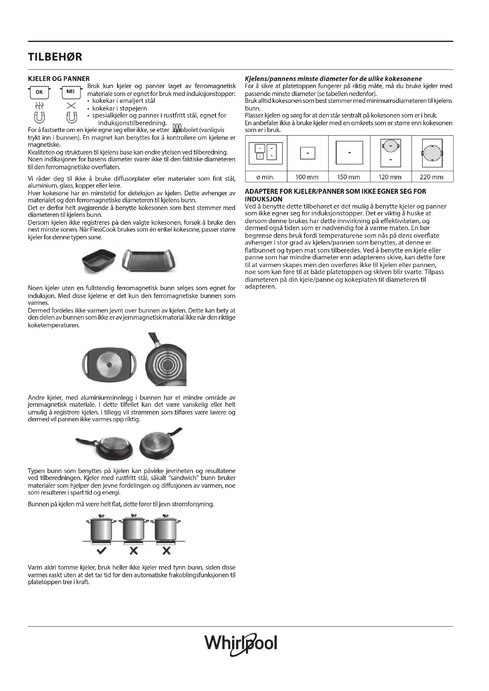 Last ned den fullstendige instruksjonshåndboken på http://docs.whirlpool.eu eller ring telefonnummeret som oppgis i garantiheftet. Les disse sikkerhetsinstruksene før du tar i bruk apparatet. Oppbevar de i nærheten for fremtidig referanse. Disse instruksjonene og selve apparatet formidler viktige sikkerhetsadvarsler som alltid må følges. Produsenten fraskriver seg ethvert ansvar for manglende overholdelse av disse sikkerhetsinstruksene, for uriktig bruk av apparatet eller uriktig innstilling av kontrollene. ADVARSEL: Dersom komfyrtoppens overate er sprukket, må du ikke bruke apparatet brukes - fare for elektrisk støt. ADVARSEL: Brannfare: Oppbevar ikke gjenstander på kokeatene. FORSIKTIG: Vær alltid tilstede ved matlagingen. Ved rask tilberedning må en alltid være tilstede. ADVARSEL: Steking uten tilsyn på komfyrtoppen kan være farlig - fare for brann. Du må ALDRI forsøke å slukke ilden med vann: i stedet må du slå av apparatet og dekke over ammene f.eks. med et lokk eller et brannteppe. Ikke bruk platetoppen som arbeidsbenk eller støtte. Hold klær eller andre brennbare materialer borte fra apparatet, inntil alle komponenter er fullstendig avkjølt - fare for brann. Metallgjenstander som f.eks. kniver, gaer, skjeer og lokk må ikke plasseres på platetoppen da de kan bli svært varme. Svært små barn (0-3år) må holdes unna apparatet. Små barn (3-8år) må holdes på sikker avstand fra apparatet med mindre de holdes under kontinuerlig oppsyn. Barn fra 8 år og oppover og personer med nedsatt sanseevne eller fysisk eller psykisk funksjonsevne, eller manglende erfaring og kunnskap kan kun bruke dette apparatet under tilsyn eller hvis de har fått opplæring i trygg bruk av apparatet og forstår farene det innebærer. Ikke la barn leke med maskinen. Barn må ikke foreta rengjørings- eller vedlikeholdsoppgaver uten tilsyn av voksne. Etter bruk må du slå av komfyrtoppen med bryteren og ikke stol på grytedetektoren. ADVARSEL: Apparatet og dets tilgjengelige deler kan bli varme ved bruk. Vær forsiktig så du ikke berører varmeelementene. Barn under 8 år må holdes unna hvis de ikke holdes under kontinuerlig oppsyn. TILLATT BRUK FORSIKTIG: Apparatet er ikke ment til å betjenes ved hjelp av en ekstern bryter, slik som et tidsur eller et separat ernkontrollsystem. Dette apparatet er beregnet for bruk i husholdninger og på lignende steder som for eksempel: selvbetjente kjøkken for butikkansatte, på kontorer eller på andre arbeidsplasser; gårder; av kunder på hotell, motell, bed & breakfast og andre overnattingssteder. Ingen annen bruk er tillatt (f.eks. oppvarming av rom). Dette apparatet er ikke for profesjonell bruk. Bruk ikke apparatet utendørs. INSTALLASJON Flytting og montering av produktet må utføres av to eller ere personer - fare for skade. Bruk vernehansker ved utpakking og installasjon - fare for kutt. Installasjon, inkludert tilkopling av vann (hvis dette er aktuelt), elektrisk tilkopling og reparasjoner må utføres av kvaliserte teknikere. Ikke reparer eller erstatt deler av apparatet med mindre det er tydelig spesisert i bruksanvisningen. Hold barn på sikker avstand fra installeringsområdet. Pakk ut apparatet og forsikre deg om at det ikke er blitt skadet under transporten. Hvis det oppstår problemer, kontakt forhandleren eller nærmeste Ettersalgsservice. Når maskinen er installert, må emballasjeavfall (plast, deler i styroskum osv.) oppbevares utilgjengelig for barn - fare for kvelning. Apparatet må alltid frakobles strømnettet før installasjonen - fare for elektrisk støt. Under monteringen må du påse at strømledningen ikke kommer i klem og blir skadet - fare for brann eller elektrisk støt. Apparatet må ikke settes på før installeringen er fullført. Utfør alt utskjæringsarbeid før du plasserer apparatet i innbyggingsmøbelet, og ern treiser og sagmugg. Dersom apparatet ikke er installert over en ovn, må et eget panel (følger ikke med) installeres i rommet under apparatet. ELEKTRISKE ADVARSLER Det må være mulig å koble apparatet fra strømforsyningen ved å trekke ut støpslet dersom støpselet er tilgjengelig, eller ved hjelp av en erpolet bryter montert ovenfor stikkontakten i henhold til regler for montering av ledninger og apparatet må jordes i samsvar med de nasjonale elektriske sikkerhetsstandardene. NOIkke bruk skjøteledninger, multi-stikkontakter eller adaptere. De elektriske komponentene må ikke være tilgjengelige etter installasjonen. Bruk ikke apparatet når du er våt eller barføtt. Bruk ikke maskinen hvis strømledningen eller støpselet er skadet, hvis det ikke fungerer som det skal, eller dersom det er skadet eller har falt ned. Hvis strømledningen er skadet, må den erstattes med en ny av produsenten, serviceavdelingen eller tilsvarende kvaliserte personer for å unngå farlige situasjoner - fare for elektrisk støt.