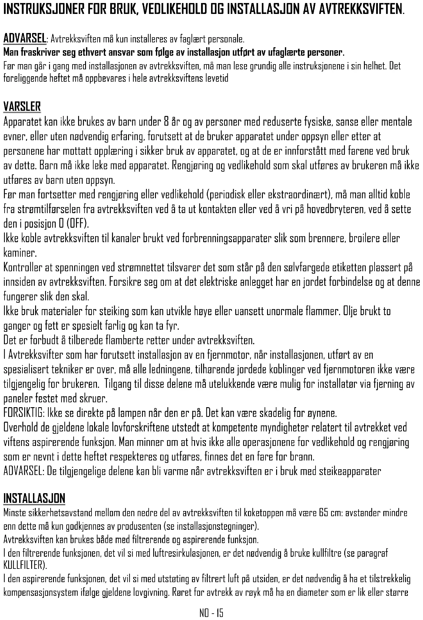 Før man utfører ethvert inngrep av rengjøring eller vedlikehold av avtrekksviften må man sette hovedbryteren i posisjon 0 (OFF). Utskiftning lyspærer Spotlight led: Utskiftningen av led spotlight må kun utføres av kvalifiserte teknikere ved og kun bruke originale reservedeler. Rengjøring av metalliske filtre De metalliske filtrene som følger med avtrekksviften må vaskes hver 2-3 måned, avhengig av bruksintensiteten, med varmt vann og ikke-aggressivt flytende oppvaskmiddel. De metalliske filtrene må tas av ved å bruke håndtaket ved og hekte av filteret først ved den nedre delen og så dra den oppover (fig. 5). Etter vasking av filtrene må disse tørkes fullstendig og monteres på riktig måte. Kullfilter Hvis avtrekksviften er utstyrt med et filtrerende system med intern resirkulasjon, er det nødvendig å bruke kullfilter som er beholdere for aktivt kull. Det aktive kullet som finnes i filteret brukes til å holde på røyklukt fra matlagingen. For fjerning og utskiftning av filtrene, må man se fig.6. Kullfiltrene POLYESTER kan ikke regenereres eller vaskes og må skiftes periodisk ut (hver 4. måned hvis man bruker avtrekksviften i to timer pr. dag). Filtre som er fulle av fett kan være årsaken til branntilløp. Avhengig av avtrekksviftemodellen, kan kullfiltrene enten være runde eller firkantede. Kullfiltrene LONG LIFE må periodisk vaskes og regenereres. Filteret må rengjøres hver andre måned hvis det brukes på normal måte. Det er best å vaske filteret i oppvaskmaskin på maksimal temperatur med normalt oppvaskmiddel. Filteret må vaskes alene for å unngå at matpartikler kommer inn i det, noe som deretter forårsaker vond lukt. For å aktivere kullfilteret på nytt, må filteret tørkes i ovn. Velg over / undervarme på maksimalt 100 °C og tørk filteret i 10 minutter. Filteret må skiftes ut når det ikke lenger er i stand til å absorbere matlukten på en tilstrekkelig måte. Fig.7 Rengjøring av avtrekksviften Periodisk rengjøring av overflaten hindrer at man senere må fjerne vanskelige skorper av skitt. Hvis avtrekksviften er lakkert eller kobberfarget, må man bruke en myk klut med lunkent vann og et nøytralt vaskemiddel. Det er forbudt å helle væske direkte på avtrekksviften og bruk av kornete og/eller slipende produkter. Hvis avtrekksviften er i rustfritt stål, må man bruke spesifikke produkter og kluter for satinert rustfritt stål (ikke slipende og/eller etsende og frie for klor), mens man er nøye med å stryke kluten i satinmatteringens retning. Ikke bruk aggressive produkter, kjemiske løsemidler eller produkter laget av destillert petroleum som kan etterlate oljerester som kan oksidere og polymerisere. Kondensering i avtrekksviften Induksjonsplatene eller platene i glasskeramikk varmer opp maten meget rask og generer damp fra matlagingen før overflaten i glass eller stål ved avtrekksviften har varmet seg opp. Dette skaper kondensering på avtrekksviften med påfølgende drypping. En annen årsak til kondensering kan være at avtrekksrøret for dampen ikke er i den størrelsen som er anbefalt av oss (se paragrafen INSTALLASJON). Dampen som forblir inne i avtrekksviften under avkjøling kondenserer og drypper. Man anbefaler å skru på avtrekksviften ti minutter før man starter matlagingen og når man er ferdig, la avtrekksviften stå på slik at all damp som har samlet seg i kanalen kan slippes ut. I tillegg er det meget viktig å se til regelmessig rengjøring av filtrene og, i tilfelle forringelse, skifte dem ut (se RENGJØRING AV MELLISKE FILTERE). Produsenten har ikke ansvar for estetiske skader grunnet manglende overholdelse av indikasjonene ovenfor.IT - 19 ISTRUZIONI PER L’USO, MANUTENZIONE E INSTALLAZIONE DELLA CAPPA. ATTENZIONE: La cappa deve essere installata unicamente da personale abilitato. Si declina ogni responsabilità in merito ad installazioni eseguite da persone prive di abilitazione. Prima di procedere con l'installazione della cappa, leggere attentamente ed integralmente queste istruzioni. Il pre- sente libretto deve essere conservato per tutta la vita della cappa. AVVERTENZE L’apparecchio può essere utilizzato da bambini di età non inferiore a 8 anni e da persone con ridotte capa- cità fisiche, sensoriali o mentali, o prive di esperienza o della necessaria conoscenza, purché sotto sorve- glianza oppure dopo che le stesse abbiano ricevuto istruzioni relative all’uso sicuro dell’apparecchio e alla comprensione dei pericoli ad esso inerenti. I bambini non devono giocare con l’apparecchio. La pulizia e la manutenzione destinata ad essere effettuata dall’utilizzatore non deve essere effettuata da bambini senza sorveglianza. Prima di procedere alla pulizia o alla manutenzione (periodica o straordinaria) togliere sempre l'alimenta- zione elettrica alla cappa staccando la spina o agendo sull'interruttore generale portandolo in posizione 0 (OFF). Non collegare la cappa a condotti utilizzati per apparecchi a combustione come bruciatori, caldaie o cami- netti. Verificare che la tensione della rete corrisponda a quanto previsto sull'etichetta argentata posta all'inter- no della cappa. Accertarsi che l'impianto elettrico sia realizzato con lo scarico a terra e che lo stesso sia efficiente. Non utilizzare per la cottura materiali che possono sviluppare fiamme alte o comunque anomale. L'olio usato due volte e grassi sono particolarmente pericolosi e potrebbero infiammarsi. E' vietato preparare alimenti flambè sotto la cappa. Nelle Cappe previste per l'installazione di un motore remoto, terminata l'installazione, da parte di un tecni- co specializzato, tutti i cavi, connettori, i collegamenti correlati di messa a terra, del motore remoto, devo- no risultare non accessibili all'utilizzatore. L'accesso ad essi deve essere possibili esclusivamente all'in- stallatore tramite la rimozione di pannelli fissati con viti. PRUDENZA: non fissare la lampada in funzione. Può essere dannoso per gli occhi. Rispettare le norme