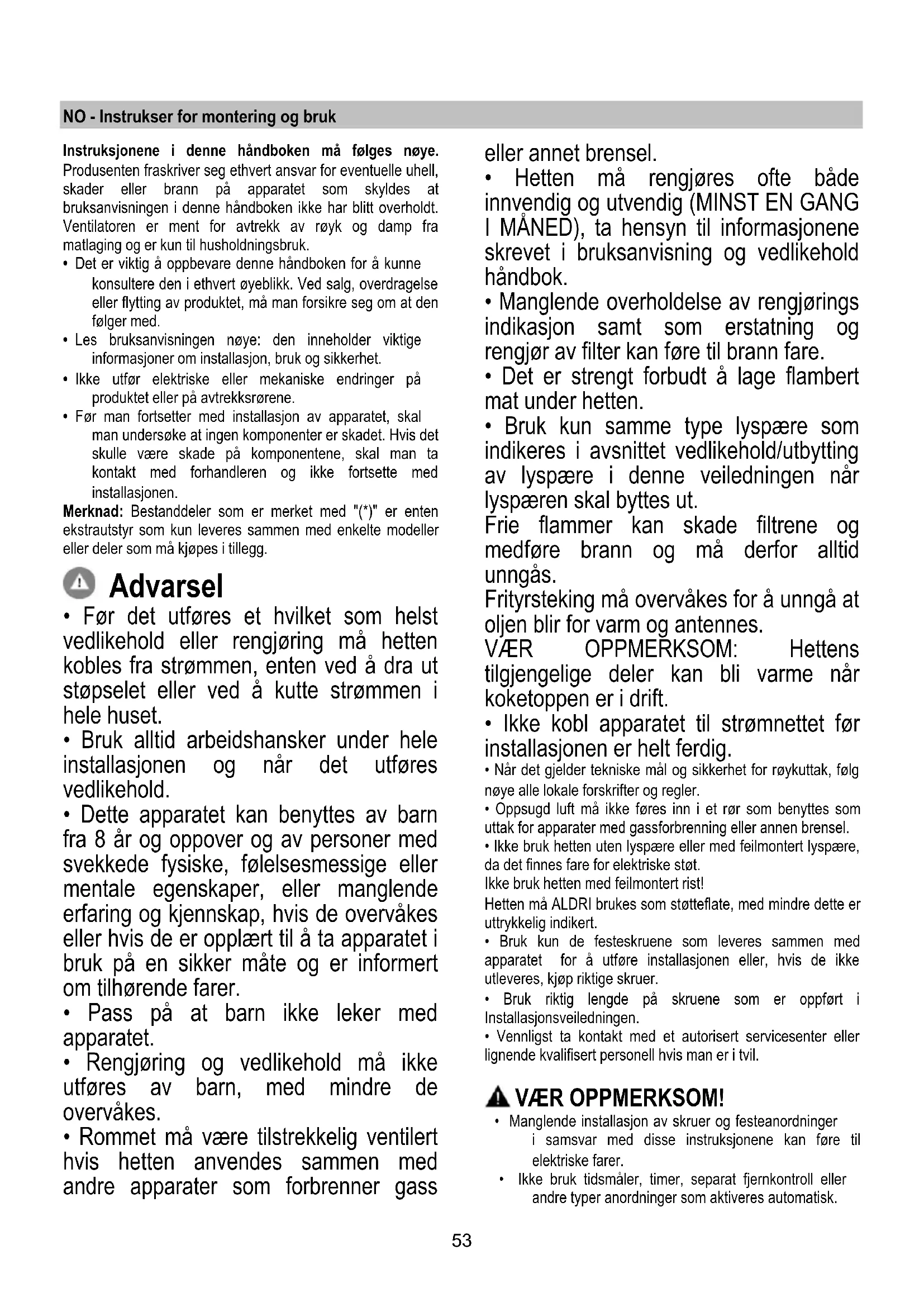 - Rommet må være tilstrekkelig ventilert hvis hetten anvendes sammen med andre apparater som forbrenner gass eller annet brensel.