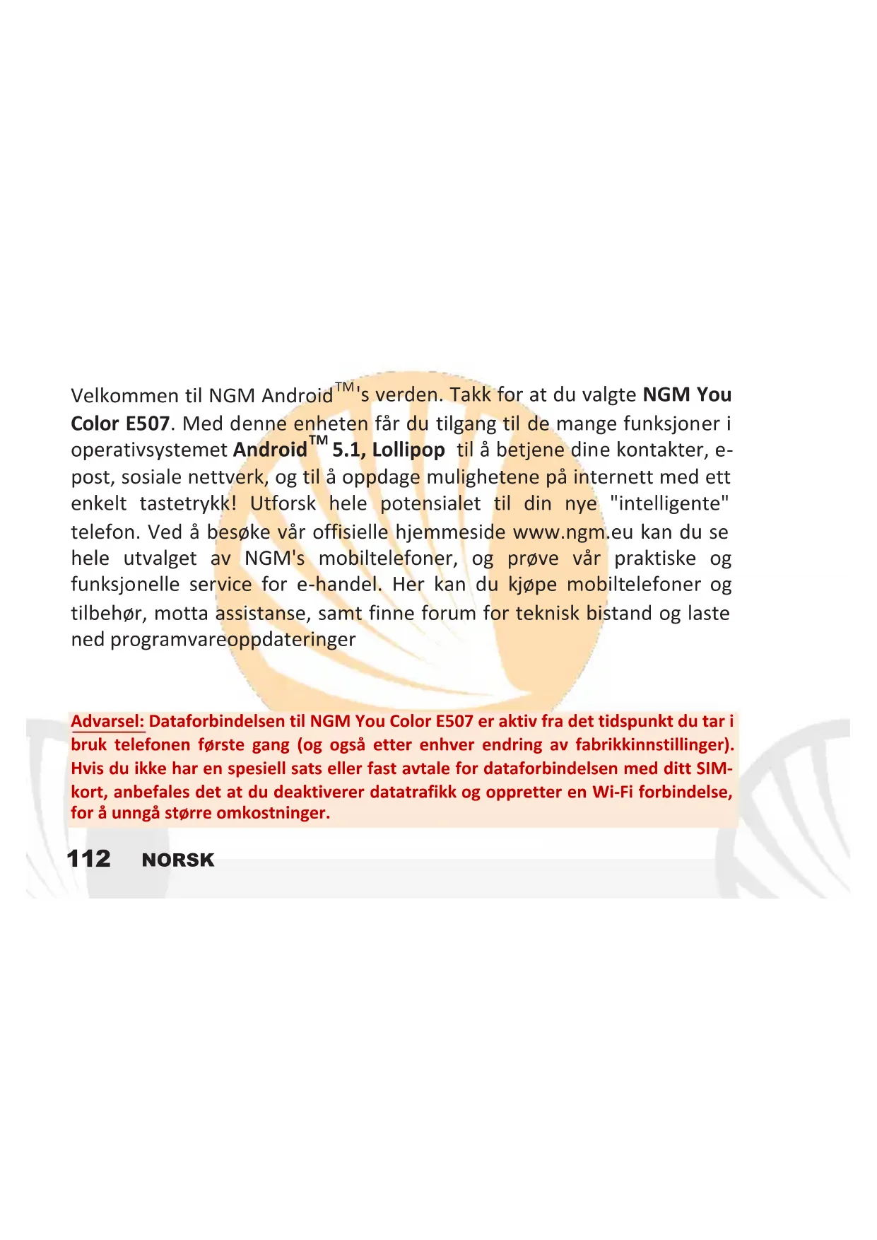 5.1, Lollipop til å betjene dine kontakter, e- post, sosiale nettverk, og til å oppdage mulighetene på internett med ett enkelt tastetrykk! Utforsk hele potensialet til din nye "intelligente" telefon. Ved å besøke vår offisielle hjemmeside www.ngm.eu kan du se hele utvalget av NGM's mobiltelefoner, og prøve vår praktiske og funksjonelle service for e-handel. Her kan du kjøpe mobiltelefoner og tilbehør, motta assistanse, samt finne forum for teknisk bistand og laste ned programvareoppdateringer