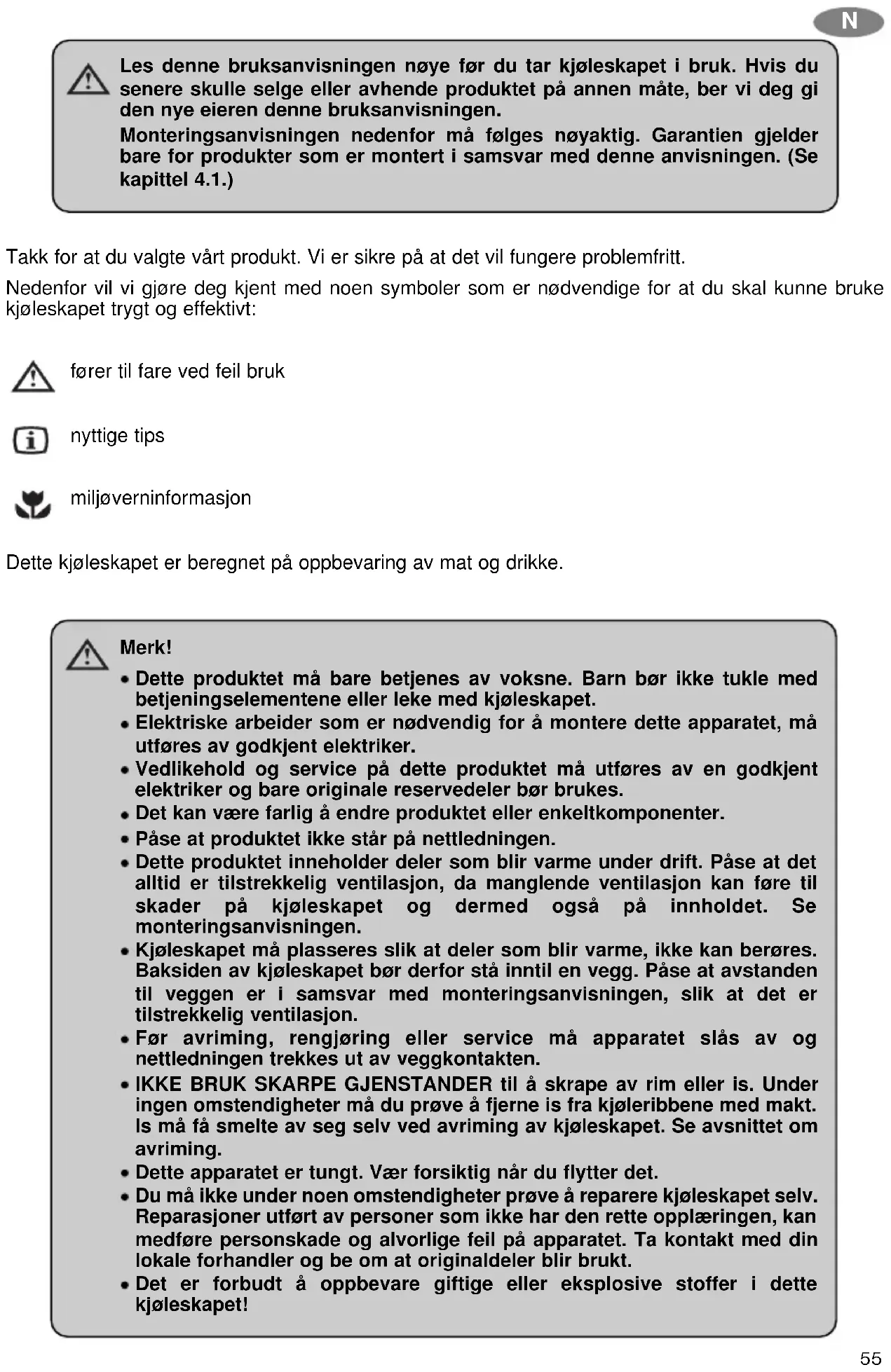 Merk! Garanti gis i henhold til EU-direktiv 44/1999/CE og gjeldende lokale regler. Kontakt Dometics servicenettverk dersom du har spørsmål om garanti eller annen service, for eksempel reservedeler. Garantien dekker ikke skader som følge av ukorrekt bruk. Garantien dekker ikke endringer ved apparatet eller bruk av annet enn originale Dometic-reservedeler. Garantien gjelder ikke hvis ikke anvisningene om montering og bruk blir fulgt. Når du kontakter Dometics servicenettverk, bes du oppgi modell, produktnummer og serienummer. Disse opplysningene finner du på typeskiltet på innsiden av kjøleskapet. N57