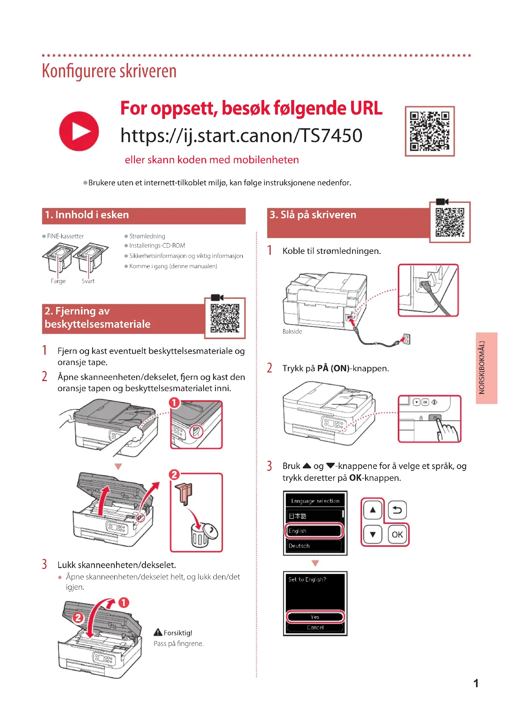 Åpne skanneenheten/dekselet helt, og lukk den/det igjen. Forsiktig!Pass på ngrene.