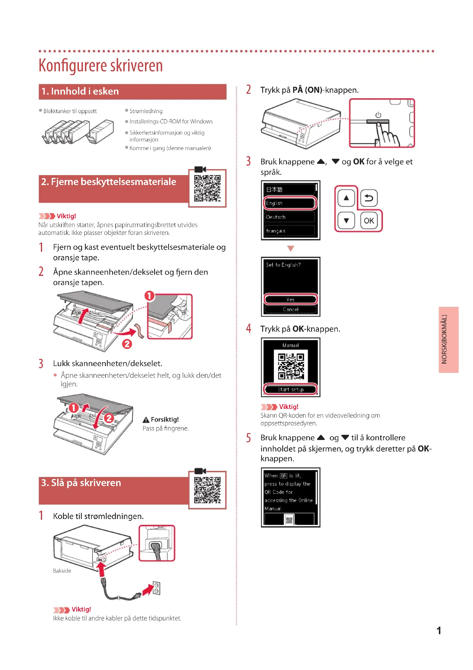 Blekktanker til oppsett Strømledning Installerings-CD-ROM for Windows Sikkerhetsinformasjon og viktig informasjon Komme i gang (denne manualen)