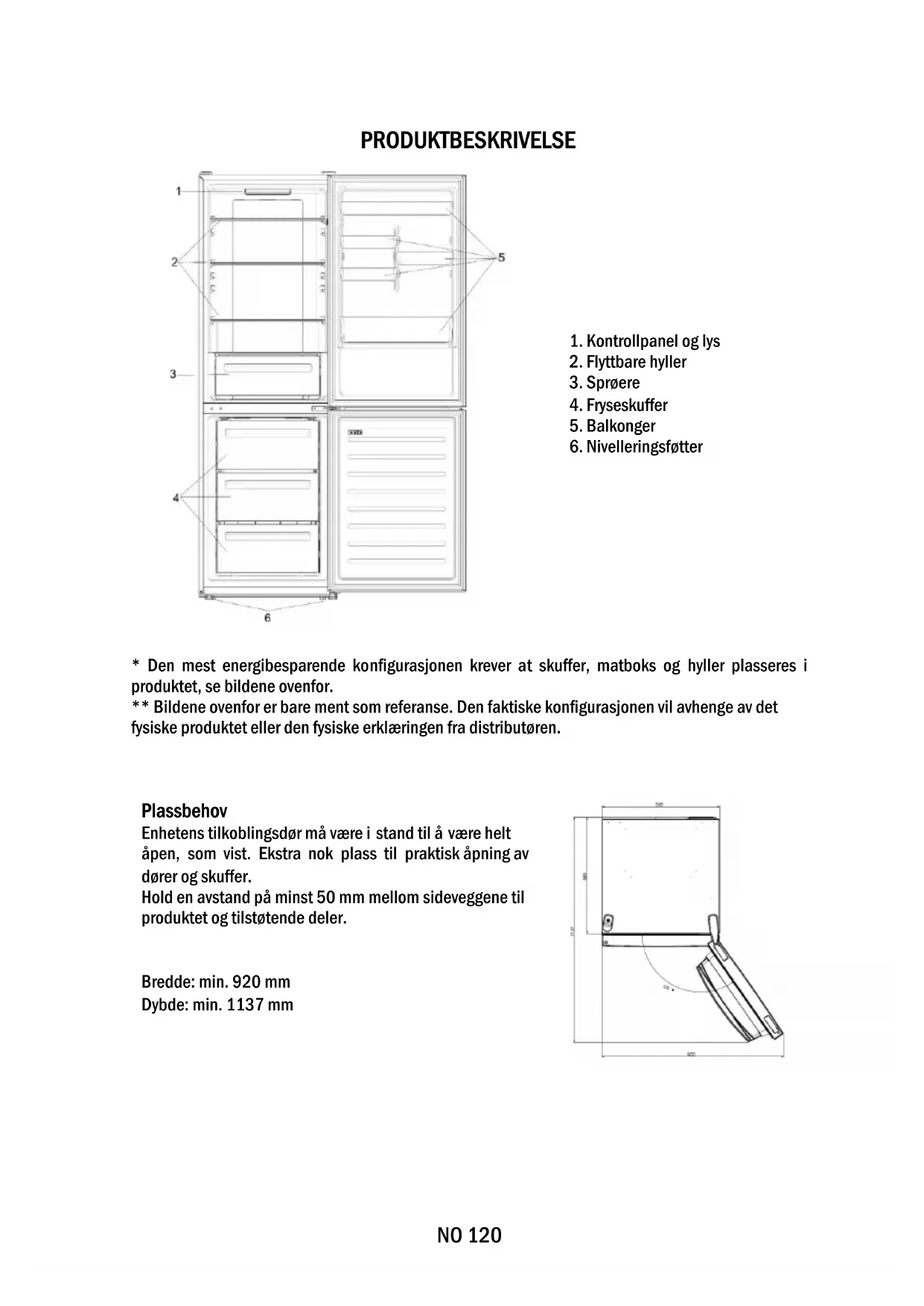- Den mest energibesparende konfigurasjonen krever at skuffer, matboks og hyller plasseres i produktet, se bildene ovenfor. ** Bildene ovenfor er bare ment som referanse. Den faktiske konfigurasjonen vil avhenge av det fysiske produktet eller den fysiske erklæringen fra distributøren. Plassbehov Enhetens tilkoblingsdør må være i stand til å være helt åpen, som vist. Ekstra nok plass til praktisk åpning av dører og skuffer. Hold en avstand på minst 50 mm mellom sideveggene til produktet og tilstøtende deler. Bredde: min. 920 mm Dybde: min. 1137 mmNO 121 BRUK ➀ PÅ/AV-tasten, brukes til å slå apparatet av/på. ➁ Mode-tasten, som brukes til å velge temperaturen i kjøleskapet eller spesialfunksjoner. ➂ Wi-Fi-ikon, vises hvis apparatet er koblet til appen. ➃ Super Cool-ikon viser hvis funksjonen er aktivert. ➄ Temperaturnivåer, viser den valgte temperaturen. Bruk