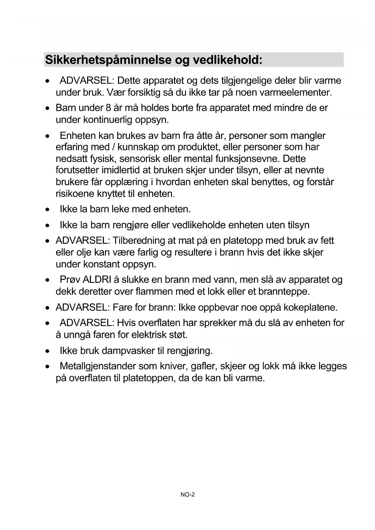 Kokekar laget av følgende materialer er ikke egnet: rent rustfritt stål, aluminium eller kobber uten magnetisk base, glass, tre, porselen, keramikk og steingods. Ikke bruk kokekar med ujevne kanter eller rundet bunn. Pass på at bunnen av kokekaret er jevn, sitter flatt mot glasset og har samme størrelse som kokesonen. Bruk kokekar som har like stor diameter som den kokesonen du har valgt. Ved å bruke et kokekar som er litt bredere vil energien bli brukt ved maksimal effektivitet. Hvis du bruker mindre kokekar vil effektiviteten bli mindre enn forventet. Kokekar på mindre enn 140 mm avdekkes kanskje ikke av platetoppen. Plasser alltid kokekaret sentralt på kokesonen. NO-7 NORSKLøft alltid kokekarene av induksjonstoppen – ikke dra dem bortover, da vil de kunne lage riper i glasset. Hvordan bruke Starte matlagingen Berør ON/OFF-kontrollen i tre sekunder. Når strømmen slås på, piper det en gang og alle displayer viser enten «–» eller «– –», noe som angir at induksjonstoppen er i ventemodus. Plasser en egnet panne på den kokesonen du vil bruke. Påse at bunnen av pannen og kokesonens overflate er rene og tørre. Berør kontrollvelgeren for kokesonen, så vil en indikator ved siden av knappen blinke. Velg en varmeinnstilling ved å berøre eller «+» -kontrollen. Hvis du ikke velger en varmeinnstilling innen 1 minutt, vil induksjonstoppen slå seg av automatisk. Du vil da måtte starte med trinn 1 igjen. Du kan endre varmeinnstillingen når som helst i løpet av matlagingen. Hvis displayet blinker vekselvis med varmeinnstillingen Dette betyr at: du ikke har plassert en panne på riktig kokesone, eller kokekaret du bruker ikke egner seg til induksjonsmatlaging, eller kokekaret er for lite eller ikke sentrert på kokesonen. NO-8Det skjer ingen oppvarming med mindre det befinner seg en egnet panne på kokesonen. Displayet slås automatisk av dersom det ikke plasseres en egnet panne på kokesonen innen 1 minutt. Avslutte matlagingen Berør kontrollvelgeren for kokesonen som du ønsker å slå av. Slå av kokesonen ved å bla ned til 0 eller berøre - og + -kontrollen sammen. Kontroller at displayet viser «0». ELLER Slå hele platetoppen av ved å trykke på ON/OFF- kontrollen. Se opp for varme overflater H viser hvilken kokesone som er varm. Bokstaven forsvinner når overflaten har avkjølt seg til en trygg temperatur. Dette kan også brukes som en strømbesparende funksjon ved behov for oppvarming av flere panner, bruk ganske enkelt kokesonen som allerede er varm. Bruke boost-funksjonen Aktivere boost-funksjonen Ta på kontrollvelgeren for kokesonen Trykk på boost-kontrollen B , soneindikatoren viser «P» og strømmen når Max. NO-9 NORSKAvbryte boost-funksjonen Trykk på «Boost» -kontrollen eller «-» -knappen for å avbryte Boost-funksjonen, deretter vil kokesonen gå tilbake til sin opprinnelige innstilling. ELLER Trykk på «-» og «+» -kontrollen sammen. Kokesonen slås av og boost-funksjonen avbrytes automatisk. Kokesonen går tilbake til den opprinnelige innstillingen etter 5 minutter. Hvis den opprinnelige varmeinnstillingen er lik 0, vil den gå tilbake til 9 etter 5 minutter. Låse kontrollene Du kan låse kontrollene for å unngå utilsiktet bruk (som at barn ved et uhell slår på kokesoner). Når kontrollene er låst, deaktiveres alle kontrollene bortsett fra ON/OFF-kontrollen. For å låse kontrollene Trykk på tastelåsen Timerindikatoren vil vise «Lo» For å låse opp kontrollene Berør og hold tastelåsen en stund. Når platetoppen er i låsemodus, er alle kontrollene, unntatt ON/OFF, deaktivert . Du kan alltid slå av induksjonstoppen med ON/OFF -kontrollen i en nødsituasjon, men du må låse opp platetoppen etterpå. Timerkontroll Du kan bruke timeren på to ulike måter: a) Du kan bruke den som en minutteller. I dette tilfellet vil timeren ikke slå av noen kokesone når tiden er utløpt. b) Du kan stille den til å slå en eller flere kokesoner av når tiden er utløpt. Timeren kan stilles til maksimalt 99 minutter. NO-10a) Bruke timeren som minutteller Pass på at koketoppen er slått på, hvis du velger en kokesone Merk: du kan bruke minuttelleren, minst én sone skal være aktiv. Velg sonen ved å berøre kontrollvelgeren for kokesonen. Når sonen er bekreftet, berører du kontrollen på timeren. Tellerindikatoren vil begynne å blinke, og «10» vil vises i timerdisplayet. Still inn tiden ved å trykke på «-» eller «+» -kontrollen på timeren Tips: Trykk på «-» eller «+» -kontrollen på timeren en gang for å redusere eller øke med 1 minutt. Tips: Ta på og hold inne «-» eller «+»-kontrollen på timeren for å øke eller redusere med 10 minutter. For å avbryte minuttelleren Velg sonen ved å berøre kontrollvelgeren for kokesonen. I løpet av kort tid, berører du timerkontrollen. Når du tar på «-» og «+» samtidig slettes timeren og «00» vil vises i minuttdisplayet. Når tiden er innstilt, starter nedtellingen med en gang. Displayet viser gjenværende tid og timerindikatoren vil blinke i 5 sekunder. Summeren piper i 30 sekunder og timerindikatoren viser «--» når den innstilte tiden utløper. NO-11 NORSKb) Innstilling av timeren for å slå av en kokesone Stille inn én sone: Berør kontrollvelgeren for kokesonen som du ønsker å stille inn timeren for. (f.eks sone 3#) På kort tid, før displayet slutter å blinke, berører du timerkontrollen. Tellerindikatoren vil begynne å blinke, og «10» vil vises i timerdisplayet. Sett tiden ved å trykke på «-» eller «+» -kontrollen av timeren Tips: Å trykke på «-» eller «+» -kontrollen for timeren en gang vil redusere eller øke med 1 minutt. Tips: Ta på og hold inne «-» eller «+»-kontrollen på timeren for å øke eller redusere med 10 minutter. For å avbryte timeren Velg sonen ved å berøre kontrollvelgeren for kokesonen. I løpet av kort tid, berører du timerkontrollen. Når du tar på «-» og «+» samtidig slettes timeren og «00» vil vis