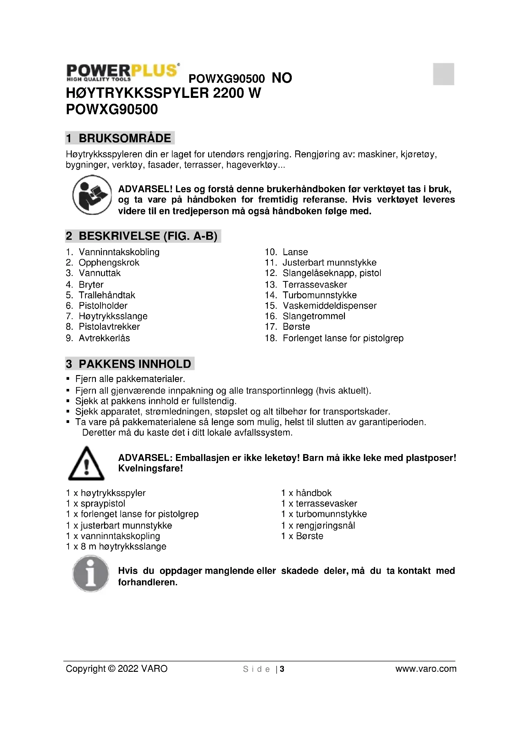 POWXG90500 - Høytrykkspyler PowerPlus - Gratis bruksanvisning og manual