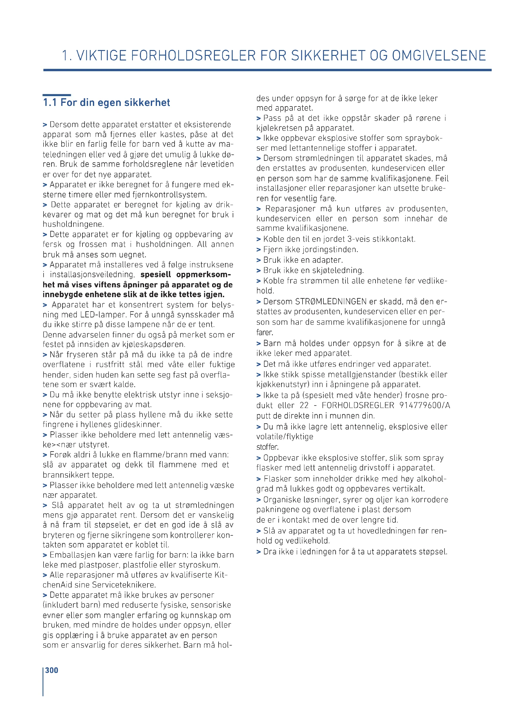 paratet > Renhold og vedlikehold som skal utføres av brukeren må ikke utføres av barn som ikke holdes under oppsyn. > Bruk aldri elektriske apparat inne i apparatet (f.eks. varmeapparat, elektrisk ismaskin, osv.). Eksplosjonsfare! > Du å aldri avise eller gjøre rent apparatet med en damprenser! Dampen kan trenge inn i elektris- ke deler og føre til kortslutning. Fare for elektrisk støt! > Bruk ikke utstyr med spisse og skarpe kanter for å fjerne frost og islag. Du kan skade rørene med kjølevæske. Lekkasje av kjølevæske kan føre til skade på øynene eller brannskader. > Påse at ingen gjenstander sitter fast i døren. > Du må ikke oppbevare produkter som inneholder lett antennelige drivsto (f.eks. sprayasker) og eksplosive stoer i apparatet. Eksplosjonsfare! > Du må ikke stå på eller lene deg tungt mot appa- ratet, skuene eller dører, osv. > Før du gjør apparatet rent, dra ut støpselet eller slå av sikringen. Ikke trekk ut strømledningen ved å dra i den. > Oppbevar drikkevarer med høy alkoholprosent godt lukket og stående. > Hold deler i plast og dørpakningen frie for olje og andre fettstoer. Ellers vil disse delene og dørpak- ningen bli porøs. > Dekk aldri til eller blokkering ventilasjonsåpnin- gene til apparatet. skade > I henhold til regelverket, kan barn mellom 3 og 8 år ta ut eller plassere maten i apparatet, men det frarå- des på det sterkeste å la barn under 8 år utføre disse handlingene og generelt benytte apparatet. > Hold barn under åtte år på sikker avstand med mindre de holdes under oppsyn og påse at de ikke leker med apparatet. Bruk ikke mekaniske, elektriske eller kjemiske hjel- pemidler for å fremskynde avrimingen enn de som eventuelt anbefales av produsenten. > Ikke påfør skade på kjølekretsen (dersom denne kan nås). > Bruk ikke elektriske apparat inne i seksjonene for oppbevaring av mat med mindre disse er at typen som anbefales av produsenten. > Dersom det oppstår skade ved kjølekretsen, unn- gå bruken av åpen amme og sørg for god ventila- sjon i rommet. > Bruk ikke apparatet eller deler av det på måter som ikke er spesisert i denne håndboken. > Dersom døren står åpen over lengre perioder kan dette føre til at temperaturen i seksjonene i appara- tet stiger betraktelig. >Gjør rene overatene som kan komme i kontakt med mat og tilgjengelige system for drenering. > Oppbevar rått kjøtt og rå sk i egnede beholdere i kjøleskapet, slik at det ikke kommer i kontakt med eller drypper på andre matvarer. > Dersom apparatet står tomt over lengre tidsperio- der, slå det av, avrime, gjøre det rent, tørke det og la døren stå åpen for å hindre muggdannelse inn. > La det aldri ligge skarpe metallgjenstander som kniver, gaer, skjeer og lokk på apparatet mens det er i bruk. > Ikke bruk slipende eller etsende rengjørings- middel (f.eks. skurepulver, ekkfjernere og stål ull) på deler i glass. > Ikke sitt på apparatet. > Ikke sitt eller len deg mot døren eller andre åpne skuer. > Ikke press på døren eller håndtaket for å bevege apparatet. > Bruk ikke elektriske apparat (f.eks. hårtørkere ) eller sprayer for avriming, delene i plast kan påføres skader. > Bruk ikke apparatet for å kjøle ned rom, uansett grunn. > Ta alltid ut støpselet dersom det oppstår en feil eller ved renhold eller vedlikehold. > Ikke oppbevar væske i bokser eller på glassas- ker i fryseren. > Ikke plasser tunge gjenstander på apparatet. > Dette apparatet er beregnet for bruk i husholdnin- ger og på lignende steder som for eksempel: selv- betjente kjøkken for butikkansatte, på kontorer eller på andre arbeidsplasser; gårder; av gjester på hotell, motell, bed & breakfast og andre overnattingssteder. Symbol brukt i veiledningen:302 Plastemballasje Fare for kvelning La ikke emballasjen eller deler av den ligge uten tilsyn. La ikke barn leke med plast posene.