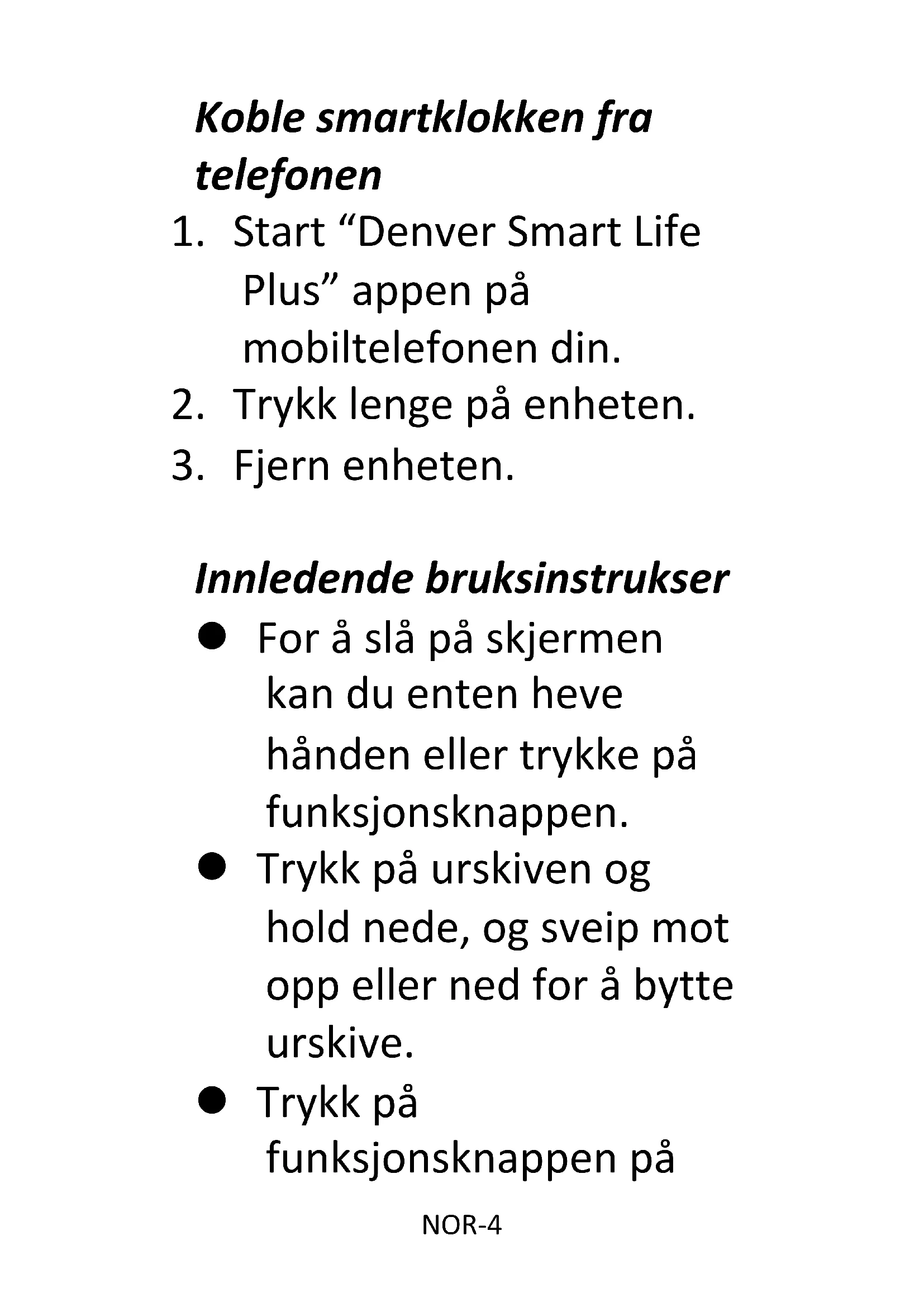 Innledende bruksinstrukser ⚫ For å slå på skjermen kan du enten heve hånden eller trykke på funksjonsknappen. ⚫ Trykk på urskiven og hold nede, og sveip mot opp eller ned for å bytte urskive. ⚫ Trykk på funksjonsknappen påNOR-5 smartklokken og hold den nede når klokken er slått av.