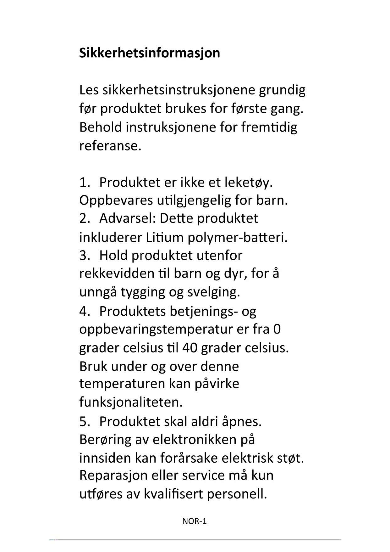 Brukerveiledning (NORSK)NOR-1 Sikkerhetsinformasjon Les sikkerhetsinstruksjonene grundig før produktet brukes for første gang. Behold instruksjonene for fremtidig referanse.