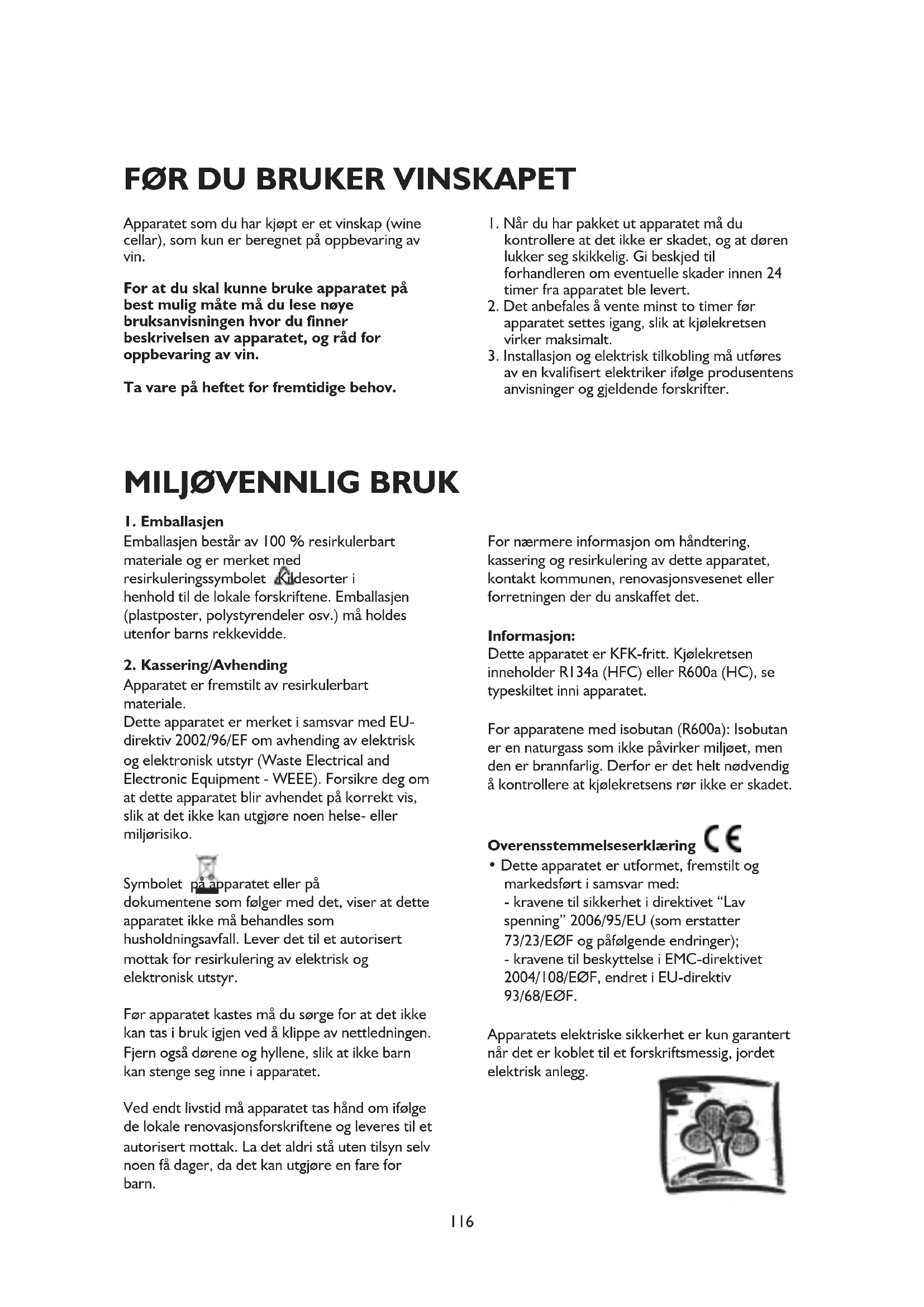 Apparatet er fremstilt av resirkulerbart materiale. Dette apparatet er merket i samsvar med EU- direktiv 2002/96/EF om avhending av elektrisk og elektronisk utstyr (Waste Electrical and Electronic Equipment - WEEE). Forsikre deg om at dette apparatet blir avhendet på korrekt vis, slik at det ikke kan utgjøre noen helse- eller miljørisiko. Symbolet på apparatet eller på dokumentene som følger med det, viser at dette apparatet ikke må behandles som husholdningsavfall. Lever det til et autorisert mottak for resirkulering av elektrisk og elektronisk utstyr. Før apparatet kastes må du sørge for at det ikke kan tas i bruk igjen ved å klippe av nettledningen. Fjern også dørene og hyllene, slik at ikke barn kan stenge seg inne i apparatet. Ved endt livstid må apparatet tas hånd om ifølge de lokale renovasjonsforskriftene og leveres til et autorisert mottak. La det aldri stå uten tilsyn selv noen få dager, da det kan utgjøre en fare for barn. For nærmere informasjon om håndtering, kassering og resirkulering av dette apparatet, kontakt kommunen, renovasjonsvesenet eller forretningen der du anskaffet det. Informasjon: Dette apparatet er KFK-fritt. Kjølekretsen inneholder R134a (HFC) eller R600a (HC), se typeskiltet inni apparatet. For apparatene med isobutan (R600a): Isobutan er en naturgass som ikke påvirker miljøet, men den er brannfarlig. Derfor er det helt nødvendig å kontrollere at kjølekretsens rør ikke er skadet. Overensstemmelseserklæring