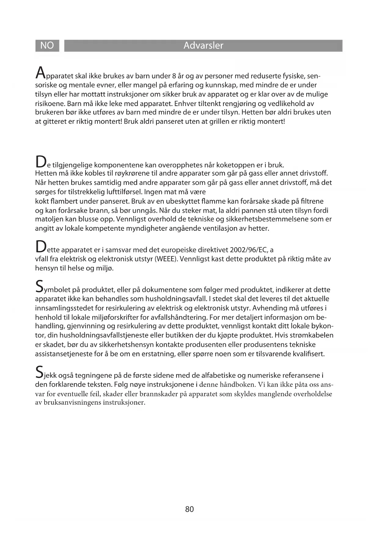 Apparatet skal ikke brukes av barn under 8 år og av personer med reduserte fysiske, sen- soriske og mentale evner, eller mangel på erfaring og kunnskap, med mindre de er under tilsyn eller har mottatt instruksjoner om sikker bruk av apparatet og er klar over av de mulige risikoene. Barn må ikke leke med apparatet. Enhver tiltenkt rengjøring og vedlikehold av brukeren bør ikke utføres av barn med mindre de er under tilsyn. Hetten bør aldri brukes uten at gitteret er riktig montert! Bruk aldri panseret uten at grillen er riktig montert! De tilgjengelige komponentene kan overopphetes når koketoppen er i bruk. Hetten må ikke kobles til røykrørene til andre apparater som går på gass eller annet drivsto. Når hetten brukes samtidig med andre apparater som går på gass eller annet drivsto, må det sørges for tilstrekkelig lufttilførsel. Ingen mat må være kokt ambert under panseret. Bruk av en ubeskyttet amme kan forårsake skade på ltrene og kan forårsake brann, så bør unngås. Når du steker mat, la aldri pannen stå uten tilsyn fordi matoljen kan blusse opp. Vennligst overhold de tekniske og sikkerhetsbestemmelsene som er angitt av lokale kompetente myndigheter angående ventilasjon av hetter. Dette apparatet er i samsvar med det europeiske direktivet 2002/96/EC, a vfall fra elektrisk og elektronisk utstyr (WEEE). Vennligst kast dette produktet på riktig måte av hensyn til helse og miljø. Symbolet på produktet, eller på dokumentene som følger med produktet, indikerer at dette apparatet ikke kan behandles som husholdningsavfall. I stedet skal det leveres til det aktuelle innsamlingsstedet for resirkulering av elektrisk og elektronisk utstyr. Avhending må utføres i henhold til lokale miljøforskrifter for avfallshåndtering. For mer detaljert informasjon om be- handling, gjenvinning og resirkulering av dette produktet, vennligst kontakt ditt lokale bykon- tor, din husholdningsavfallstjeneste eller butikken der du kjøpte produktet. Hvis strømkabelen er skadet, bør du av sikkerhetshensyn kontakte produsenten eller produsentens tekniske assistansetjeneste for å be om en erstatning, eller spørre noen som er tilsvarende kvalisert. Sjekk også tegningene på de første sidene med de alfabetiske og numeriske referansene i den forklarende teksten. Følg nøye instruksjonene i denne håndboken. Vi kan ikke påta oss ans- var for eventuelle feil, skader eller brannskader på apparatet som skyldes manglende overholdelse av bruksanvisningens instruksjoner.AVVERTENZE