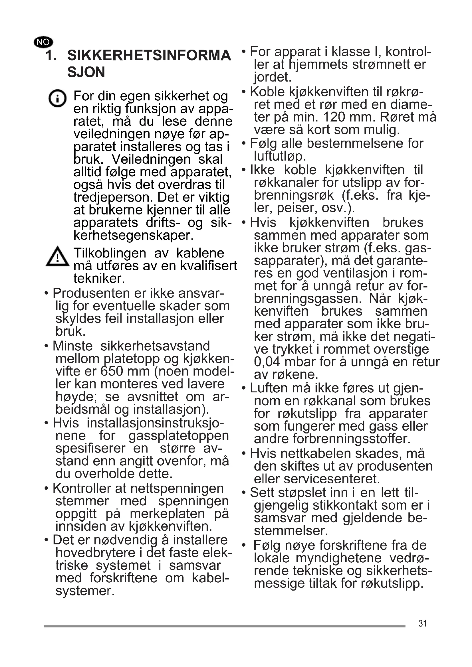 - Hvis kjøkkenviften brukes sammen med apparater som ikke bruker strøm (f.eks. gas- sapparater), må det garante- res en god ventilasjon i rom- met for å unngå retur av for- brenningsgassen. Når kjøk- kenviften brukes sammen med apparater som ikke bru- ker strøm, må ikke det negati- ve trykket i rommet overstige 0,04 mbar for å unngå en retur av røkene.