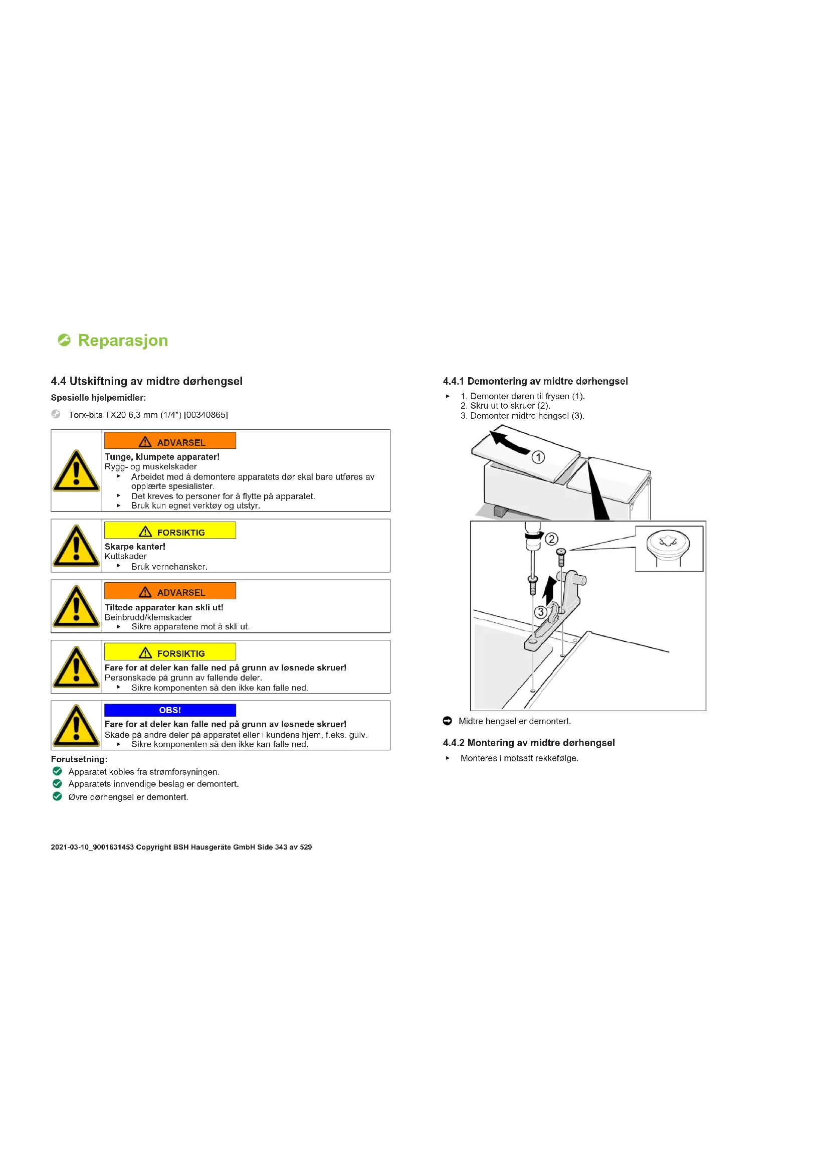 Fare for elektrisk støt på grunn av strømførende deler! ¡ Feil ved reparasjoner hvor elektriske komponenter er involvert, kan føre til elektrisk støt! ¡ Koble apparatet fra strømnettet i minst60 sekunderfør arbeidet startes. ¡ Etter reparasjonen må du sørge for at det utføres en sikkerhetstest iht. VDE 0701 eller gjeldende forskrifter i det respektive land. Fare for personskade på grunn av skarpe kanter! ¡ Bruk vernehansker. Fare for å knuse legemsdeler under reparasjoner, vedlikehold, feilsøking og service på grunn av tunge og bevegelige komponenter ¡ Bruk vernesko. ¡ Sikre tunge komponenter for å hindre at de faller ned. ¡ Ikke stikk kroppsdeler inn i bevegelige komponenter. Fare for apparatets sikkerhet/funksjon! ¡ Bruk kun originale reservedeler. Fare for skade på deler som er følsomme overfor elektrostatisk utlading (ESD)! ¡ Ikke berør modulene, inklusive tilkoblinger og ledere. Sikkerhet 2021-03-10_9001631453 Copyright BSH Hausgeräte GmbH Side335av529Verktøy og hjelpemidler Betegnelse Detaljer Bilder Beskyttelsesklut [00342013] 60cm x 50cm Flat skrutrekker Blad 2,4mm x 0,4mm x 60mm, i sett [00341820] Spesialverktøy [00342180] Sugekopp [00342224] Ø50mm Torx-bits TX20 [00340865] 6,3mm (1/4") Flat skrutrekker Blad 10mm x 1,6mm x 200mm Verktøy og hjelpemidler 2021-03-10_9001631453 Copyright BSH Hausgeräte GmbH Side336av529Reparasjon