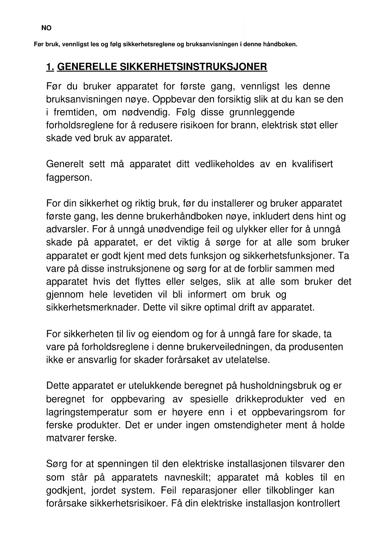 GENERELLE SIKKERHETSINSTRUKSJONER Før du bruker apparatet for første gang, vennligst les denne bruksanvisningen nøye. Oppbevar den forsiktig slik at du kan se den i fremtiden, om nødvendig. Følg disse grunnleggende forholdsreglene for å redusere risikoen for brann, elektrisk støt eller skade ved bruk av apparatet. Generelt sett må apparatet ditt vedlikeholdes av en kvalifisert fagperson. For din sikkerhet og riktig bruk, før du installerer og bruker apparatet første gang, les denne brukerhåndboken nøye, inkludert dens hint og advarsler. For å unngå unødvendige feil og ulykker eller for å unngå skade på apparatet, er det viktig å sørge for at alle som bruker apparatet er godt kjent med dets funksjon og sikkerhetsfunksjoner. Ta vare på disse instruksjonene og sørg for at de forblir sammen med apparatet hvis det flyttes eller selges, slik at alle som bruker det gjennom hele levetiden vil bli informert om bruk og sikkerhetsmerknader. Dette vil sikre optimal drift av apparatet. For sikkerheten til liv og eiendom og for å unngå fare for skade, ta vare på forholdsreglene i denne brukerveiledningen, da produsenten ikke er ansvarlig for skader forårsaket av utelatelse. Dette apparatet er utelukkende beregnet på husholdningsbruk og er beregnet for oppbevaring av spesielle drikkeprodukter ved en lagringstemperatur som er høyere enn i et oppbevaringsrom for ferske produkter. Det er under ingen omstendigheter ment å holde matvarer ferske. Sørg for at spenningen til den elektriske installasjonen tilsvarer den som står på apparatets navneskilt; apparatet må kobles til en godkjent, jordet system. Feil reparasjoner eller tilkoblinger kan forårsake sikkerhetsrisikoer. Få din elektriske installasjon kontrollertNO av en fagmann, hvis du er i tvil. Denne enheten må være riktig koblet til en jordet stikkontakt for din beskyttelse. Ikke kutt av eller fjern jordledningen på strømkabelen som følger med. Av sikkerhetsgrunner må du ikke bruke en elektrisk skjøteledning. Hvis apparatet ditt er skadet (f.eks. en større støt) eller blir skadet (strømstøt på grunn av lynnedslag, flom, brann), kan det være farlig å bruke. Trekk ut støpselet og få apparatet kontrollert av en godkjent profesjonell reparatør. For å unngå fare, ikke skift ut en skadet strømkabel selv. Kontakt din forhandler, et godkjent servicesenter eller en profesjonell reparatør. Dette apparatet må plasseres slik at stikkontakten er tilgjengelig. Ikke flytt apparatet når det er fullt: du kan forvrenge kroppen uten å repareres. De elektriske delene må ikke være direkte tilgjengelige.