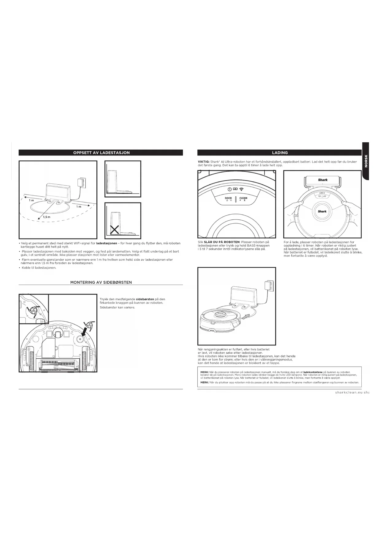 Trykk den medfølgende sidebørsten på den firkantede knaggen på bunnen av roboten. Sidebørster kan variere. For å lade, plasser roboten på ladestasjonen for oppladning i 6 timer. Når roboten er riktig justert på ladestasjonen, vil batteriikonet på roboten lyse. Når batteriet er fulladet, vil ladeikonet slutte å blinke, men fortsette å være opplyst. Slik SLÅR DU PÅ ROBOTEN: Plasser roboten på ladestasjonen eller trykk og hold BASE-knappen i 5 til 7 sekunder inntil indikatorlysene slås på. Når rengjøringsøkten er fullført, eller hvis batteriet er lavt, vil roboten søke etter ladestasjonen. Hvis roboten ikke kommer tilbake til ladestasjonen, kan det hende at den er tom for strøm; eller hvis den er i våtrengjøringsmodus, kan det hende at ladestasjonen er blokkert av et teppe. LADING VIKTIG: Shark® AI Ultra-roboten har et forhåndsinstallert, oppladbart batteri. Lad det helt opp før du bruker det første gang. Det kan ta opptil 6 timer å lade helt opp. MERK: Når du plasserer roboten på ladestasjonen manuelt, må du forsikre deg om at ladekontaktene på bunnen av roboten berører de på ladestasjonen. Mens roboten lader, blinker begge de hvite LED-lampene. Når roboten er riktig justert på ladestasjonen, vil batteriikonet på roboten lyse. Når batteriet er fulladet, vil ladeikonet slutte å blinke, men fortsette å være opplyst. MERK: Når du plukker opp roboten må du passe på at du ikke plasserer fingrene mellom støtfangeren og bunnen av roboten. 1,5 m 1 m 1 m