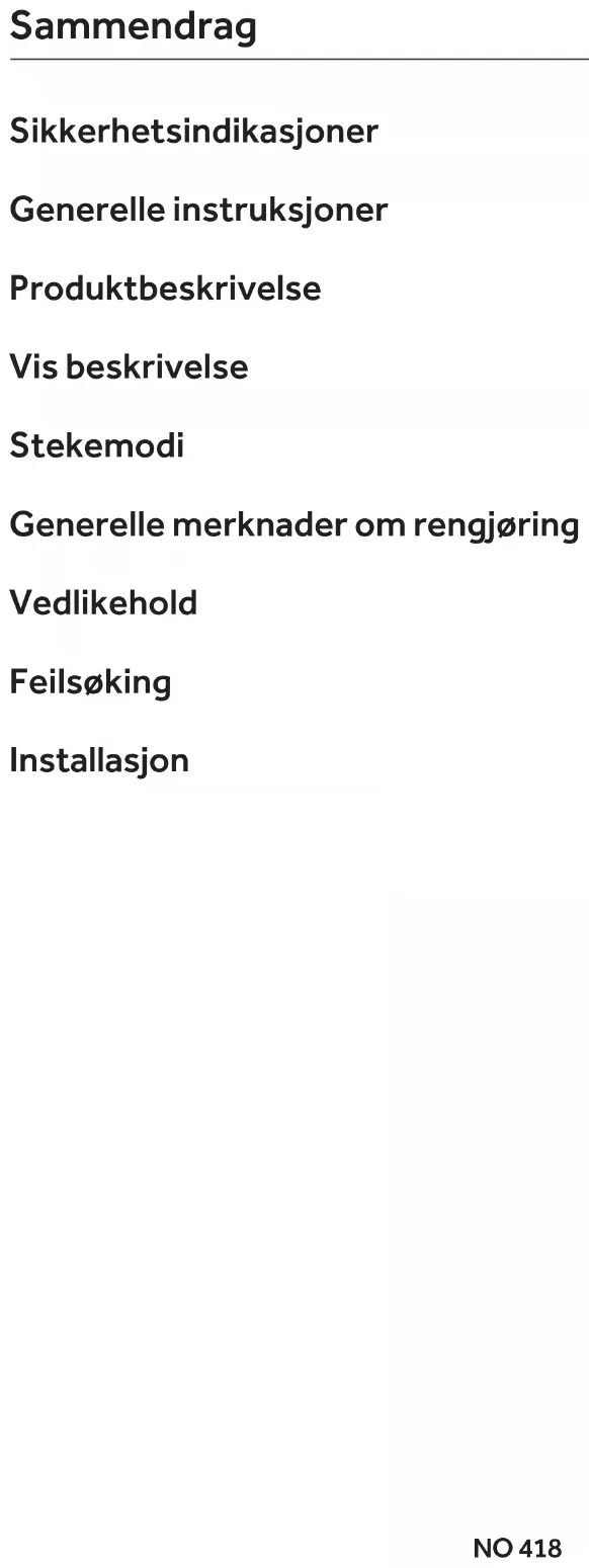 - Ikke bruk grove eller slipende materialer eller skarpe metallskra- pere for å rengjøre ovnsdørens glass, da de kan ripe opp over- aten og få glasset til å knuses. SikkerhetsindikasjonerNO 420