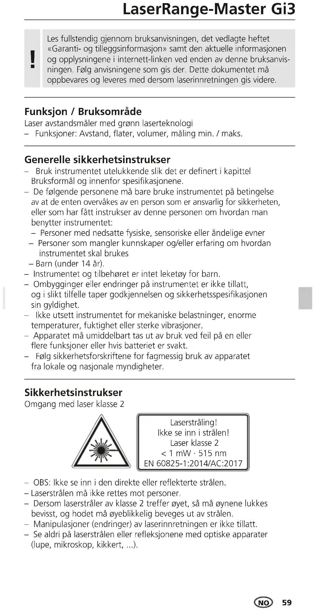 Funksjon / Bruksområde Generelle sikkerhetsinstrukser – Bruk instrumentet utelukkende slik det er denert i kapittel Bruksformål og innenfor spesikasjonene. – De følgende personene må bare bruke instrumentet på betingelse av at de enten overvåkes av en person som er ansvarlig for sikkerheten, eller som har fått instrukser av denne personen om hvordan man benytter instrumentet: – Personer med nedsatte fysiske, sensoriske eller åndelige evner – Personer som mangler kunnskaper og/eller erfaring om hvordan instrumentet skal brukes – Barn (under 14 år). – Instrumentet og tilbehøret er intet leketøy for barn. – Ombygginger eller endringer på instrumentet er ikke tillatt, og i slikt tilfelle taper godkjennelsen og sikkerhetsspesikasjonen sin gyldighet. – Ikke utsett instrumentet for mekaniske belastninger, enorme temperaturer, fuktighet eller sterke vibrasjoner. – Apparatet må umiddelbart tas ut av bruk ved feil på en eller ere funksjoner eller hvis batteriet er svakt. – Følg sikkerhetsforskriftene for fagmessig bruk av apparatet fra lokale og nasjonale myndigheter. – OBS: Ikke se inn i den direkte eller reekterte strålen. – Laserstrålen må ikke rettes mot personer. – Dersom laserstråler av klasse 2 treffer øyet, så må øynene lukkes bevisst, og hodet må øyeblikkelig beveges ut av strålen. – Manipulasjoner (endringer) av laserinnretningen er ikke tillatt. – Se aldri på laserstrålen eller reeksjonene med optiske apparater (lupe, mikroskop, kikkert, ...). Sikkerhetsinstrukser Omgang med laser klasse 2 Laserstråling! Ikke se inn i strålen! Laser klasse 2 < 1 mW · 515 nm EN 60825-1:2014/AC:2017 Laser avstandsmåler med grønn laserteknologi – Funksjoner: Avstand, ater, volumer, måling min. / maks. Les fullstendig gjennom bruksanvisningen, det vedlagte heftet «Garanti- og tilleggsinformasjon» samt den aktuelle informasjonen og opplysningene i internett-linken ved enden av denne bruksanvis- ningen. Følg anvisningene som gis der. Dette dokumentet må oppbevares og leveres med dersom laserinnretningen gis videre. !60 Åpne batterirommet og sett inn batteriene (2 x type AAA) ifølge installasjonssymbolene. Sørg for at polene blir lagt riktig. Innlegging av batterier