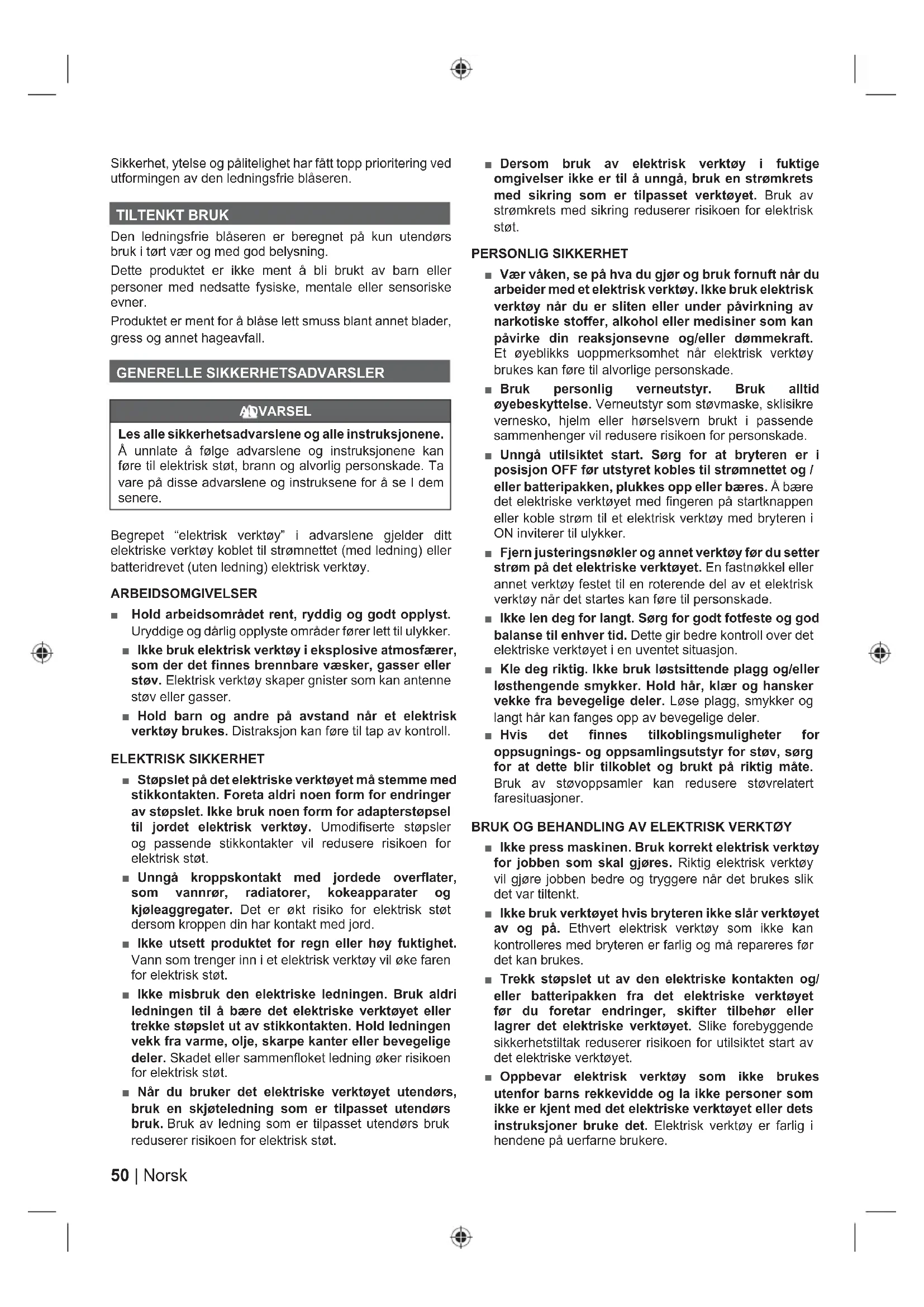VAROITUS Ilmaisee potentiaalisen vaaratilanteen, joka ellei sitä vältetä, johtaa kuolemaan tai vakavaan loukkaantumiseen. HUOMAUTUS Ilmaisee potentiaalisen vaaratilanteen, joka ellei sitä vältetä, saattaa johtaa pienempään tai keskivaikeaan loukkaantumiseen. HUOMAUTUS Ilman turvallisuusvaroitussymbolia Ilmoittaa tilanteesta, jossa omaisuutta saattaa vaurioitua.50 | Norsk Sikkerhet, ytelse og pålitelighet har fått topp prioritering ved utformingen av den ledningsfrie blåseren. TILTENKT BRUK Den ledningsfrie blåseren er beregnet på kun utendørs bruk i tørt vær og med god belysning. Dette produktet er ikke ment å bli brukt av barn eller personer med nedsatte fysiske, mentale eller sensoriske evner. Produktet er ment for å blåse lett smuss blant annet blader, gress og annet hageavfall. GENERELLE SIKKERHETSADVARSLER ADVARSEL Les alle sikkerhetsadvarslene og alle instruksjonene. Å unnlate å følge advarslene og instruksjonene kan føre til elektrisk støt, brann og alvorlig personskade. Ta vare på disse advarslene og instruksene for å se I dem senere. Begrepet “elektrisk verktøy” i advarslene gjelder ditt elektriske verktøy koblet til strømnettet (med ledning) eller batteridrevet (uten ledning) elektrisk verktøy. ARBEIDSOMGIVELSER ■ Hold arbeidsområdet rent, ryddig og godt opplyst. Uryddige og dårlig opplyste områder fører lett til ulykker. ■ Ikke bruk elektrisk verktøy i eksplosive atmosfærer, som der det finnes brennbare væsker, gasser eller støv. Elektrisk verktøy skaper gnister som kan antenne støv eller gasser. ■ Hold barn og andre på avstand når et elektrisk verktøy brukes. Distraksjon kan føre til tap av kontroll. ELEKTRISK SIKKERHET ■ Støpslet på det elektriske verktøyet må stemme med stikkontakten. Foreta aldri noen form for endringer av støpslet. Ikke bruk noen form for adapterstøpsel til jordet elektrisk verktøy. Umodifiserte støpsler og passende stikkontakter vil redusere risikoen for elektrisk støt. ■ Unngå kroppskontakt med jordede overflater, som vannrør, radiatorer, kokeapparater og kjøleaggregater. Det er økt risiko for elektrisk støt dersom kroppen din har kontakt med jord. ■ Ikke utsett produktet for regn eller høy fuktighet. Vann som trenger inn i et elektrisk verktøy vil øke faren for elektrisk støt. ■ Ikke misbruk den elektriske ledningen. Bruk aldri ledningen til å bære det elektriske verktøyet eller trekke støpslet ut av stikkontakten. Hold ledningen vekk fra varme, olje, skarpe kanter eller bevegelige deler. Skadet eller sammenfloket ledning øker risikoen for elektrisk støt. ■ Når du bruker det elektriske verktøyet utendørs, bruk en skjøteledning som er tilpasset utendørs bruk. Bruk av ledning som er tilpasset utendørs bruk reduserer risikoen for elektrisk støt. ■ Dersom bruk av elektrisk verktøy i fuktige omgivelser ikke er til å unngå, bruk en strømkrets med sikring som er tilpasset verktøyet. Bruk av strømkrets med sikring reduserer risikoen for elektrisk støt. PERSONLIG SIKKERHET ■ Vær våken, se på hva du gjør og bruk fornuft når du arbeider med et elektrisk verktøy. Ikke bruk elektrisk verktøy når du er sliten eller under påvirkning av narkotiske stoffer, alkohol eller medisiner som kan påvirke din reaksjonsevne og/eller dømmekraft. Et øyeblikks uoppmerksomhet når elektrisk verktøy brukes kan føre til alvorlige personskade. ■ Bruk personlig verneutstyr. Bruk alltid øyebeskyttelse. Verneutstyr som støvmaske, sklisikre vernesko, hjelm eller hørselsvern brukt i passende sammenhenger vil redusere risikoen for personskade. ■ Unngå utilsiktet start. Sørg for at bryteren er i posisjon OFF før utstyret kobles til strømnettet og / eller batteripakken, plukkes opp eller bæres. Å bære det elektriske verktøyet med fingeren på startknappen eller koble strøm til et elektrisk verktøy med bryteren i ON inviterer til ulykker. ■ Fjern justeringsnøkler og annet verktøy før du setter strøm på det elektriske verktøyet. En fastnøkkel eller annet verktøy festet til en roterende del av et elektrisk verktøy når det startes kan føre til personskade. ■ Ikke len deg for langt. Sørg for godt fotfeste og god balanse til enhver tid. Dette gir bedre kontroll over det elektriske verktøyet i en uventet situasjon. ■ Kle deg riktig. Ikke bruk løstsittende plagg og/eller løsthengende smykker. Hold hår, klær og hansker vekke fra bevegelige deler. Løse plagg, smykker og langt hår kan fanges opp av bevegelige deler. ■ Hvis det finnes tilkoblingsmuligheter for oppsugnings- og oppsamlingsutstyr for støv, sørg for at dette blir tilkoblet og brukt på riktig måte. Bruk av støvoppsamler kan redusere støvrelatert faresituasjoner. BRUK OG BEHANDLING AV ELEKTRISK VERKTØY ■ Ikke press maskinen. Bruk korrekt elektrisk verktøy for jobben som skal gjøres. Riktig elektrisk verktøy vil gjøre jobben bedre og tryggere når det brukes slik det var tiltenkt. ■ Ikke bruk verktøyet hvis bryteren ikke slår verktøyet av og på. Ethvert elektrisk verktøy som ikke kan kontrolleres med bryteren er farlig og må repareres før det kan brukes. ■ Trekk støpslet ut av den elektriske kontakten og/ eller batteripakken fra det elektriske verktøyet før du foretar endringer, skifter tilbehør eller lagrer det elektriske verktøyet. Slike forebyggende sikkerhetstiltak reduserer risikoen for utilsiktet start av det elektriske verktøyet. ■ Oppbevar elektrisk verktøy som ikke brukes utenfor barns rekkevidde og la ikke personer som ikke er kjent med det elektriske verktøyet eller dets instruksjoner bruke det. Elektrisk verktøy er farlig i hendene på uerfarne brukere.51 Norsk |