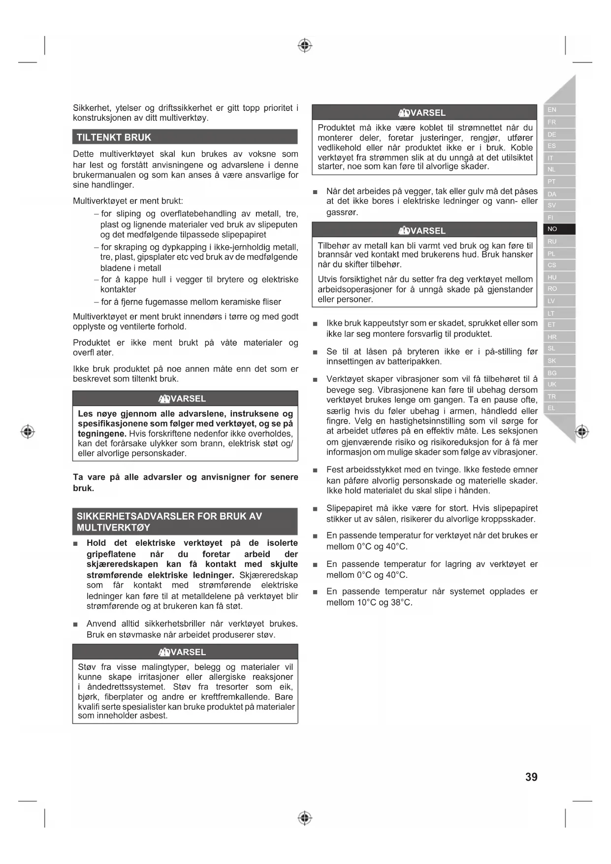 MULTIVERKTØY ■ Hold det elektriske verktøyet på de isolerte gripeflatene når du foretar arbeid der skjæreredskapen kan få kontakt med skjulte strømførende elektriske ledninger. Skjæreredskap som får kontakt med strømførende elektriske ledninger kan føre til at metalldelene på verktøyet blir strømførende og at brukeren kan få støt. ■ Anvend alltid sikkerhetsbriller når verktøyet brukes. Bruk en støvmaske når arbeidet produserer støv. ADVARSEL Støv fra visse malingtyper, belegg og materialer vil kunne skape irritasjoner eller allergiske reaksjoner i åndedrettssystemet. Støv fra tresorter som eik, bjørk, fi berplater og andre er kreftfremkallende. Bare kvalifi serte spesialister kan bruke produktet på materialer som inneholder asbest. ADVARSEL Produktet må ikke være koblet til strømnettet når du monterer deler, foretar justeringer, rengjør, utfører vedlikehold eller når produktet ikke er i bruk. Koble verktøyet fra strømmen slik at du unngå at det utilsiktet starter, noe som kan føre til alvorlige skader. ■ Når det arbeides på vegger, tak eller gulv må det påses at det ikke bores i elektriske ledninger og vann- eller gassrør. ADVARSEL Tilbehør av metall kan bli varmt ved bruk og kan føre til brannsår ved kontakt med brukerens hud. Bruk hansker når du skifter tilbehør. Utvis forsiktighet når du setter fra deg verktøyet mellom arbeidsoperasjoner for å unngå skade på gjenstander eller personer. ■ Ikke bruk kappeutstyr som er skadet, sprukket eller som ikke lar seg montere forsvarlig til produktet. ■ Se til at låsen på bryteren ikke er i på-stilling før innsettingen av batteripakken. ■ Verktøyet skaper vibrasjoner som vil få tilbehøret til å bevege seg. Vibrasjonene kan føre til ubehag dersom verktøyet brukes lenge om gangen. Ta en pause ofte, særlig hvis du føler ubehag i armen, håndledd eller fingre. Velg en hastighetsinnstilling som vil sørge for at arbeidet utføres på en effektiv måte. Les seksjonen om gjenværende risiko og risikoreduksjon for å få mer informasjon om mulige skader som følge av vibrasjoner. ■ Fest arbeidsstykket med en tvinge. Ikke festede emner kan påføre alvorlig personskade og materielle skader. Ikke hold materialet du skal slipe i hånden. ■ Slipepapiret må ikke være for stort. Hvis slipepapiret stikker ut av sålen, risikerer du alvorlige kroppsskader. ■ En passende temperatur for verktøyet når det brukes er mellom 0°C og 40°C. ■ En passende temperatur for lagring av verktøyet er mellom 0°C og 40°C. ■ En passende temperatur når systemet opplades er mellom 10°C og 38°C. 39 Norsk |