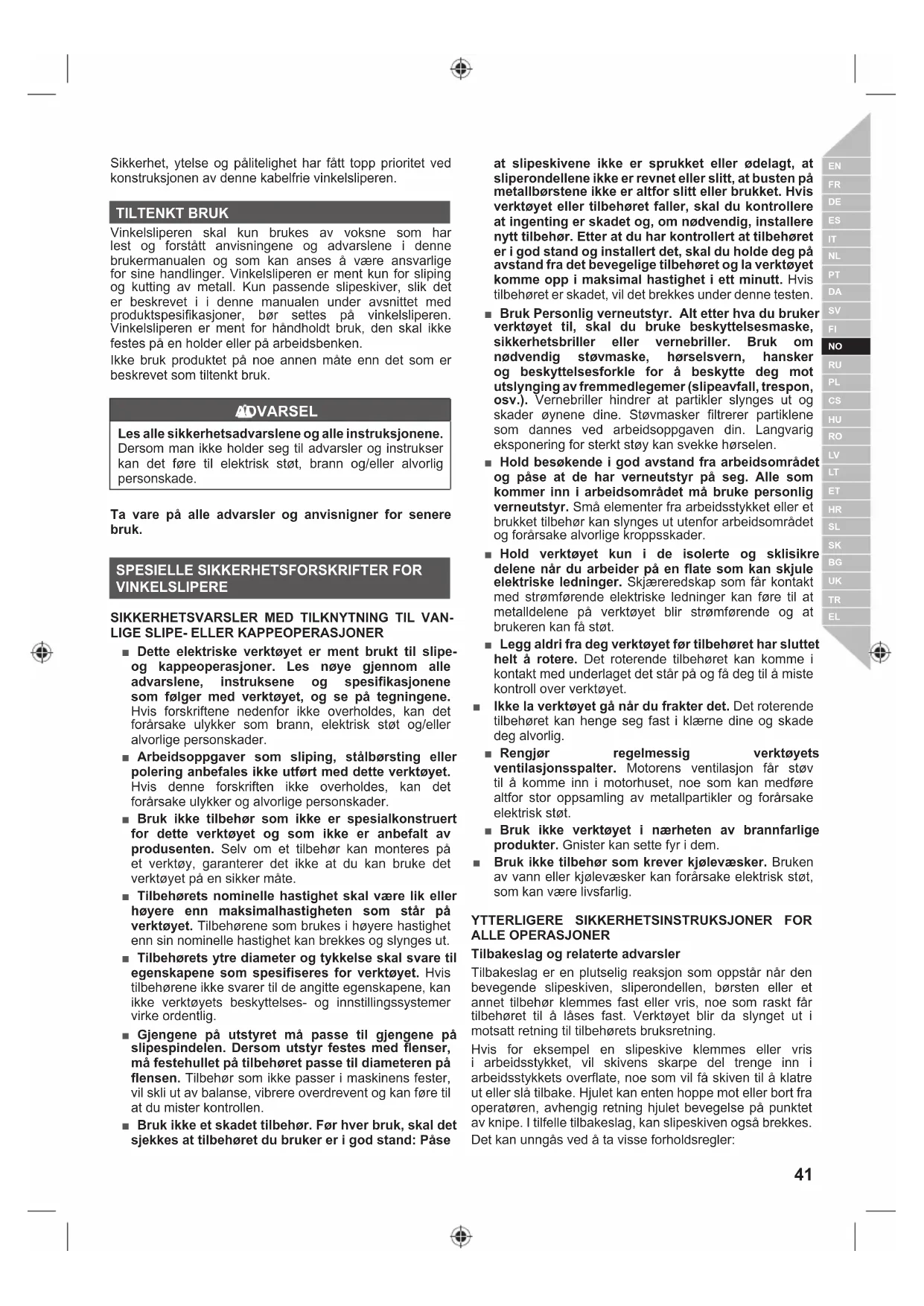 Sikkerhet, ytelse og pålitelighet har fått topp prioritet ved konstruksjonen av denne kabelfrie vinkelsliperen. TILTENKT BRUK Vinkelsliperen skal kun brukes av voksne som har lest og forstått anvisningene og advarslene i denne brukermanualen og som kan anses å være ansvarlige for sine handlinger. Vinkelsliperen er ment kun for sliping og kutting av metall. Kun passende slipeskiver, slik det er beskrevet i i denne manualen under avsnittet med produktspesifikasjoner, bør settes på vinkelsliperen. Vinkelsliperen er ment for håndholdt bruk, den skal ikke festes på en holder eller på arbeidsbenken. Ikke bruk produktet på noe annen måte enn det som er beskrevet som tiltenkt bruk. ADVARSEL Les alle sikkerhetsadvarslene og alle instruksjonene. Dersom man ikke holder seg til advarsler og instrukser kan det føre til elektrisk støt, brann og/eller alvorlig personskade. Ta vare på alle advarsler og anvisnigner for senere bruk.