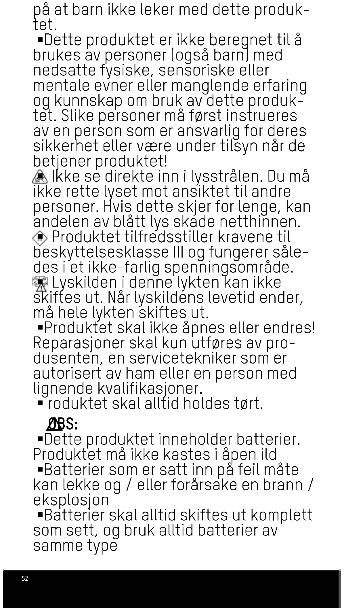 OBS: §Dette produktet inneholder batterier. Produktet må ikke kastes i åpen ild §Batterier som er satt inn på feil måte kan lekke og / eller forårsake en brann / eksplosjon §Batterier skal alltid skiftes ut komplett som sett, og bruk alltid batterier av samme type53 §Batterier skal oppbevares utilgjengelig for barn: Fare for svelging eller kvelning §Du må aldri forsøke å åpne, knuse, varme opp eller brenne et batteri §Batteriene skal ikke brukes hvis produk- tet ser ut til å være skadet §Batteriene kan ikke lades opp igjen §Brukte batterier / oppladbare batterier skal alltid kasseres i henhold til lokale lover eller forskrifter. §Ikke ta direkte på batterier som lekker. Hvis du likevel skulle komme i kontakt med batterivæske, skal du umiddelbart vaske det berørte stedet grundig med vann §Dersom batterivæsken har forårsaket en hudirritasjon eller om du får den i øyne- ne, må du umiddelbart kontakte lege §Ikke kortslutt batteriene! §Bruk av oppladbare batterier og batterier som er egnet for sterkstrøm er ikke til- latt på grunn av andre elektriske verdier. §Ta brukte eller tomme batterier umiddel- bart ut av lykten §Hvis lykten ikke kan brukes lenger, må batteriene tas ut av lykten før den leve- res til avfallsbehandling