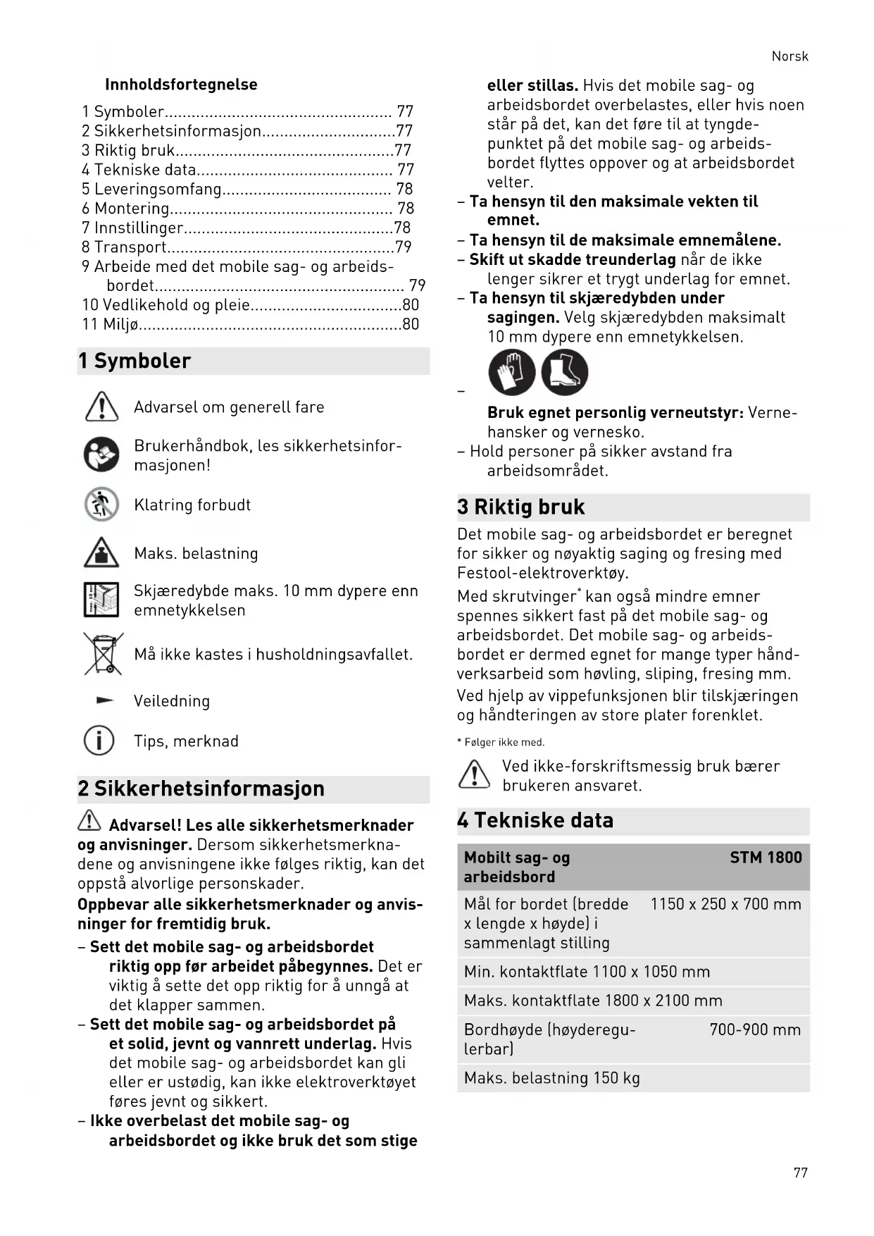 Bruk egnet personlig verneutstyr: Verne hansker og vernesko. – Hold personer på sikker avstand fra arbeidsområdet. 3 Riktig bruk Det mobile sag- og arbeidsbordet er beregnet for sikker og nøyaktig saging og fresing med Festool-elektroverktøy. Med skrutvinger