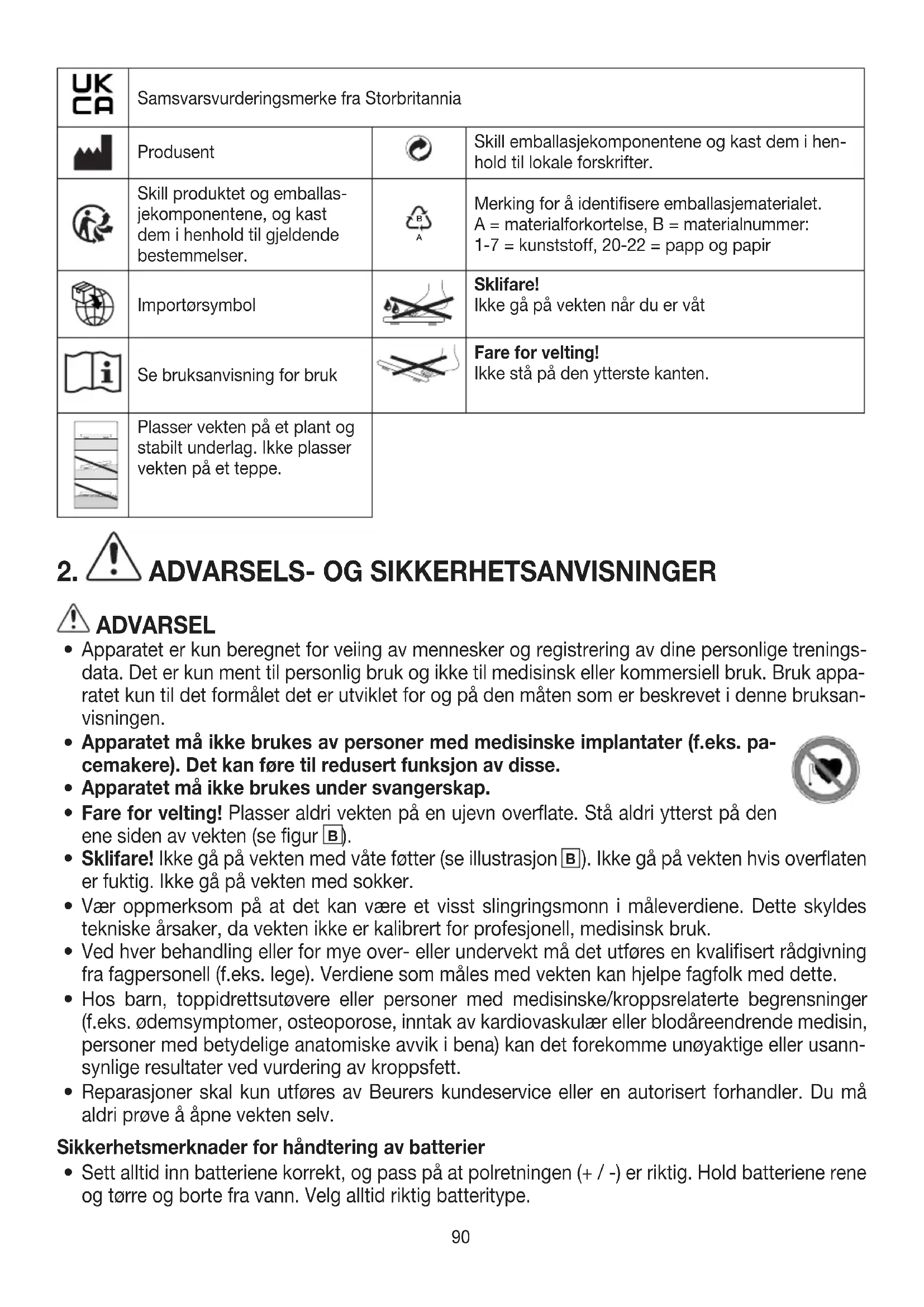 Merking for å identifisere emballasjematerialet. A = materialforkortelse, B = materialnummer: 1-7 = kunststoff, 20-22 = papp og papir Importørsymbol Sklifare! Ikke gå på vekten når du er våt Se bruksanvisning for bruk Fare for velting! Ikke stå på den ytterste kanten. Plasser vekten på et plant og stabilt underlag. Ikke plasser vekten på et teppe.