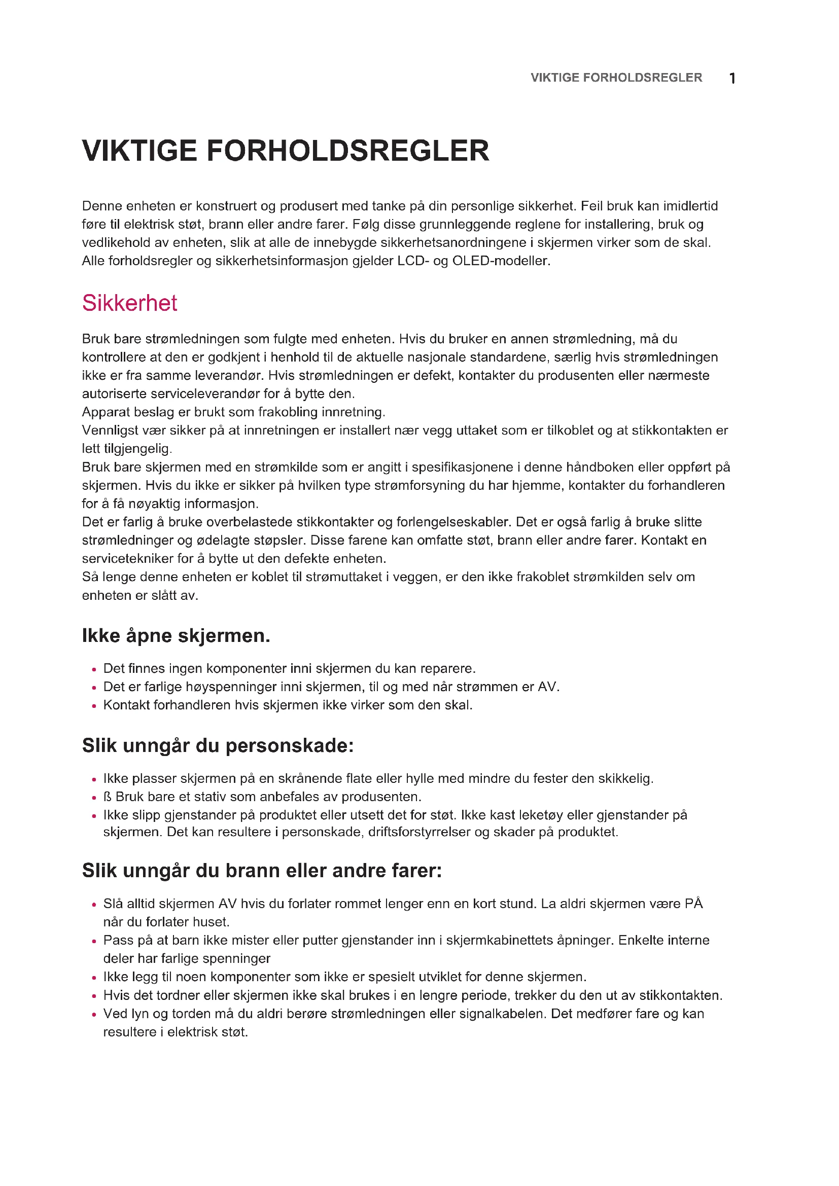 ÁGUA WaterCHemiCaliËn1 ENG NORSKVIKTIGE FORHOLDSREGLER VIKTIGE FORHOLDSREGLER Denne enheten er konstruert og produsert med tanke på din personlige sikkerhet. Feil bruk kan imidlertid føre til elektrisk støt, brann eller andre farer. Følg disse grunnleggende reglene for installering, bruk og vedlikehold av enheten, slik at alle de innebygde sikkerhetsanordningene i skjermen virker som de skal.Alle forholdsregler og sikkerhetsinformasjon gjelder LCD- og OLED-modeller. Sikkerhet Bruk bare strømledningen som fulgte med enheten. Hvis du bruker en annen strømledning, må du kontrollere at den er godkjent i henhold til de aktuelle nasjonale standardene, særlig hvis strømledningen ikke er fra samme leverandør. Hvis strømledningen er defekt, kontakter du produsenten eller nærmesteautoriserte serviceleverandør for å bytte den.Apparat beslag er brukt som frakobling innretning.Vennligst vær sikker på at innretningen er installert nær vegg uttaket som er tilkoblet og at stikkontakten er lett tilgjengelig.Bruk bare skjermen med en strømkilde som er angitt i spesifikasjonene i denne håndboken eller oppført på skjermen. Hvis du ikke er sikker på hvilken type strømforsyning du har hjemme, kontakter du forhandleren for å få nøyaktig informasjon.Det er farlig å bruke overbelastede stikkontakter og forlengelseskabler. Det er også farlig å bruke slitte strømledninger og ødelagte støpsler. Disse farene kan omfatte støt, brann eller andre farer. Kontakt en servicetekniker for å bytte ut den defekte enheten.Så lenge denne enheten er koblet til strømuttaket i veggen, er den ikke frakoblet strømkilden selv om enheten er slått av. Ikke åpne skjermen.