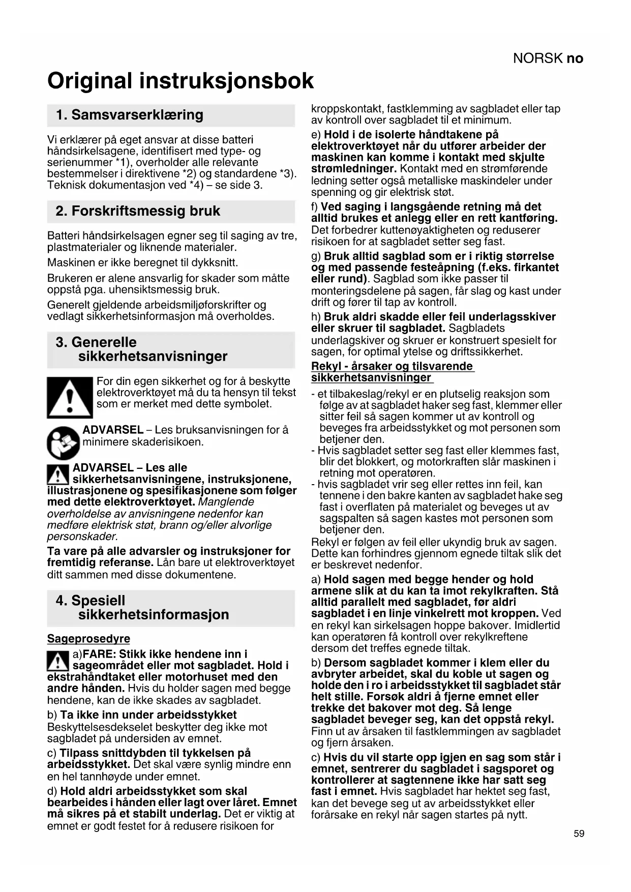 Original instruksjonsbok Vi erklærer på eget ansvar at disse batteri håndsirkelsagene, identifisert med type- og serienummer *1), overholder alle relevante bestemmelser i direktivene *2) og standardene *3). Teknisk dokumentasjon ved *4) – se side 3. Batteri håndsirkelsagen egner seg til saging av tre, plastmaterialer og liknende materialer. Maskinen er ikke beregnet til dykksnitt. Brukeren er alene ansvarlig for skader som måtte oppstå pga. uhensiktsmessig bruk. Generelt gjeldende arbeidsmiljøforskrifter og vedlagt sikkerhetsinformasjon må overholdes. For din egen sikkerhet og for å beskytte elektroverktøyet må du ta hensyn til tekst som er merket med dette symbolet. ADVARSEL – Les bruksanvisningen for å minimere skaderisikoen. ADVARSEL – Les alle sikkerhetsanvisningene, instruksjonene, illustrasjonene og spesifikasjonene som følger med dette elektroverktøyet. Manglende overholdelse av anvisningene nedenfor kan medføre elektrisk støt, brann og/eller alvorlige personskader. Ta vare på alle advarsler og instruksjoner for fremtidig referanse. Lån bare ut elektroverktøyet ditt sammen med disse dokumentene. Sageprosedyre a)FARE: Stikk ikke hendene inn i sageområdet eller mot sagbladet. Hold i ekstrahåndtaket eller motorhuset med den andre hånden. Hvis du holder sagen med begge hendene, kan de ikke skades av sagbladet. b) Ta ikke inn under arbeidsstykket Beskyttelsesdekselet beskytter deg ikke mot sagbladet på undersiden av emnet. c) Tilpass snittdybden til tykkelsen på arbeidsstykket. Det skal være synlig mindre enn en hel tannhøyde under emnet. d) Hold aldri arbeidsstykket som skal bearbeides i hånden eller lagt over låret. Emnet må sikres på et stabilt underlag. Det er viktig at emnet er godt festet for å redusere risikoen for kroppskontakt, fastklemming av sagbladet eller tap av kontroll over sagbladet til et minimum. e) Hold i de isolerte håndtakene på elektroverktøyet når du utfører arbeider der maskinen kan komme i kontakt med skjulte strømledninger. Kontakt med en strømførende ledning setter også metalliske maskindeler under spenning og gir elektrisk støt. f) Ved saging i langsgående retning må det alltid brukes et anlegg eller en rett kantføring. Det forbedrer kuttenøyaktigheten og reduserer risikoen for at sagbladet setter seg fast. g) Bruk alltid sagblad som er i riktig størrelse og med passende festeåpning (f.eks. firkantet eller rund). Sagblad som ikke passer til monteringsdelene på sagen, får slag og kast under drift og fører til tap av kontroll. h) Bruk aldri skadde eller feil underlagsskiver eller skruer til sagbladet. Sagbladets underlagskiver og skruer er konstruert spesielt for sagen, for optimal ytelse og driftssikkerhet. Rekyl - årsaker og tilsvarende sikkerhetsanvisninger - et tilbakeslag/rekyl er en plutselig reaksjon som følge av at sagbladet haker seg fast, klemmer eller sitter feil så sagen kommer ut av kontroll og beveges fra arbeidsstykket og mot personen som betjener den. - Hvis sagbladet setter seg fast eller klemmes fast, blir det blokkert, og motorkraften slår maskinen i retning mot operatøren. - hvis sagbladet vrir seg eller rettes inn feil, kan tennene i den bakre kanten av sagbladet hake seg fast i overflaten på materialet og beveges ut av sagspalten så sagen kastes mot personen som betjener den. Rekyl er følgen av feil eller ukyndig bruk av sagen. Dette kan forhindres gjennom egnede tiltak slik det er beskrevet nedenfor. a) Hold sagen med begge hender og hold armene slik at du kan ta imot rekylkraften. Stå alltid parallelt med sagbladet, før aldri sagbladet i en linje vinkelrett mot kroppen. Ved en rekyl kan sirkelsagen hoppe bakover. Imidlertid kan operatøren få kontroll over rekylkreftene dersom det treffes egnede tiltak. b) Dersom sagbladet kommer i klem eller du avbryter arbeidet, skal du koble ut sagen og holde den i ro i arbeidsstykket til sagbladet står helt stille. Forsøk aldri å fjerne emnet eller trekke det bakover mot deg. Så lenge sagbladet beveger seg, kan det oppstå rekyl. Finn ut av årsaken til fastklemmingen av sagbladet og fjern årsaken. c) Hvis du vil starte opp igjen en sag som står i emnet, sentrerer du sagbladet i sagsporet og kontrollerer at sagtennene ikke har satt seg fast i emnet. Hvis sagbladet har hektet seg fast, kan det bevege seg ut av arbeidsstykket eller forårsake en rekyl når sagen startes på nytt.