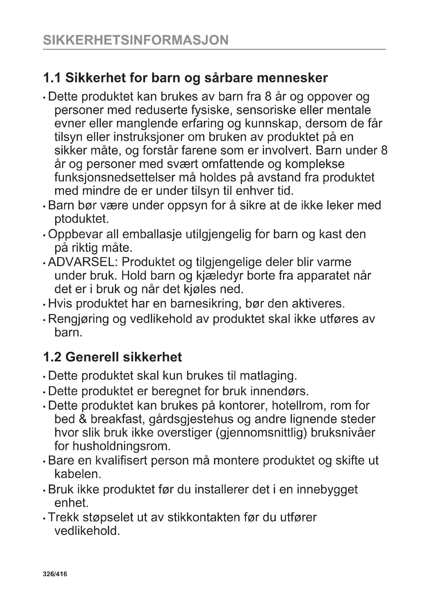 Les medfølgende instruksjoner nøye innen du installerer og bruker apparatet. Produsenten er ikke ansvarlig for personskader eller andre skader som følge av feilaktig montering eller bruk. Hold alltid instruksjonene på et trygt og tilgjengelig sted for fremtidig referanse. 325/416 SIKKERHETSINFORMASJON1.1 Sikkerhet for barn og sårbare mennesker