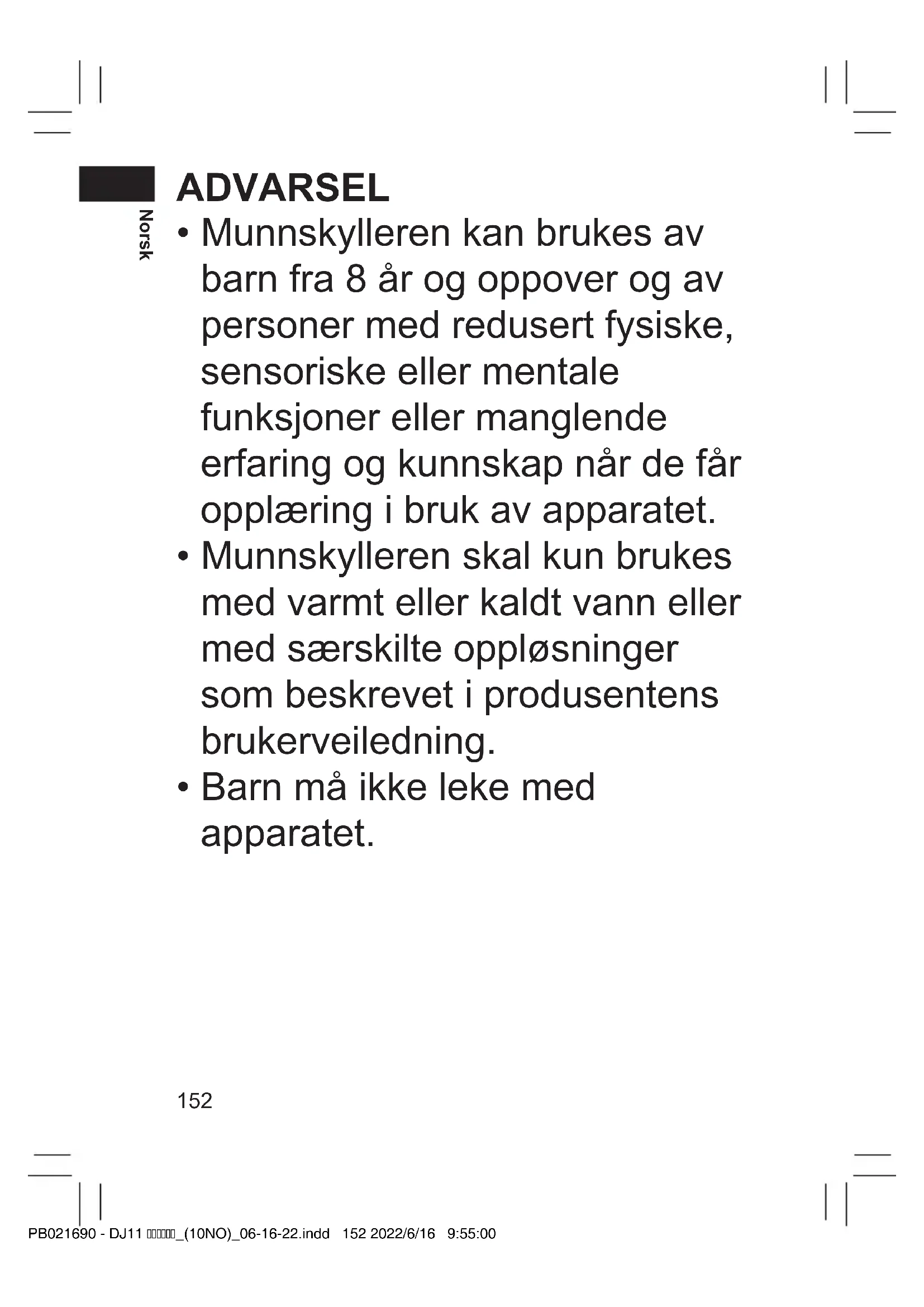 - Personer med dårlige munnsanser skal ikke bruke dette apparatet. - Hvis dette skjer kan det medføre skade eller ødeleggelse på tenner og tannkjøtt. Skal aldri brukes til annet enn munnskylling. - Hvis vannstrømmen rettes mot øyne, nesen, ørene, tungen eller halsen, kan det føre til en ulykke eller skader. Ikke fyll vannbeholderen med vann som er varmere enn 40 °C. - Dette kan medføre brannsår. Ikke del dysen med familiemedlemmer eller andre personer. - Dette kan medføre en infeksjon eller betennelse. Ikke mist i gulvet eller utsett den for støt. - Dette kan medføre skade. PB021690 - DJ11 _(10NO)_06-16-22.indd 154 2022/6/16 9:55:00155 Norsk FORSIKTIG Batteriets forsyningsterminaler skal ikke kortsluttes. - Dette kan medføre brannsår eller skade. Personer som kan ha periodonti, som er under tannbehandling eller som er bekymret for symptomer i munnen må konsultere tannlege før bruk. - Hvis ikke kan dette medføre skade eller ødeleggelse på tenner og tannkjøtt. Etter bruk, rengjør hoveddelen, tanken og dysen og tørk dem. - Hvis ikke kan dette skade helsen din på grunn av forplantning av mugg og bakterier.