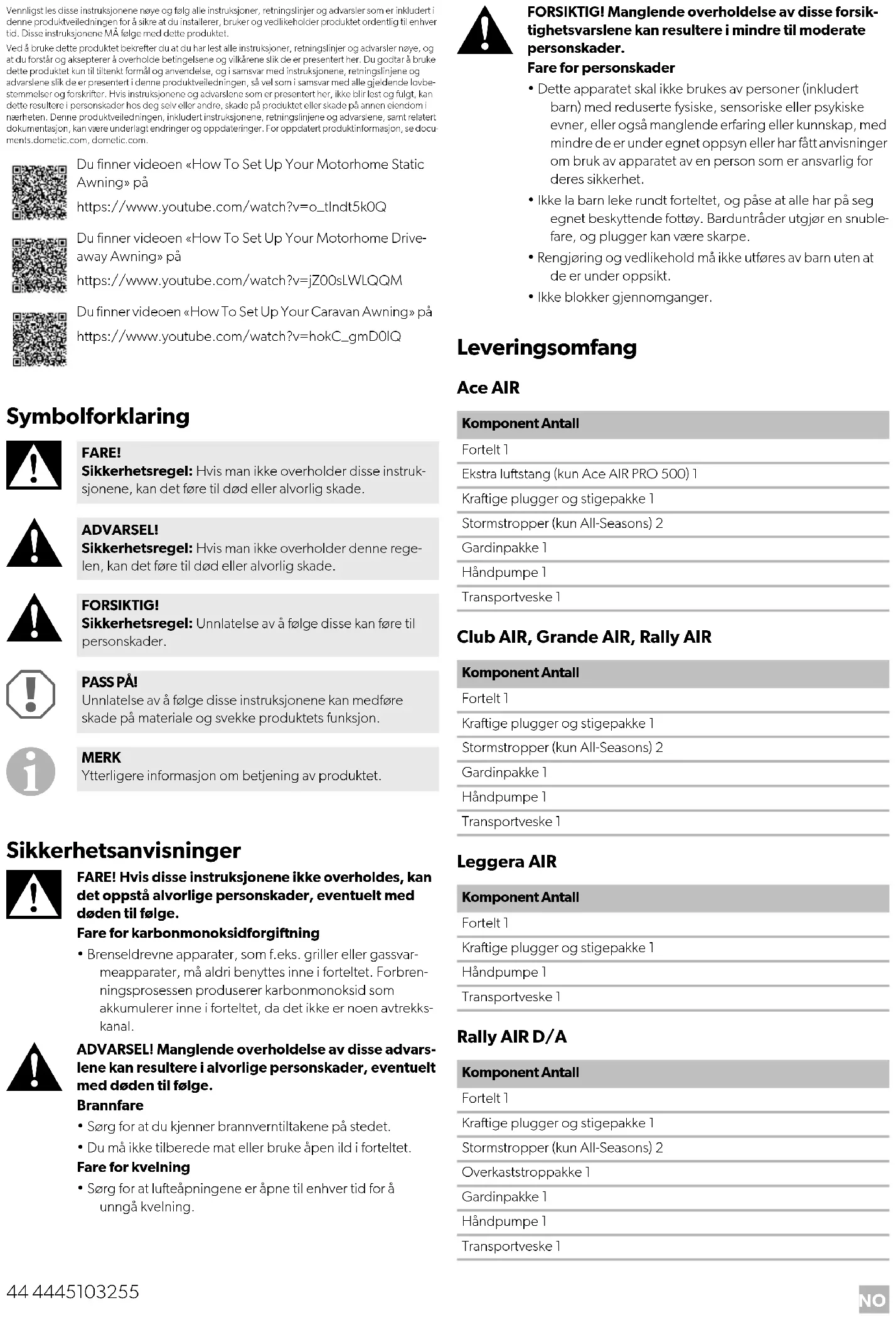 Vennligst les disse instruksjonene nøye og følg alle instruksjoner, retningslinjer og advarsler som er inkludert i denne produktveiledningen for å sikre at du installerer, bruker og vedlikeholder produktet ordentlig til enhver tid. Disse instruksjonene MÅ følge med dette produktet. Ved å bruke dette produktet bekrefter du at du har lest alle instruksjoner, retningslinjer og advarsler nøye, og at du forstår og aksepterer å overholde betingelsene og vilkårene slik de er presentert her. Du godtar å bruke dette produktet kun til tiltenkt formål og anvendelse, og i samsvar med instruksjonene, retningslinjene og advarslene slik de er presentert i denne produktveiledningen, så vel som i samsvar med alle gjeldende lovbe- stemmelser og forskrifter. Hvis instruksjonene og advarslene som er presentert her, ikke blir lest og fulgt, kan dette resultere i personskader hos deg selv eller andre, skade på produktet eller skade på annen eiendom i nærheten. Denne produktveiledningen, inkludert instruksjonene, retningslinjene og advarslene, samt relatert dokumentasjon, kan være underlagt endringer og oppdateringer. For oppdatert produktinformasjon, se docu- ments.dometic.com, dometic.com. Symbolforklaring