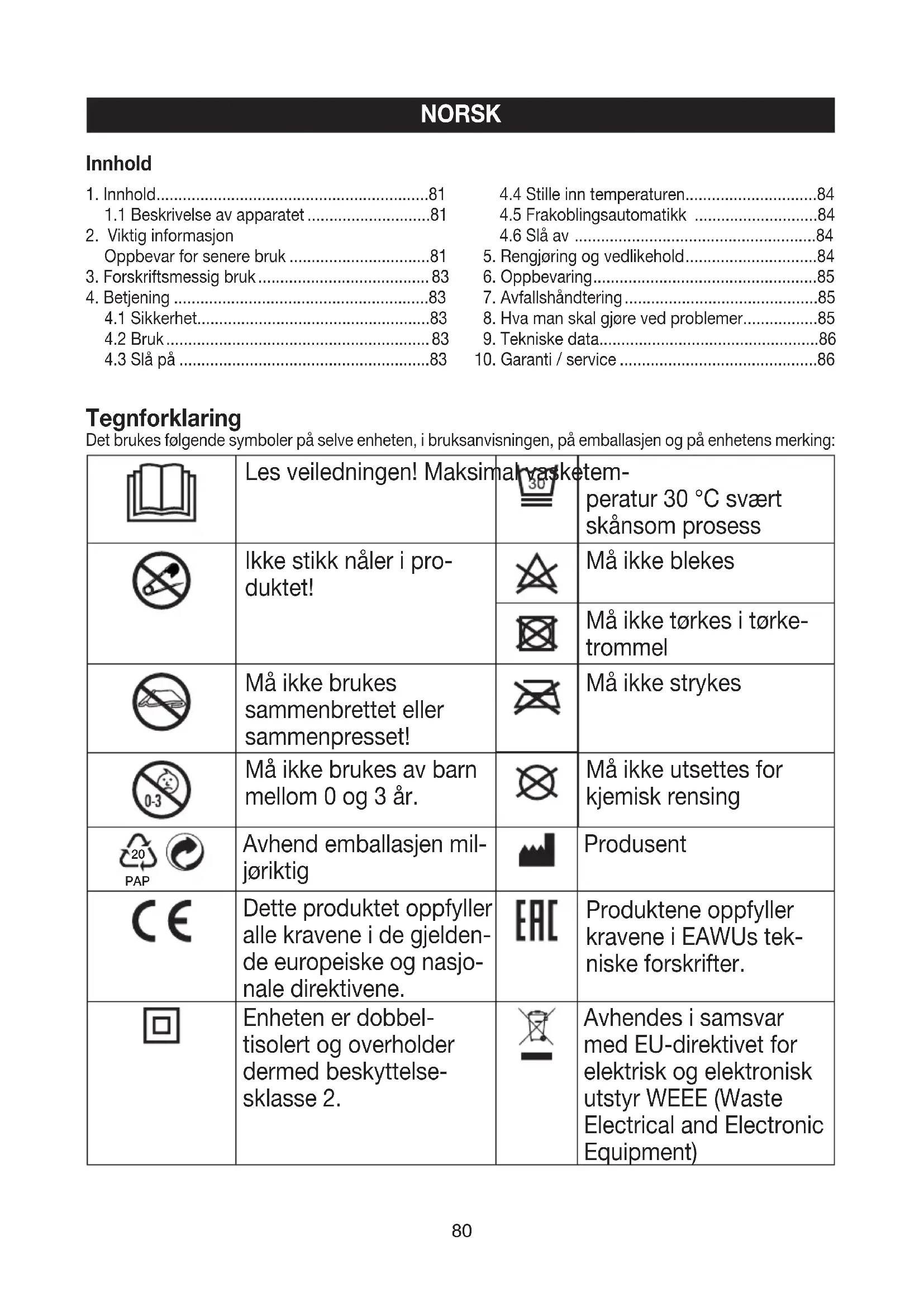 Innhold81 KEMA KEUR merket dokumenterer sikkerheten og sam- svar med en standard for elektriske produkter. Samsvarsvurderingsmerke fra Storbritannia Tekstilene som benyttes ved dette apparatet oppfyller de høye humanøkologiske krav i Oeko-Tex Standard 100, som påvist av Forschungsinstitut Hohenstein. ADVARSEL; Farehenvisning til fare for skader eller fare for din helse. OBS; Sikkerhetshenvisning til mulige skader på apparat/ tilbehør. HENVISNING; Henvisning til viktig informasjon.