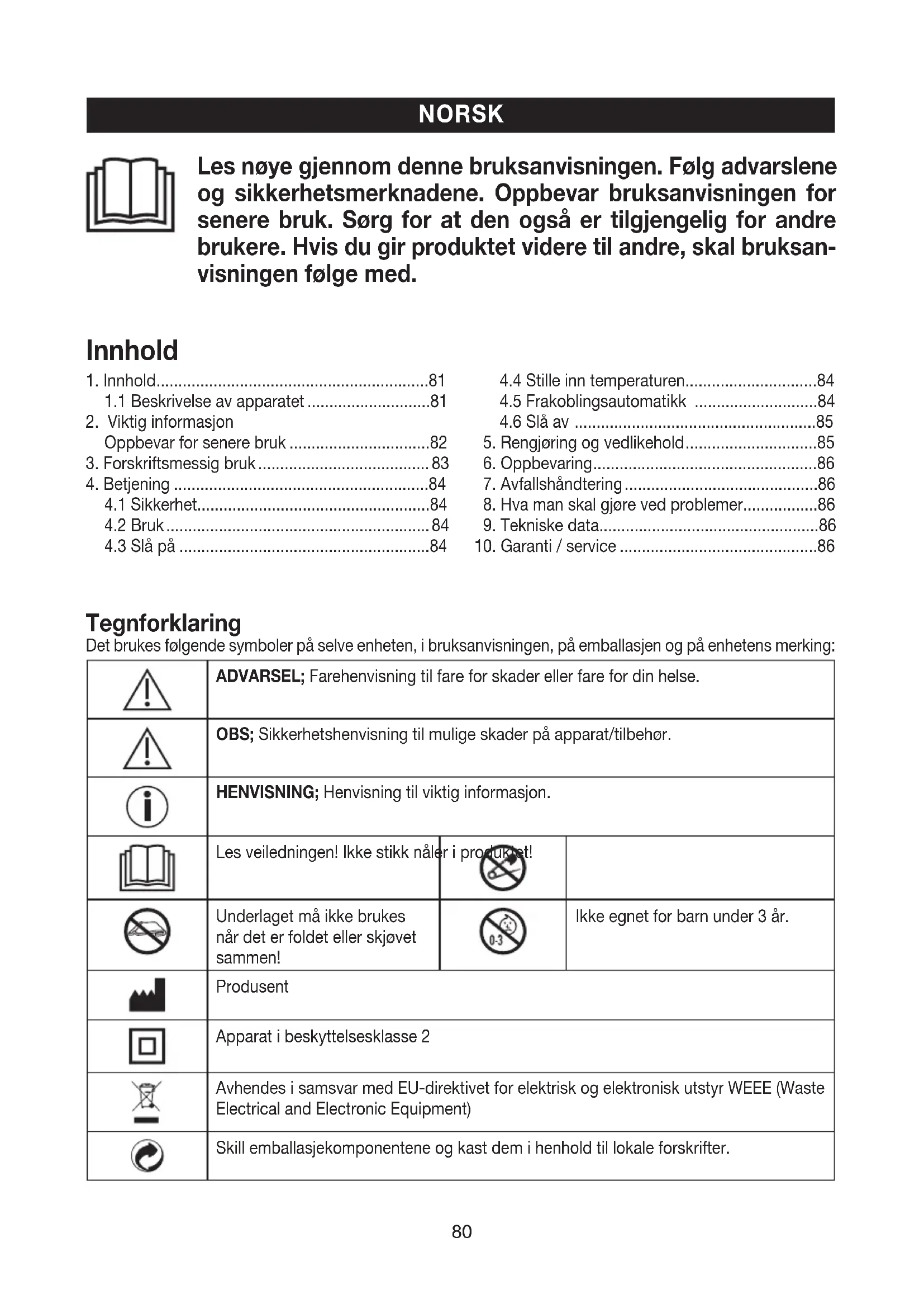 - Det er viktig at du følger instruksjonene i følgende kapitler: Betjening, rengjøringog pleie, oppbevaring.