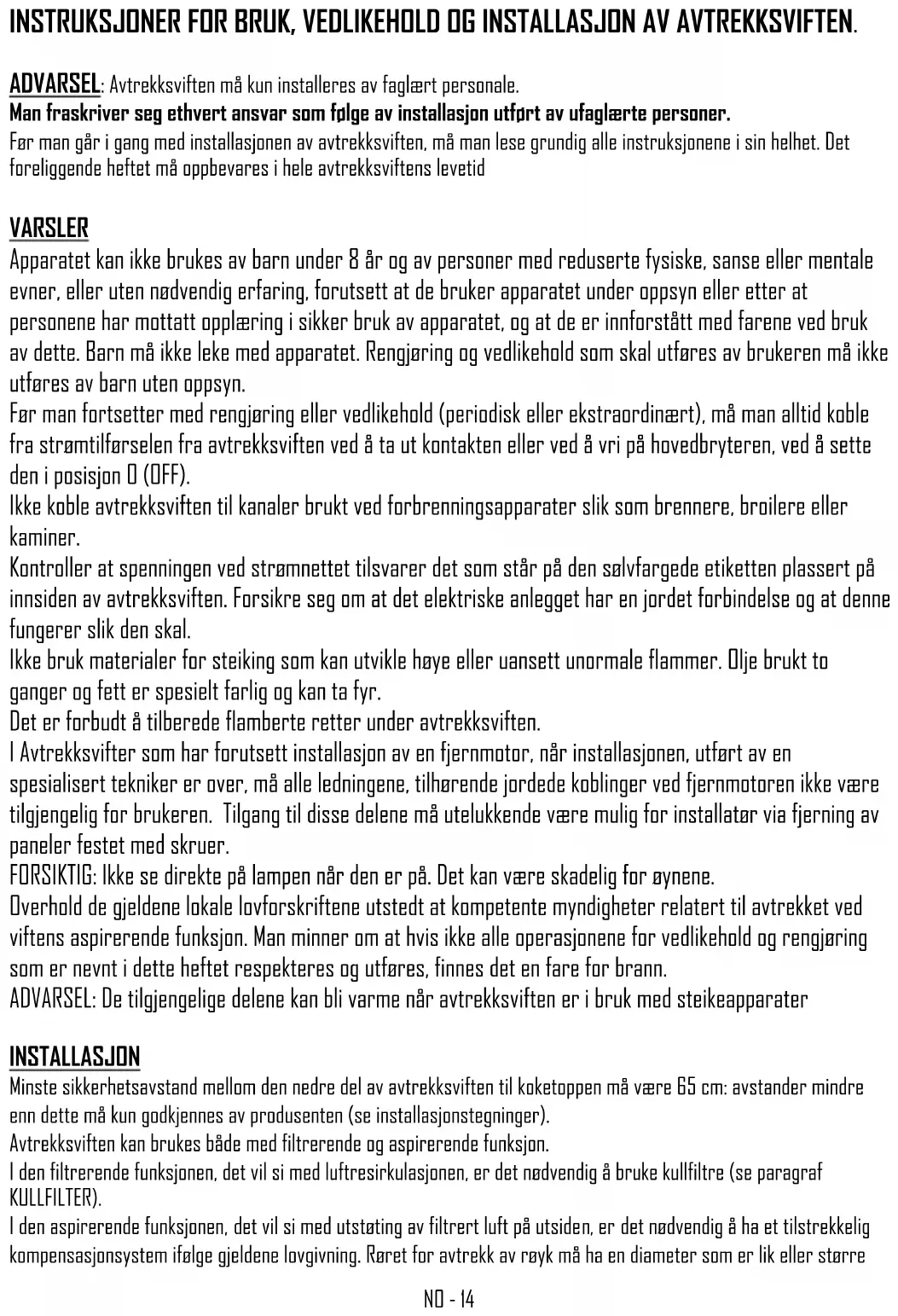 Før man utfører ethvert inngrep av rengjøring eller vedlikehold av avtrekksviften må man sette hovedbryteren i posisjon 0 (OFF). Utskiftning lyspærer Spotlight led: Utskiftningen av led spotlight må kun utføres av kvalifiserte teknikere ved og kun bruke originale reservedeler. Rengjøring av metalliske filtre De metalliske filtrene som følger med avtrekksviften må vaskes hver 2-3 måned, avhengig av bruksintensiteten, med varmt vann og ikke-aggressivt flytende oppvaskmiddel. De metalliske filtrene må tas av ved å bruke håndtaket ved og hekte av filteret først ved den nedre delen og så dra den oppover. Etter vasking av filtrene må disse tørkes fullstendig og monteres på riktig måte. Kullfilter Hvis avtrekksviften er utstyrt med et filtrerende system med intern resirkulasjon, er det nødvendig å bruke kullfilter som er beholdere for aktivt kull. Det aktive kullet som finnes i filteret brukes til å holde på røyklukt fra matlagingen. For fjerning og utskiftning av filtrene, må man se fig