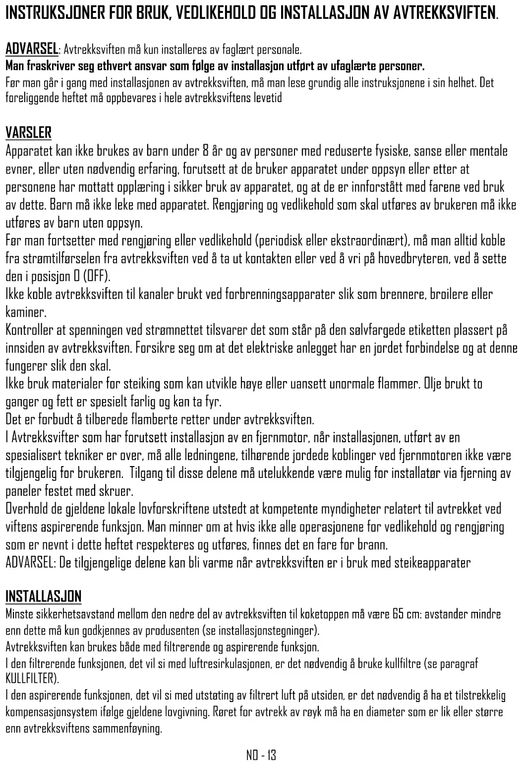 Før man utfører ethvert inngrep av rengjøring eller vedlikehold av avtrekksviften må man sette hovedbryteren i posisjon 0 (OFF). Utskiftning lyspærer Halogen 12V G4-tråd: Fjern, ved bruk av et skrujern, festeringen for glasset (Fig. 5). Fjern glasset og skift ut lyspærenNO - 16 med en helt lik. Monter beskyttelsesglasset på nytt og fest det ved å sette inn festeringen på nytt. Lyspærene kan kjøpes hos hvilken som helst el-butikk. Dikrotisk lyspære GU4-tråd: Fjern, ved bruk av et skrujern, glasset og skift ut lyspæren med en helt lik (Fig. 6). Spotlight led: Utskiftningen av led spotlight må kun utføres av kvalifiserte teknikere ved og kun bruke originale reservedeler. Rengjøring av metalliske filtre De metalliske filtrene som følger med avtrekksviften må vaskes hver 2-3 måned, avhengig av bruksintensiteten, med varmt vann og ikke-aggressivt flytende oppvaskmiddel. De metalliske filtrene må tas av ved å bruke håndtaket ved og hekte av filteret først ved den nedre delen og så dra den oppover (fig. 7). Etter vasking av filtrene må disse tørkes fullstendig og monteres på riktig måte. Kullfilter Hvis avtrekksviften er utstyrt med et filtrerende system med intern resirkulasjon, er det nødvendig å bruke kullfilter som er beholdere for aktivt kull. Det aktive kullet som finnes i filteret brukes til å holde på røyklukt fra matlagingen. For fjerning og utskiftning av filtrene, må man se fig.8. Kullfiltrene POLYESTER kan ikke regenereres eller vaskes og må skiftes periodisk ut (hver 4. måned hvis man bruker avtrekksviften i to timer pr. dag). Filtre som er fulle av fett kan være årsaken til branntilløp. Avhengig av avtrekksviftemodellen, kan kullfiltrene enten være runde eller firkantede. Kullfiltrene LONG LIFE må periodisk vaskes og regenereres. Filteret må rengjøres hver andre måned hvis det brukes på normal måte. Det er best å vaske filteret i oppvaskmaskin på maksimal temperatur med normalt oppvaskmiddel. Filteret må vaskes alene for å unngå at matpartikler kommer inn i det, noe som deretter forårsaker vond lukt. For å aktivere kullfilteret på nytt, må filteret tørkes i ovn. Velg over / undervarme på maksimalt 100 °C og tørk filteret i 10 minutter. Filteret må skiftes ut når det ikke lenger er i stand til å absorbere matlukten på en tilstrekkelig måte. Fig.9 Rengjøring av avtrekksviften Periodisk rengjøring av overflaten hindrer at man senere må fjerne vanskelige skorper av skitt. Hvis avtrekksviften er lakkert eller kobberfarget, må man bruke en myk klut med lunkent vann og et nøytralt vaskemiddel. Det er forbudt å helle væske direkte på avtrekksviften og bruk av kornete og/eller slipende produkter. Hvis avtrekksviften er i rustfritt stål, må man bruke spesifikke produkter og kluter for satinert rustfritt stål (ikke slipende og/eller etsende og frie for klor), mens man er nøye med å stryke kluten i satinmatteringens retning. Ikke bruk aggressive produkter, kjemiske løsemidler eller produkter laget av destillert petroleum som kan etterlate oljerester som kan oksidere og polymerisere. Kondensering i avtrekksviften Induksjonsplatene eller platene i glasskeramikk varmer opp maten meget rask og generer damp fra matlagingen før overflaten i glass eller stål ved avtrekksviften har varmet seg opp. Dette skaper kondensering på avtrekksviften med påfølgende drypping. En annen årsak til kondensering kan være at avtrekksrøret for dampen ikke er i den størrelsen som er anbefalt av oss (se paragrafen INSTALLASJON). Dampen som forblir inne i avtrekksviften under avkjøling kondenserer og drypper. Man anbefaler å skru på avtrekksviften ti minutter før man starter matlagingen og når man er ferdig, la avtrekksviften stå på slik at all damp som har samlet seg i kanalen kan slippes ut. I tillegg er det meget viktig å se til regelmessig rengjøring av filtrene og, i tilfelle forringelse, skifte dem ut (se RENGJØRING AV MELLISKE FILTERE). Produsenten har ikke ansvar for estetiske skader grunnet manglende overholdelse av indikasjonene ovenfor.IT - 17 ISTRUZIONI PER L’USO, MANUTENZIONE E INSTALLAZIONE DELLA CAPPA. ATTENZIONE: La cappa deve essere installata unicamente da personale abilitato. Si declina ogni responsabilità in merito ad installazioni eseguite da persone prive di abilitazione. Prima di procedere con l'installazione della cappa, leggere attentamente ed integralmente queste istruzioni. Il pre- sente libretto deve essere conservato per tutta la vita della cappa. AVVERTENZE L’apparecchio può essere utilizzato da bambini di età non inferiore a 8 anni e da persone con ridotte capa- cità fisiche, sensoriali o mentali, o prive di esperienza o della necessaria conoscenza, purché sotto sorve- glianza oppure dopo che le stesse abbiano ricevuto istruzioni relative all’uso sicuro dell’apparecchio e alla comprensione dei pericoli ad esso inerenti. I bambini non devono giocare con l’apparecchio. La pulizia e la manutenzione destinata ad essere effettuata dall’utilizzatore non deve essere effettuata da bambini senza sorveglianza. Prima di procedere alla pulizia o alla manutenzione (periodica o straordinaria) togliere sempre l'alimenta- zione elettrica alla cappa staccando la spina o agendo sull'interruttore generale portandolo in posizione 0 (OFF). Non collegare la cappa a condotti utilizzati per apparecchi a combustione come bruciatori, caldaie o cami- netti. Verificare che la tensione della rete corrisponda a quanto previsto sull'etichetta argentata posta all'inter- no della cappa. Accertarsi che l'impianto elettrico sia realizzato con lo scarico a terra e che lo stesso sia efficiente. Non utilizzare per la cottura materiali che possono sviluppare fiamme alte o comunque anomale. L'olio usato due volte e grassi sono particolarmente pericolosi e potrebbero infiammarsi. E' vietato preparare alimenti flambè sotto la cappa. Nelle Cappe previste per l'installazione di un motore remoto, terminata l'installazion