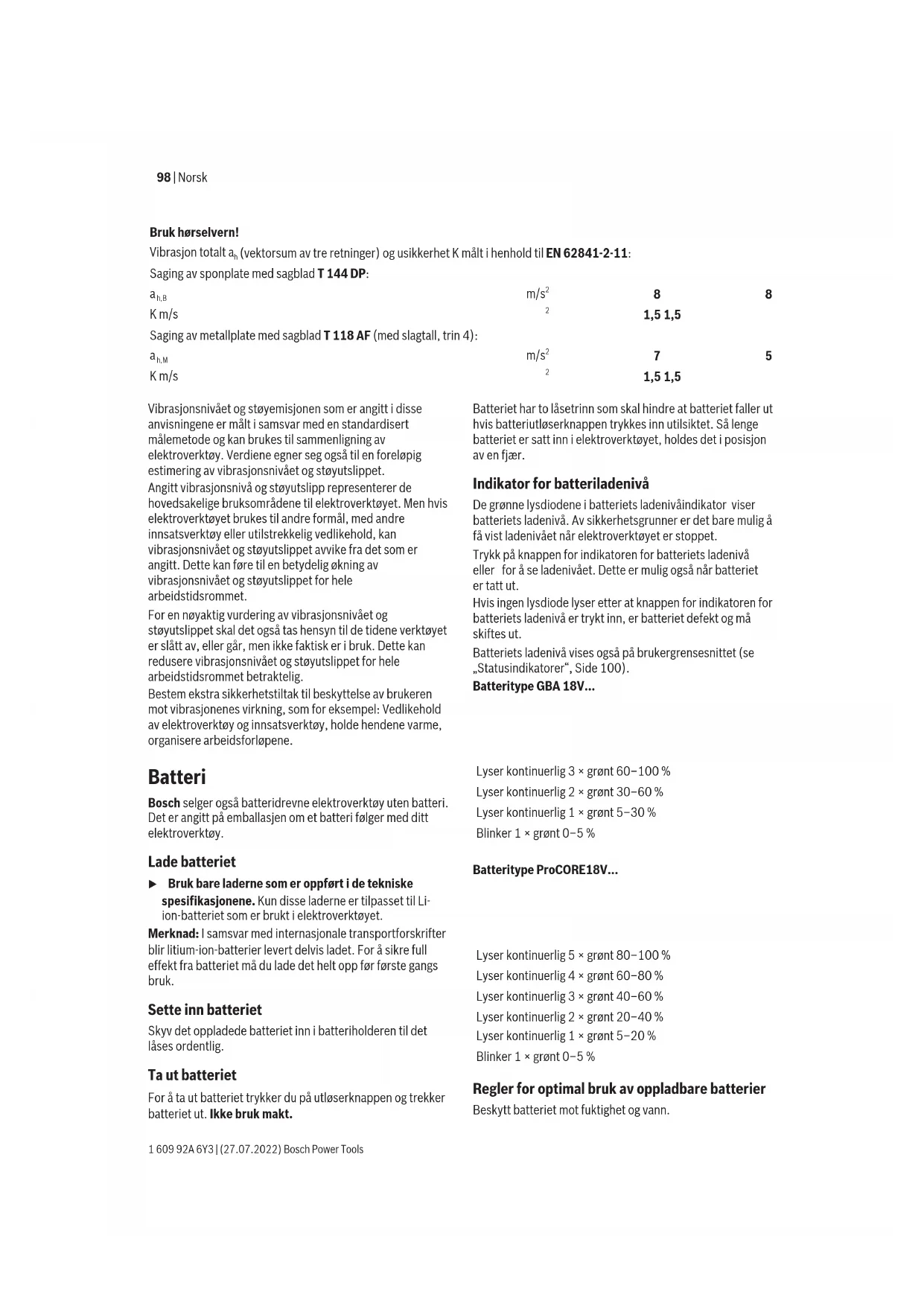1,5 1,5 Vibrasjonsnivået og støyemisjonen som er angitt i disse anvisningene er målt i samsvar med en standardisert målemetode og kan brukes til sammenligning av elektroverktøy. Verdiene egner seg også til en foreløpig estimering av vibrasjonsnivået og støyutslippet. Angitt vibrasjonsnivå og støyutslipp representerer de hovedsakelige bruksområdene til elektroverktøyet. Men hvis elektroverktøyet brukes til andre formål, med andre innsatsverktøy eller utilstrekkelig vedlikehold, kan vibrasjonsnivået og støyutslippet avvike fra det som er angitt. Dette kan føre til en betydelig økning av vibrasjonsnivået og støyutslippet for hele arbeidstidsrommet. For en nøyaktig vurdering av vibrasjonsnivået og støyutslippet skal det også tas hensyn til de tidene verktøyet er slått av, eller går, men ikke faktisk er i bruk. Dette kan redusere vibrasjonsnivået og støyutslippet for hele arbeidstidsrommet betraktelig. Bestem ekstra sikkerhetstiltak til beskyttelse av brukeren mot vibrasjonenes virkning, som for eksempel: Vedlikehold av elektroverktøy og innsatsverktøy, holde hendene varme, organisere arbeidsforløpene. Batteri Bosch selger også batteridrevne elektroverktøy uten batteri. Det er angitt på emballasjen om et batteri følger med ditt elektroverktøy. Lade batteriet u Bruk bare laderne som er oppført i de tekniske spesifikasjonene. Kun disse laderne er tilpasset til Li- ion-batteriet som er brukt i elektroverktøyet. Merknad: I samsvar med internasjonale transportforskrifter blir litium-ion-batterier levert delvis ladet. For å sikre full effekt fra batteriet må du lade det helt opp før første gangs bruk. Sette inn batteriet Skyv det oppladede batteriet inn i batteriholderen til det låses ordentlig. Ta ut batteriet For å ta ut batteriet trykker du på utløserknappen og trekker batteriet ut. Ikke bruk makt. Batteriethar tolåsetrinn som skal hindre at batteriet faller ut hvis batteriutløserknappentrykkes inn utilsiktet. Så lenge batteriet er satt inn i elektroverktøyet, holdes det i posisjon av en fjær. Indikator for batteriladenivå De grønne lysdiodene i batteriets ladenivåindikator viser batteriets ladenivå. Av sikkerhetsgrunner er det bare mulig å få vist ladenivået når elektroverktøyet er stoppet. Trykk på knappen for indikatoren for batteriets ladenivå eller for å se ladenivået. Dette er mulig også når batteriet er tatt ut. Hvis ingen lysdiode lyser etter at knappen for indikatoren for batteriets ladenivå er trykt inn, er batteriet defekt og må skiftes ut. Batteriets ladenivå vises også på brukergrensesnittet (se „Statusindikatorer“, Side100). Batteritype GBA 18V... Lysdiode Kapasitet Lyser kontinuerlig 3 × grønt 60–100% Lyser kontinuerlig 2 × grønt 30–60% Lyser kontinuerlig 1 × grønt 5–30% Blinker 1 × grønt 0–5% Batteritype ProCORE18V... Lysdiode Kapasitet Lyser kontinuerlig 5 × grønt 80–100% Lyser kontinuerlig 4 × grønt 60–80% Lyser kontinuerlig 3 × grønt 40–60% Lyser kontinuerlig 2 × grønt 20–40% Lyser kontinuerlig 1 × grønt 5–20% Blinker 1 × grønt 0–5% Regler for optimal bruk av oppladbare batterier Beskytt batteriet mot fuktighet og vann. 1 609 92A 6Y3 | (27.07.2022) Bosch Power ToolsNorsk | 99 Batteriet må oppbevares ved temperatur fra −20°C til 50°C. Du må for eksempel ikke la det ligge i bilen om sommeren. Rengjør ventilasjonsslissene på batteriet regelmessig med en myk, ren og tørr pensel. En vesentlig kortere driftstid etter oppladingen er et tegn på at batteriet er oppbrukt og må skiftes ut. Følg anvisningene om kassering. Montering u Ta alltid batteriet ut av elektroverktøyet før arbeider på elektroverktøyet utføres (f.eks. vedlikehold, verktøyskifte osv.) og før transport og oppbevaring. Det er fare for skader hvis du trykker på av/på-bryteren ved en feiltagelse. Sette inn / bytte sagblad u Bruk vernehansker ved montering eller bytte av innsatsverktøy. Innsatsverktøyene er skarpe og kan bli varme ved langvarig bruk. Velge sagblad Du finner en oversikt over anbefalte sagblad sist i denne veiledningen. Bruk bare sagblad med T-skaft. Sagbladet skal ikke være lenger enn nødvendig for dette snittet. Bruk et smalt sagblad til saging i smale kurver. Sette inn sagblad og tilpasse sagbladføring (sebildeA–