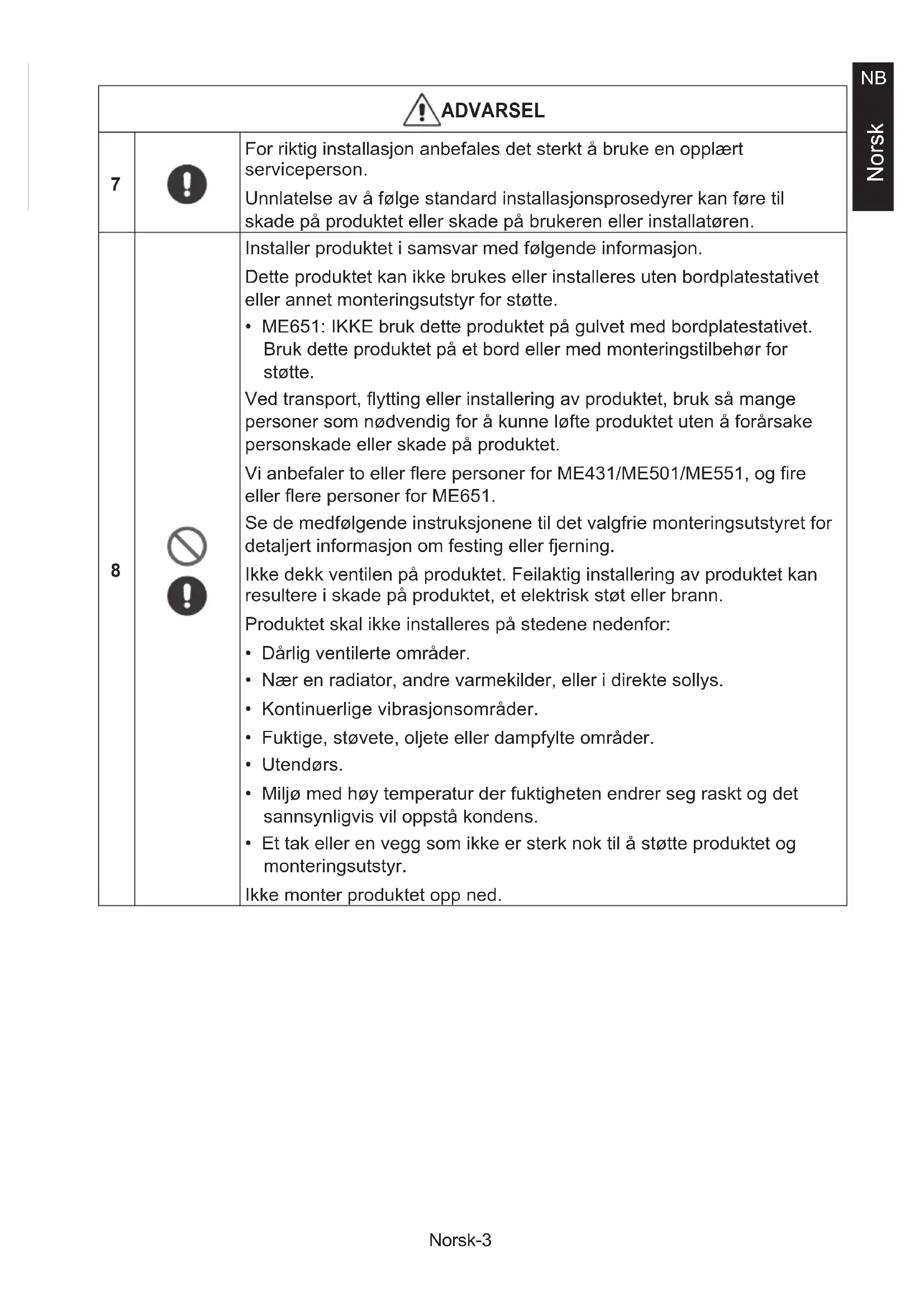 - ME651: IKKE bruk dette produktet på gulvet med bordplatestativet. Bruk dette produktet på et bord eller med monteringstilbehør for støtte. Ved transport, ytting eller installering av produktet, bruk så mange personer som nødvendig for å kunne løfte produktet uten å forårsake personskade eller skade på produktet. Vi anbefaler to eller ere personer for ME431/ME501/ME551, og re eller ere personer for ME651. Se de medfølgende instruksjonene til det valgfrie monteringsutstyret for detaljert informasjon om festing eller fjerning. Ikke dekk ventilen på produktet. Feilaktig installering av produktet kan resultere i skade på produktet, et elektrisk støt eller brann. Produktet skal ikke installeres på stedene nedenfor:
