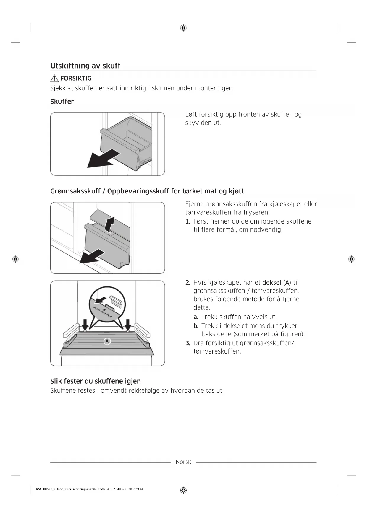 01 Topphengsel 02 Pakning 03 Skuff 04 Bunnhengsel 05 Strekkodeetikett RS8000NC_2Door_User-servicing-manual.indb 2 2021-01-27 7:39:43Norsk Utskiftning av pakning FORSIKTIG Fest pakningen godt. Ellers kan kald luft lekke fra kjøleskapet. Slik erner du pakningen Åpne døren og ta ut pakningen fra døren. Slik bytter du pakningen Fest en ny pakning til kjøleskapsdøren. Kontroller at det ikke er noe mellomrom mellom den nye pakningen og døren. RS8000NC_2Door_User-servicing-manual.indb 3 2021-01-27 7:39:44Norsk Utskiftning av skuff FORSIKTIG Sjekk at skuffen er satt inn riktig i skinnen under monteringen. Skuffer Løft forsiktig opp fronten av skuffen og skyv den ut. Grønnsaksskuff / Oppbevaringsskuff for tørket mat og kjøtt Fjerne grønnsaksskuffen fra kjøleskapet eller tørrvareskuffen fra fryseren: