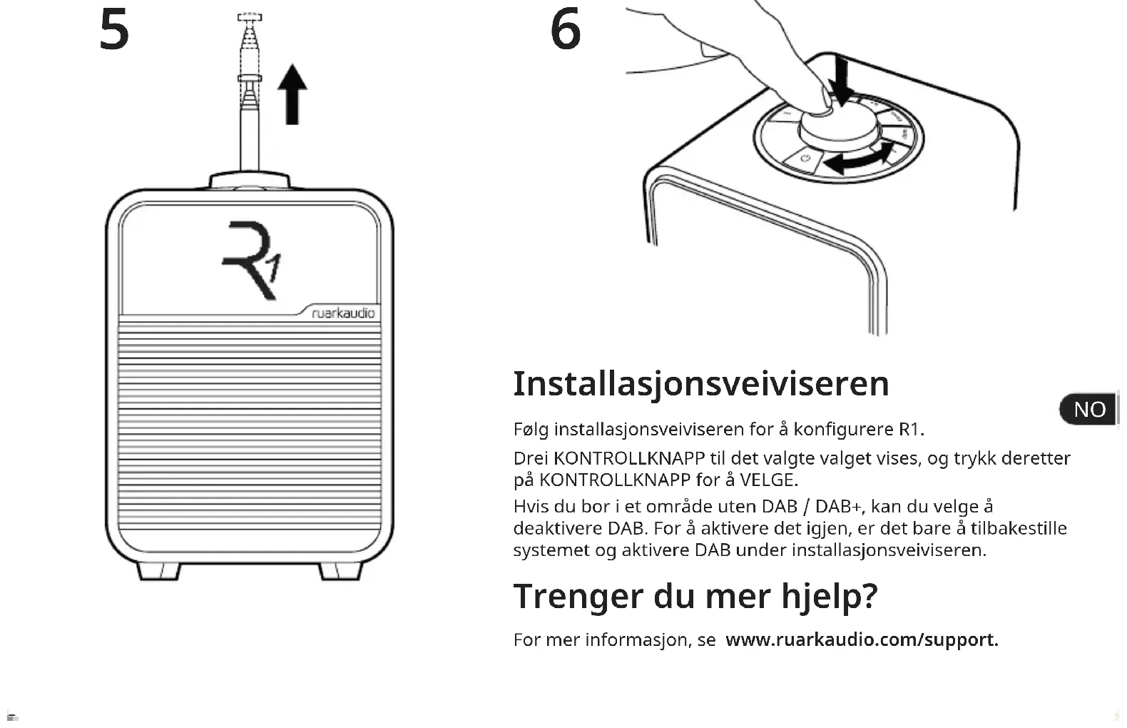 Koble til en annen enhet MENU > Koble til enhet Velg Ny eller vri på KONTROLLKNAPPEN for å velge en av de eksisterende enhetene i sammenkoblingslisten. Pare ere enheter Du kan pare opptil 8 enheter, selv om du bare vil kunne spille av lyd fra en enhet om gangen Slette listen over sammenkoblede enheter MENU > Glem enheter Hvis du har problemer med å koble til Bluetooth-enheten, anbefaler vi at du fjerner all sammenkoblingsinformasjon. Du må også slette “Ruark R1” fra listen over parede enheter på Bluetooth-enheten din før du kobler den til R1 igjen. For mer informasjon, se dokumentasjonen til Bluetooth-enheten. For hjelp med bruk av Bluetooth, besøk www.ruarkaudio.com/support Merk: Du kan ikke bruke Bluetooth-funksjonen på din R1 for å koble til Bluetooth-hodetelefonerDAB-radio Første gang du bruker DAB på R1, eller hvis DAB- stasjonslisten er tom, vil den automatisk utføre en stasjonsskanning for å lage en liste over tilgjengelige stasjoner. Bytte radiostasjon Trykk på eller for å vise stasjonslisten. Ved å trykke på den igjen vises neste eller forrige stasjon, for å stille inn til en stasjon, velg den ved å trykke på KONTROLLKNAPPEN, eller vent noen sekunder til den automatisk velger. Når stasjonslisten er vist, kan du også bla gjennom listen ved å vri på KONTROLLKNAPPEN og velge en stasjon ved å trykke på knappen. Du kan også vise stasjonslisten ved å velge MENU > Stasjonsliste. DAB-radiotekst (DLS) MENU > Info Velg hvilken programinformasjon som skal vises. Lagre forhåndsinnstilling Du kan lagre 8 DAB-stasjoner i den forhåndsinnstilte listen. Se delen “Vanlige funksjoner”. Hent forhåndsinnstilling Se delen “Vanlige funksjoner”. Stasjonssøk MENU > Stasjonssøk Vi anbefaler at du regelmessig oppdaterer stasjonslisten med en stasjonsskanning. Hvis stasjonslisten er tom, vil radioen automatisk utføre en stasjonsskanning så snart du bytter til DAB. For optimalt mottak, trekk antennen helt ut og justere dennes posisjon.EN