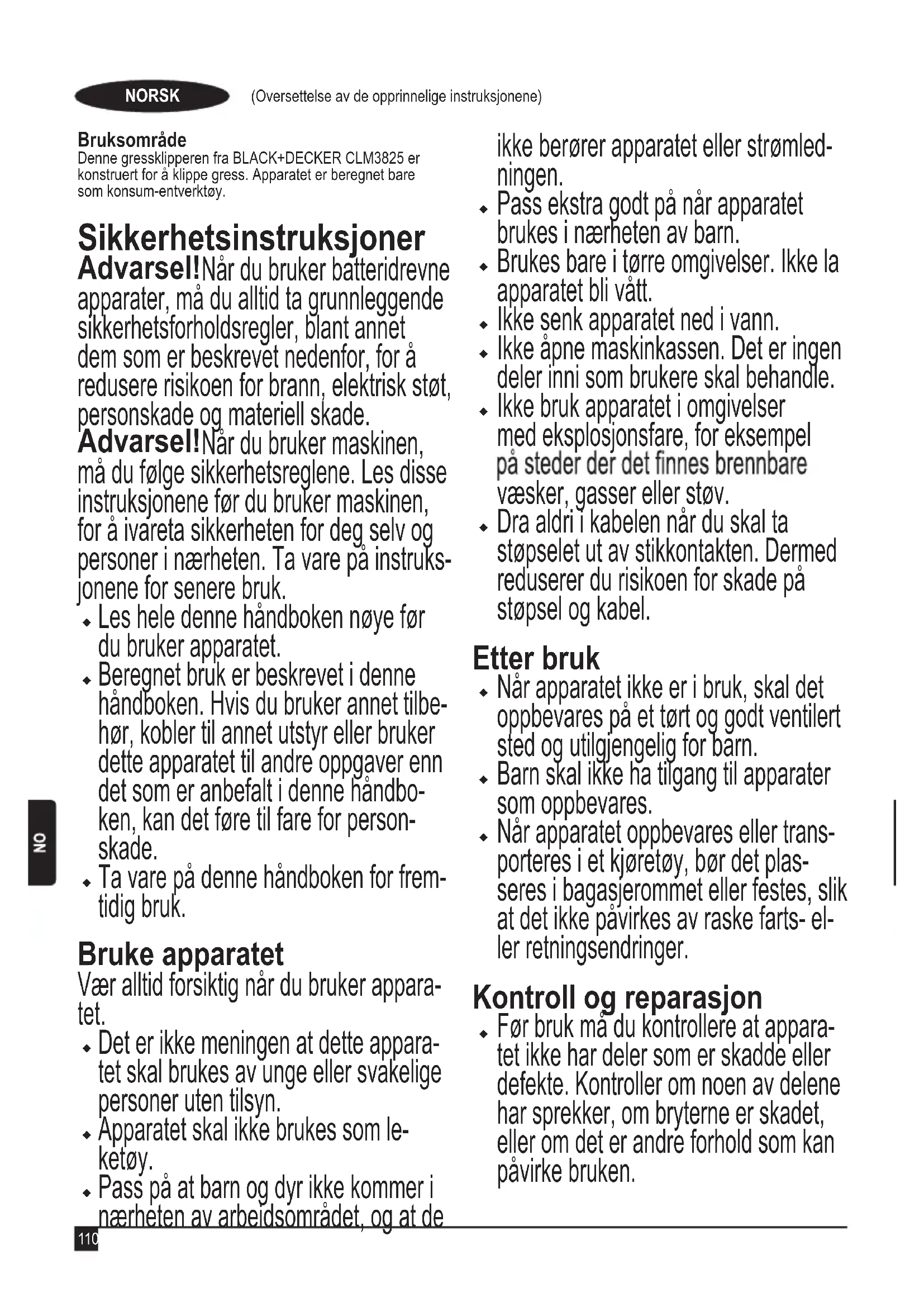 Før bruk må du kontrollere at appara- tet ikke har deler som er skadde eller defekte. Kontroller om noen av delene har sprekker, om bryterne er skadet, eller om det er andre forhold som kan påvirke bruken. (Oversettelse av de opprinnelige instruksjonene) NORSK111