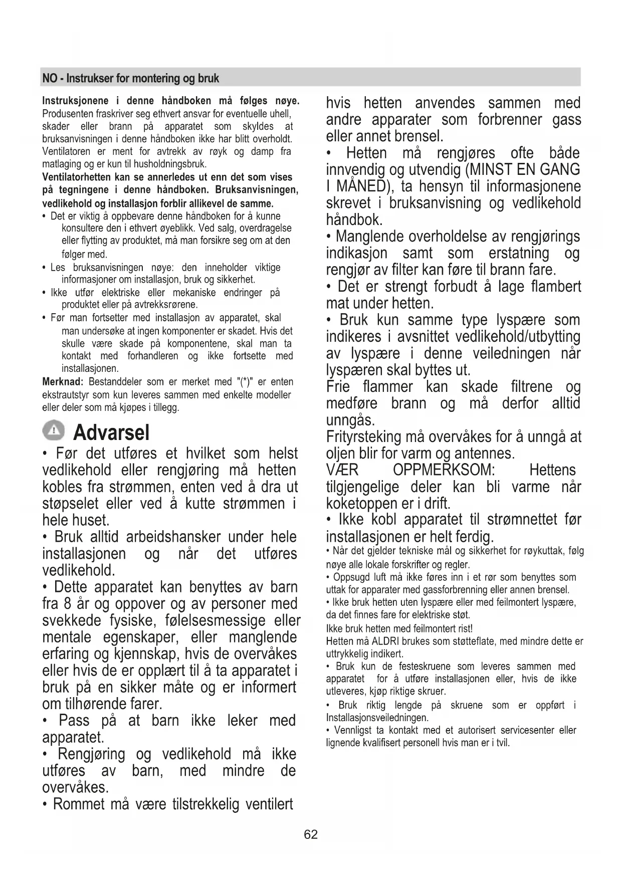 - Ikke bruk hetten uten lyspære eller med feilmontert lyspære, da det finnes fare for elektriske støt. Ikke bruk hetten med feilmontert rist! Hetten må ALDRI brukes som støtteflate, med mindre dette er uttrykkelig indikert.