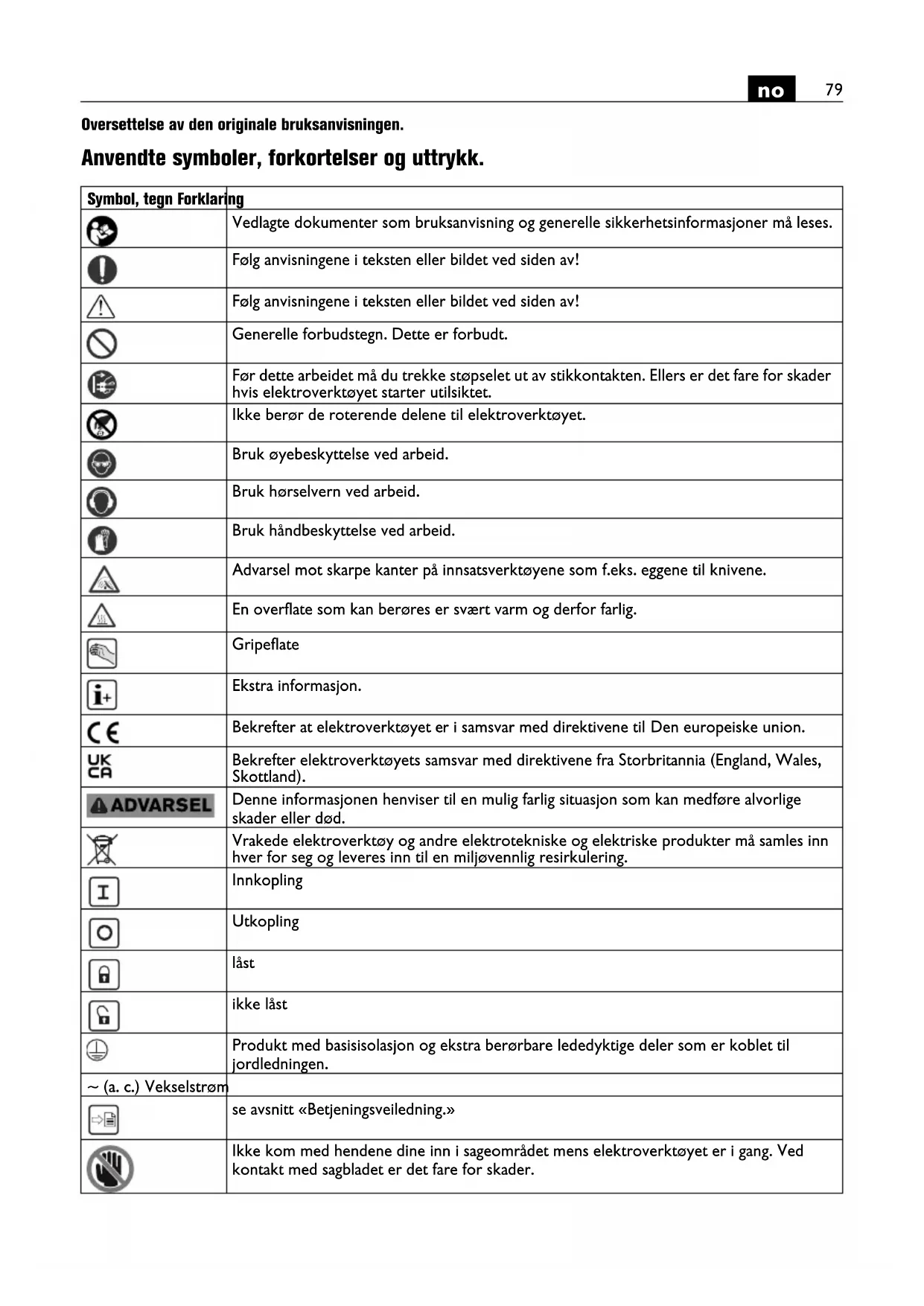 Oversettelse av den originale bruksanvisningen. Anvendte symboler, forkortelser og uttrykk. Symbol, tegn Forklaring Vedlagte dokumenter som bruksanvisning og generelle sikkerhetsinformasjoner må leses. Følg anvisningene i teksten eller bildet ved siden av! Følg anvisningene i teksten eller bildet ved siden av! Generelle forbudstegn. Dette er forbudt. Før dette arbeidet må du trekke støpselet ut av stikkontakten. Ellers er det fare for skader hvis elektroverktøyet starter utilsiktet. Ikke berør de roterende delene til elektroverktøyet. Bruk øyebeskyttelse ved arbeid. Bruk hørselvern ved arbeid. Bruk håndbeskyttelse ved arbeid. Advarsel mot skarpe kanter på innsatsverktøyene som f.eks. eggene til knivene. En overflate som kan berøres er svært varm og derfor farlig. Gripeflate Ekstra informasjon. Bekrefter at elektroverktøyet er i samsvar med direktivene til Den europeiske union. Bekrefter elektroverktøyets samsvar med direktivene fra Storbritannia (England, Wales, Skottland). Denne informasjonen henviser til en mulig farlig situasjon som kan medføre alvorlige skader eller død. Vrakede elektroverktøy og andre elektrotekniske og elektriske produkter må samles inn hver for seg og leveres inn til en miljøvennlig resirkulering. Innkopling Utkopling låst ikke låst Produkt med basisisolasjon og ekstra berørbare lededyktige deler som er koblet til jordledningen. ~ (a. c.) Vekselstrøm se avsnitt «Betjeningsveiledning.» Ikke kom med hendene dine inn i sageområdet mens elektroverktøyet er i gang. Ved kontakt med sagbladet er det fare for skader.80