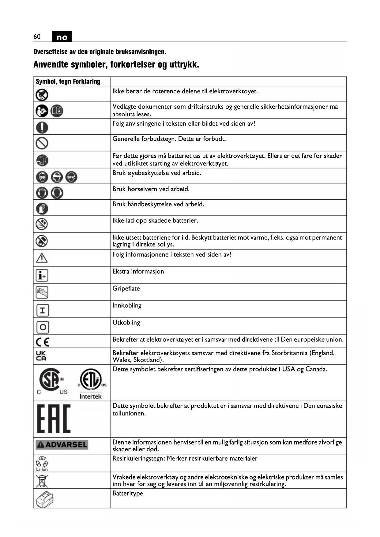 Oversettelse av den originale bruksanvisningen. Anvendte symboler, forkortelser og uttrykk. Symbol, tegn Forklaring Ikke berør de roterende delene til elektroverktøyet. Vedlagte dokumenter som driftsinstruks og generelle sikkerhetsinformasjoner må absolutt leses. Følg anvisningene i teksten eller bildet ved siden av! Generelle forbudstegn. Dette er forbudt. Før dette gjøres må batteriet tas ut av elektroverktøyet. Ellers er det fare for skader ved utilsiktet starting av elektroverktøyet. Bruk øyebeskyttelse ved arbeid. Bruk hørselvern ved arbeid. Bruk håndbeskyttelse ved arbeid. Ikke lad opp skadede batterier. Ikke utsett batteriene for ild. Beskytt batteriet mot varme, f.eks. også mot permanent lagring i direkte sollys. Følg informasjonene i teksten ved siden av! Ekstra informasjon. Gripeflate Innkobling Utkobling Bekrefter at elektroverktøyet er i samsvar med direktivene til Den europeiske union. Bekrefter elektroverktøyets samsvar med direktivene fra Storbritannia (England, Wales, Skottland). Dette symbolet bekrefter sertifiseringen av dette produktet i USA og Canada. Dette symbolet bekrefter at produktet er i samsvar med direktivene i Den eurasiske tollunionen. Denne informasjonen henviser til en mulig farlig situasjon som kan medføre alvorlige skader eller død. Resirkuleringstegn: Merker resirkulerbare materialer Vrakede elektroverktøy og andre elektrotekniske og elektriske produkter må samles inn hver for seg og leveres inn til en miljøvennlig resirkulering. Batteritype61