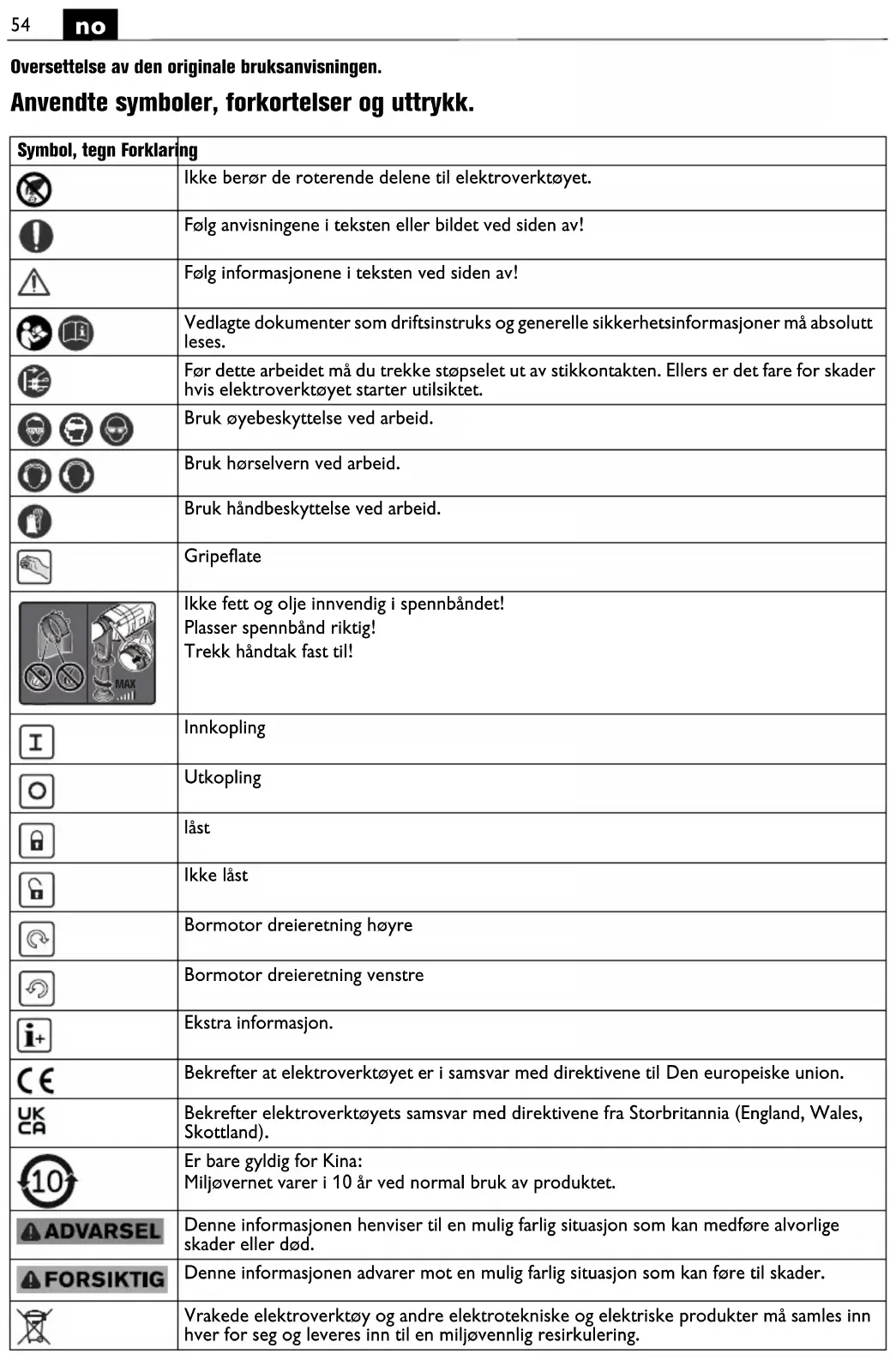 Oversettelse av den originale bruksanvisningen. Anvendte symboler, forkortelser og uttrykk. Symbol, tegn Forklaring Ikke berør de roterende delene til elektroverktøyet. Følg anvisningene i teksten eller bildet ved siden av! Følg informasjonene i teksten ved siden av! Vedlagte dokumenter som driftsinstruks og generelle sikkerhetsinformasjoner må absolutt leses. Før dette arbeidet må du trekke støpselet ut av stikkontakten. Ellers er det fare for skader hvis elektroverktøyet starter utilsiktet. Bruk øyebeskyttelse ved arbeid. Bruk hørselvern ved arbeid. Bruk håndbeskyttelse ved arbeid. Gripeflate Ikke fett og olje innvendig i spennbåndet! Plasser spennbånd riktig! Trekk håndtak fast til! Innkopling Utkopling låst Ikke låst Bormotor dreieretning høyre Bormotor dreieretning venstre Ekstra informasjon. Bekrefter at elektroverktøyet er i samsvar med direktivene til Den europeiske union. Bekrefter elektroverktøyets samsvar med direktivene fra Storbritannia (England, Wales, Skottland). Er bare gyldig for Kina: Miljøvernet varer i 10 år ved normal bruk av produktet. Denne informasjonen henviser til en mulig farlig situasjon som kan medføre alvorlige skader eller død. Denne informasjonen advarer mot en mulig farlig situasjon som kan føre til skader. Vrakede elektroverktøy og andre elektrotekniske og elektriske produkter må samles inn hver for seg og leveres inn til en miljøvennlig resirkulering. MAX55