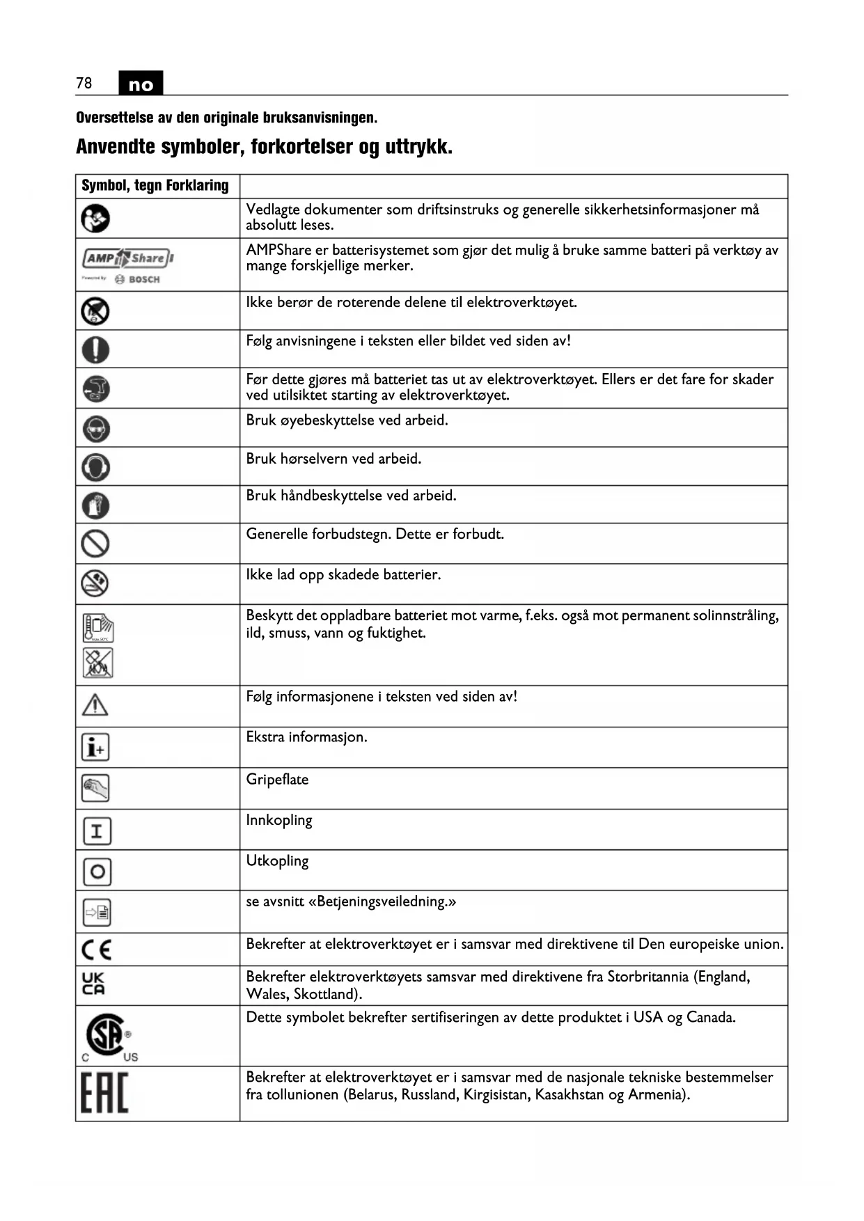 Oversettelse av den originale bruksanvisningen. Anvendte symboler, forkortelser og uttrykk. Symbol, tegn Forklaring Vedlagte dokumenter som driftsinstruks og generelle sikkerhetsinformasjoner må absolutt leses. AMPShare er batterisystemet som gjør det mulig å bruke samme batteri på verktøy av mange forskjellige merker. Ikke berør de roterende delene til elektroverktøyet. Følg anvisningene i teksten eller bildet ved siden av! Før dette gjøres må batteriet tas ut av elektroverktøyet. Ellers er det fare for skader ved utilsiktet starting av elektroverktøyet. Bruk øyebeskyttelse ved arbeid. Bruk hørselvern ved arbeid. Bruk håndbeskyttelse ved arbeid. Generelle forbudstegn. Dette er forbudt. Ikke lad opp skadede batterier. Beskytt det oppladbare batteriet mot varme, f.eks. også mot permanent solinnstråling, ild, smuss, vann og fuktighet. Følg informasjonene i teksten ved siden av! Ekstra informasjon. Gripeflate Innkopling Utkopling se avsnitt «Betjeningsveiledning.» Bekrefter at elektroverktøyet er i samsvar med direktivene til Den europeiske union. Bekrefter elektroverktøyets samsvar med direktivene fra Storbritannia (England, Wales, Skottland). Dette symbolet bekrefter sertifiseringen av dette produktet i USA og Canada. Bekrefter at elektroverktøyet er i samsvar med de nasjonale tekniske bestemmelser fra tollunionen (Belarus, Russland, Kirgisistan, Kasakhstan og Armenia). max.50°C79