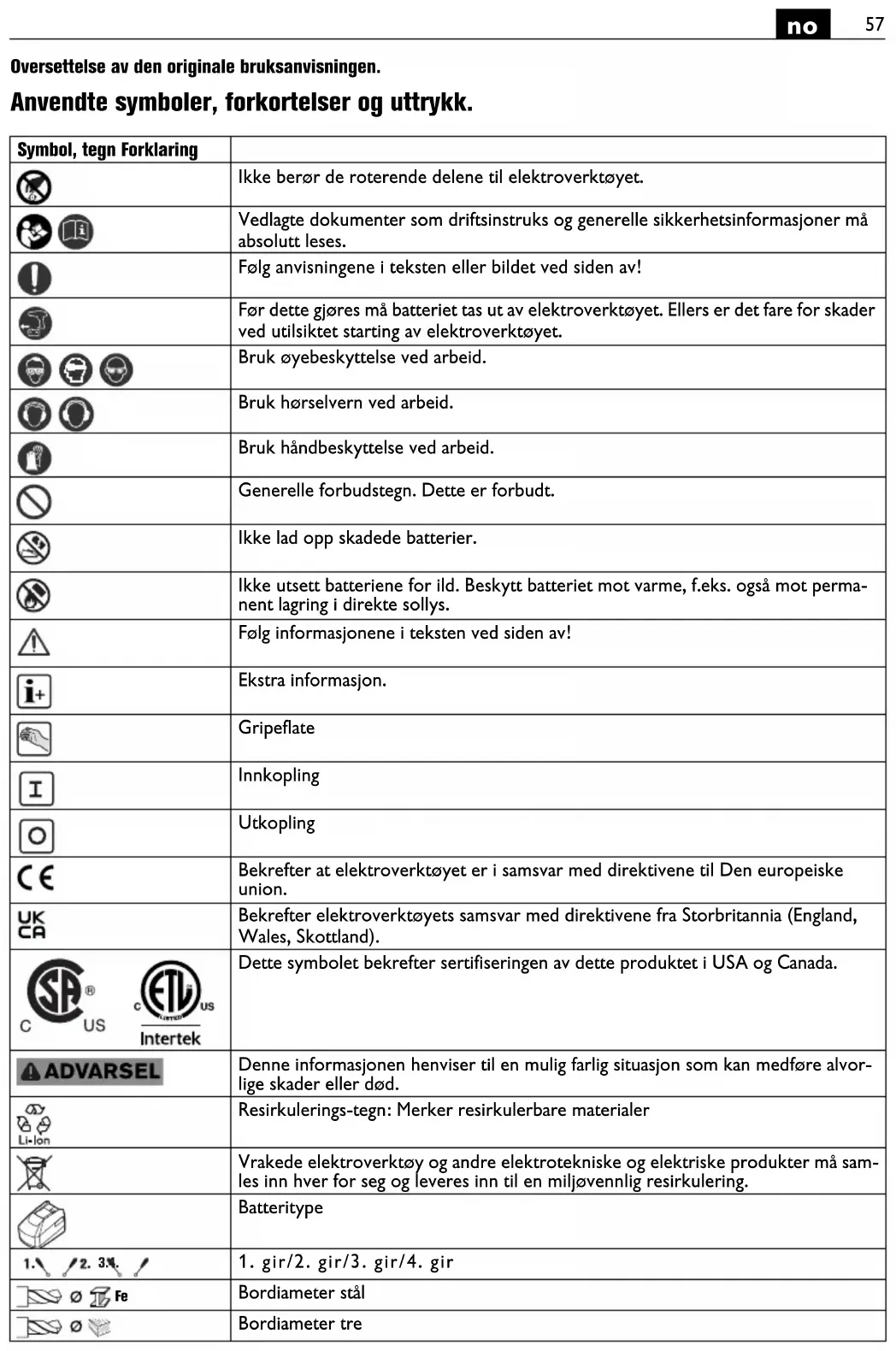Oversettelse av den originale bruksanvisningen. Anvendte symboler, forkortelser og uttrykk. Symbol, tegn Forklaring Ikke berør de roterende delene til elektroverktøyet. Vedlagte dokumenter som driftsinstruks og generelle sikkerhetsinformasjoner må absolutt leses. Følg anvisningene i teksten eller bildet ved siden av! Før dette gjøres må batteriet tas ut av elektroverktøyet. Ellers er det fare for skader ved utilsiktet starting av elektroverktøyet. Bruk øyebeskyttelse ved arbeid. Bruk hørselvern ved arbeid. Bruk håndbeskyttelse ved arbeid. Generelle forbudstegn. Dette er forbudt. Ikke lad opp skadede batterier. Ikke utsett batteriene for ild. Beskytt batteriet mot varme, f.eks. også mot perma- nent lagring i direkte sollys. Følg informasjonene i teksten ved siden av! Ekstra informasjon. Gripeflate Innkopling Utkopling Bekrefter at elektroverktøyet er i samsvar med direktivene til Den europeiske union. Bekrefter elektroverktøyets samsvar med direktivene fra Storbritannia (England, Wales, Skottland). Dette symbolet bekrefter sertifiseringen av dette produktet i USA og Canada. Denne informasjonen henviser til en mulig farlig situasjon som kan medføre alvor- lige skader eller død. Resirkulerings-tegn: Merker resirkulerbare materialer Vrakede elektroverktøy og andre elektrotekniske og elektriske produkter må sam- les inn hver for seg og leveres inn til en miljøvennlig resirkulering. Batteritype
