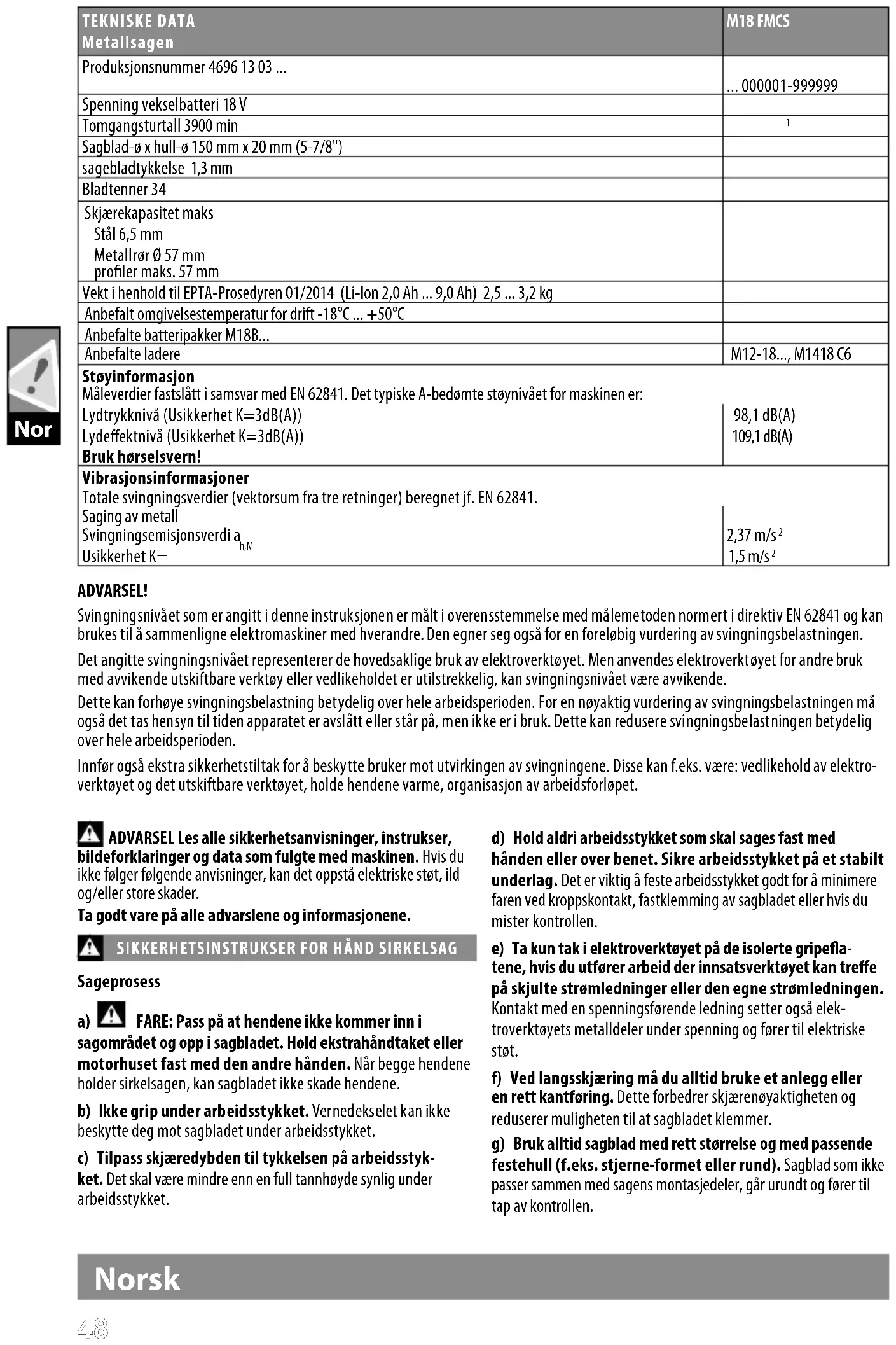 Sagblad-ø x hull-ø 150 mm x 20 mm (5-7/8") sagebladtykkelse 1,3 mm Bladtenner 34 Skjærekapasitet maks Stål 6,5 mm Metallrør Ø 57 mm proler maks. 57 mm Vekt i henhold til EPTA-Prosedyren 01/2014 (Li-Ion 2,0 Ah ... 9,0 Ah) 2,5 ... 3,2 kg Anbefalt omgivelsestemperatur for drift -18°C ... +50°C Anbefalte batteripakker M18B... Anbefalte ladere M12-18..., M1418 C6 Støyinformasjon Måleverdier fastslått i samsvar med EN 62841. Det typiske A-bedømte støynivået for maskinen er: Lydtrykknivå (Usikkerhet K=3dB(A)) 98,1 dB(A) Lydeektnivå (Usikkerhet K=3dB(A)) 109,1 dB(A) Bruk hørselsvern! Vibrasjonsinformasjoner Totale svingningsverdier (vektorsum fra tre retninger) beregnet jf. EN 62841. Saging av metall Svingningsemisjonsverdi a h,M 2,37 m/s