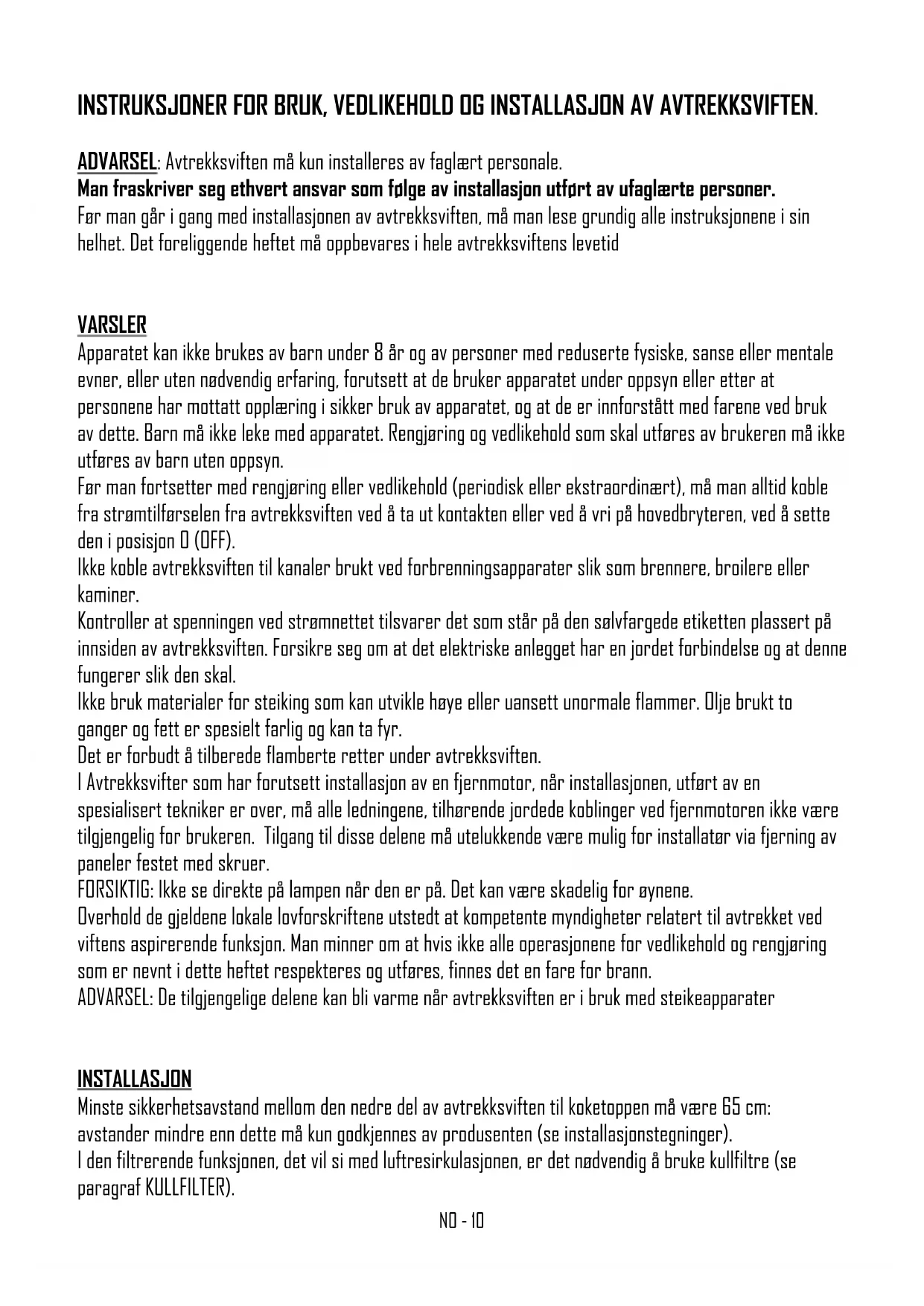 VARSLER Apparatet kan ikke brukes av barn under 8 år og av personer med reduserte fysiske, sanse eller mentale evner, eller uten nødvendig erfaring, forutsett at de bruker apparatet under oppsyn eller etter at personene har mottatt opplæring i sikker bruk av apparatet, og at de er innforstått med farene ved bruk av dette. Barn må ikke leke med apparatet. Rengjøring og vedlikehold som skal utføres av brukeren må ikke utføres av barn uten oppsyn. Før man fortsetter med rengjøring eller vedlikehold (periodisk eller ekstraordinært), må man alltid koble fra strømtilførselen fra avtrekksviften ved å ta ut kontakten eller ved å vri på hovedbryteren, ved å sette den i posisjon 0 (OFF). Ikke koble avtrekksviften til kanaler brukt ved forbrenningsapparater slik som brennere, broilere eller kaminer. Kontroller at spenningen ved strømnettet tilsvarer det som står på den sølvfargede etiketten plassert på innsiden av avtrekksviften. Forsikre seg om at det elektriske anlegget har en jordet forbindelse og at denne fungerer slik den skal. Ikke bruk materialer for steiking som kan utvikle høye eller uansett unormale flammer. Olje brukt to ganger og fett er spesielt farlig og kan ta fyr. Det er forbudt å tilberede flamberte retter under avtrekksviften. I Avtrekksvifter som har forutsett installasjon av en fjernmotor, når installasjonen, utført av en spesialisert tekniker er over, må alle ledningene, tilhørende jordede koblinger ved fjernmotoren ikke være tilgjengelig for brukeren. Tilgang til disse delene må utelukkende være mulig for installatør via fjerning av paneler festet med skruer. FORSIKTIG: Ikke se direkte på lampen når den er på. Det kan være skadelig for øynene. Overhold de gjeldene lokale lovforskriftene utstedt at kompetente myndigheter relatert til avtrekket ved viftens aspirerende funksjon. Man minner om at hvis ikke alle operasjonene for vedlikehold og rengjøring som er nevnt i dette heftet respekteres og utføres, finnes det en fare for brann. ADVARSEL: De tilgjengelige delene kan bli varme når avtrekksviften er i bruk med steikeapparater