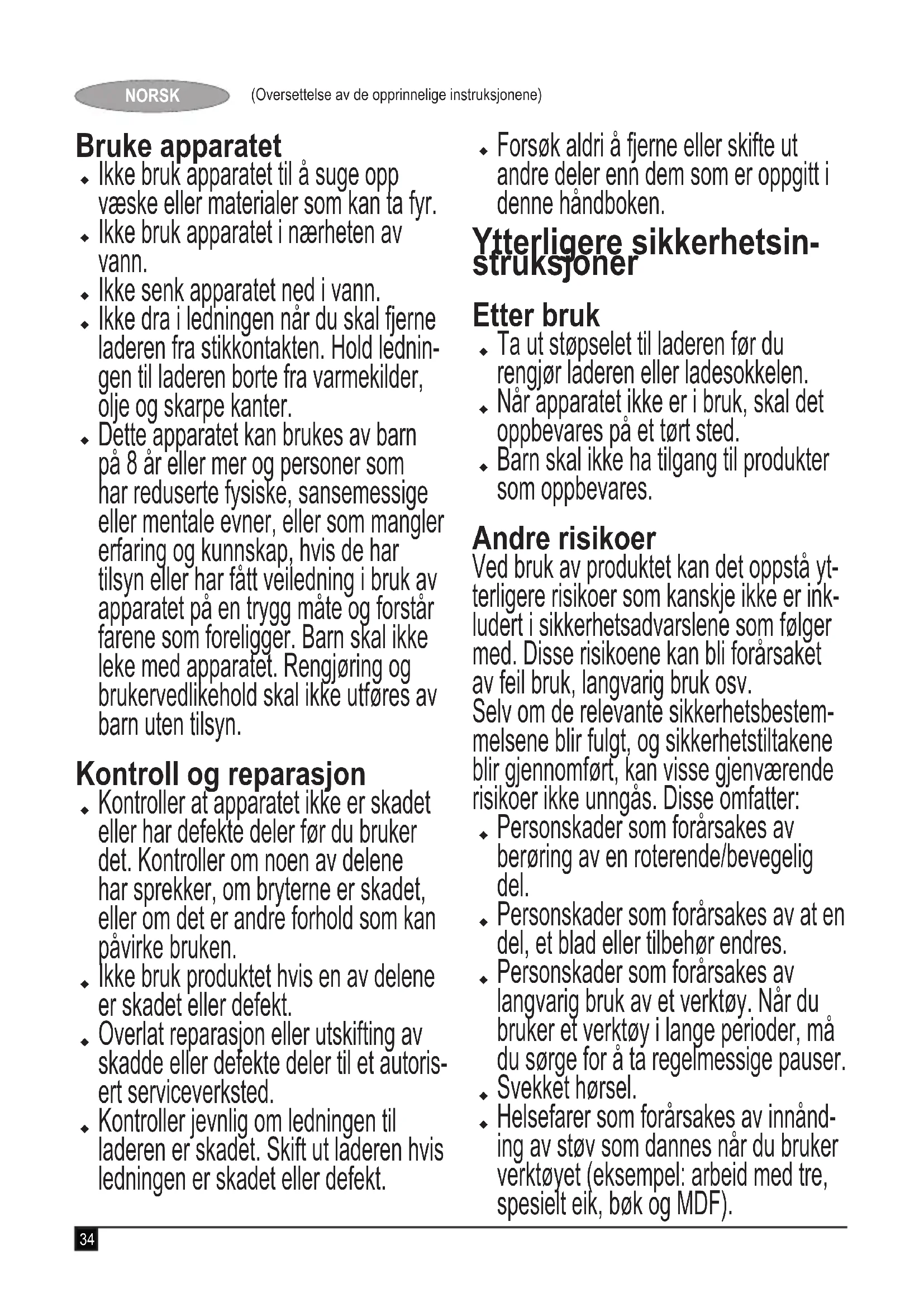 Ta vare på denne håndboken for frem- tidig bruk.34 (Oversettelse av de opprinnelige instruksjonene) NORSK Bruke apparatet Ikke bruk apparatet til å suge opp væske eller materialer som kan ta fyr. Ikke bruk apparatet i nærheten av vann. Ikke senk apparatet ned i vann. Ikke dra i ledningen når du skal fjerne laderen fra stikkontakten. Hold lednin- gen til laderen borte fra varmekilder, olje og skarpe kanter. Dette apparatet kan brukes av barn på 8 år eller mer og personer som har reduserte fysiske, sansemessige eller mentale evner, eller som mangler erfaring og kunnskap, hvis de har tilsyn eller har fått veiledning i bruk av apparatet på en trygg måte og forstår farene som foreligger. Barn skal ikke leke med apparatet. Rengjøring og brukervedlikehold skal ikke utføres av barn uten tilsyn. Kontroll og reparasjon Kontroller at apparatet ikke er skadet eller har defekte deler før du bruker det. Kontroller om noen av delene har sprekker, om bryterne er skadet, eller om det er andre forhold som kan påvirke bruken. Ikke bruk produktet hvis en av delene er skadet eller defekt. Overlat reparasjon eller utskifting av skadde eller defekte deler til et autoris- ert serviceverksted. Kontroller jevnlig om ledningen til laderen er skadet. Skift ut laderen hvis ledningen er skadet eller defekt. Forsøk aldri å fjerne eller skifte ut andre deler enn dem som er oppgitt i denne håndboken. Ytterligere sikkerhetsin- struksjoner Etter bruk Ta ut støpselet til laderen før du rengjør laderen eller ladesokkelen. Når apparatet ikke er i bruk, skal det oppbevares på et tørt sted. Barn skal ikke ha tilgang til produkter som oppbevares. Andre risikoer Ved bruk av produktet kan det oppstå yt- terligere risikoer som kanskje ikke er ink- ludert i sikkerhetsadvarslene som følger med. Disse risikoene kan bli forårsaket av feil bruk, langvarig bruk osv. Selv om de relevante sikkerhetsbestem- melsene blir fulgt, og sikkerhetstiltakene blir gjennomført, kan visse gjenværende risikoer ikke unngås. Disse omfatter: Personskader som forårsakes av berøring av en roterende/bevegelig del. Personskader som forårsakes av at en del, et blad eller tilbehør endres. Personskader som forårsakes av langvarig bruk av et verktøy. Når du bruker et verktøy i lange perioder, må du sørge for å ta regelmessige pauser. Svekket hørsel. Helsefarer som forårsakes av innånd- ing av støv som dannes når du bruker verktøyet (eksempel: arbeid med tre, spesielt eik, bøk og MDF).35 (Oversettelse av de opprinnelige instruksjonene) NORSK Batterier og ladere Batterier